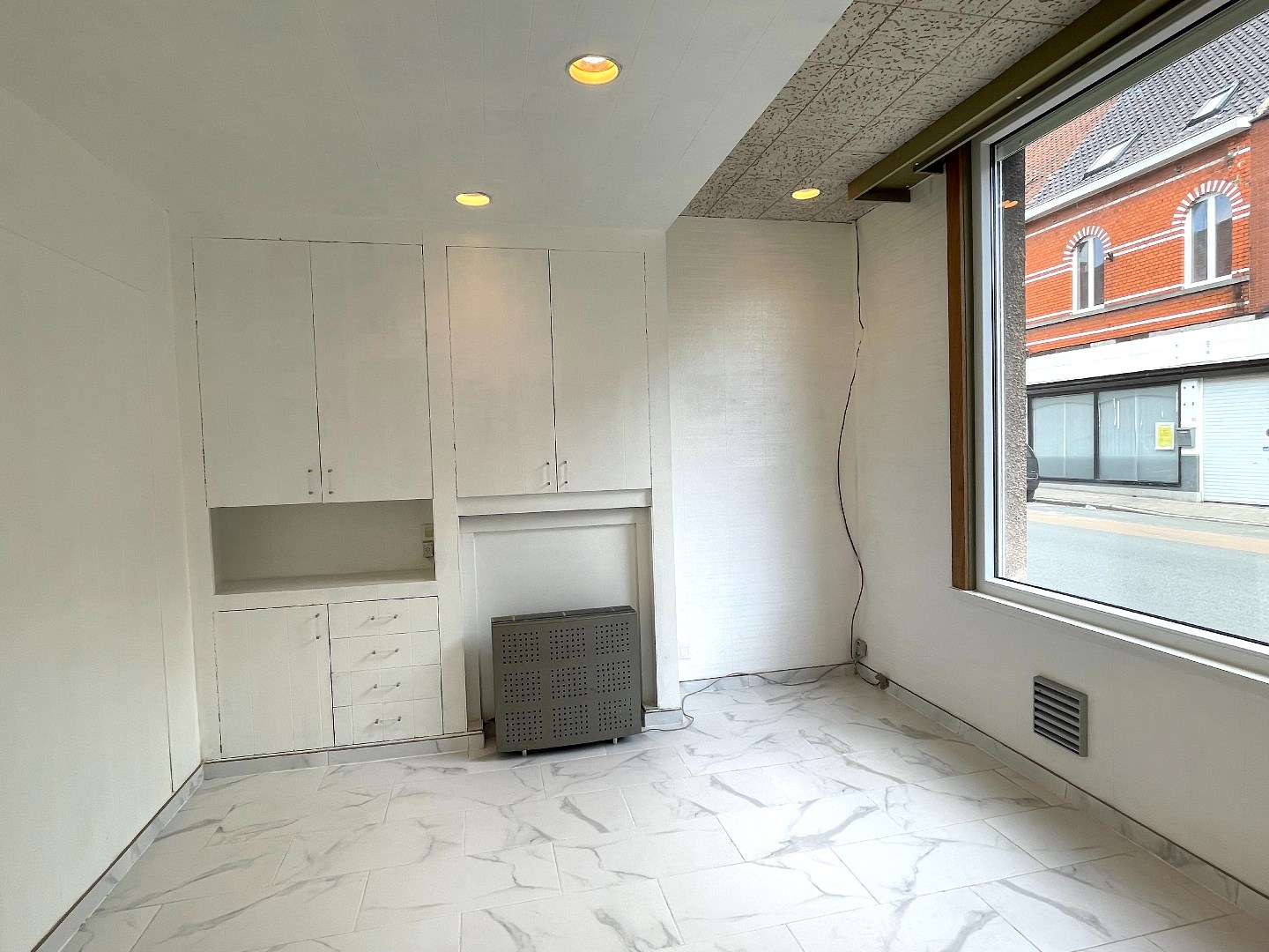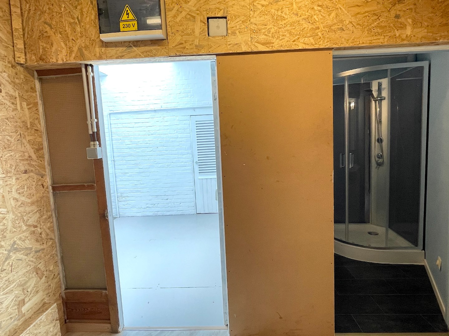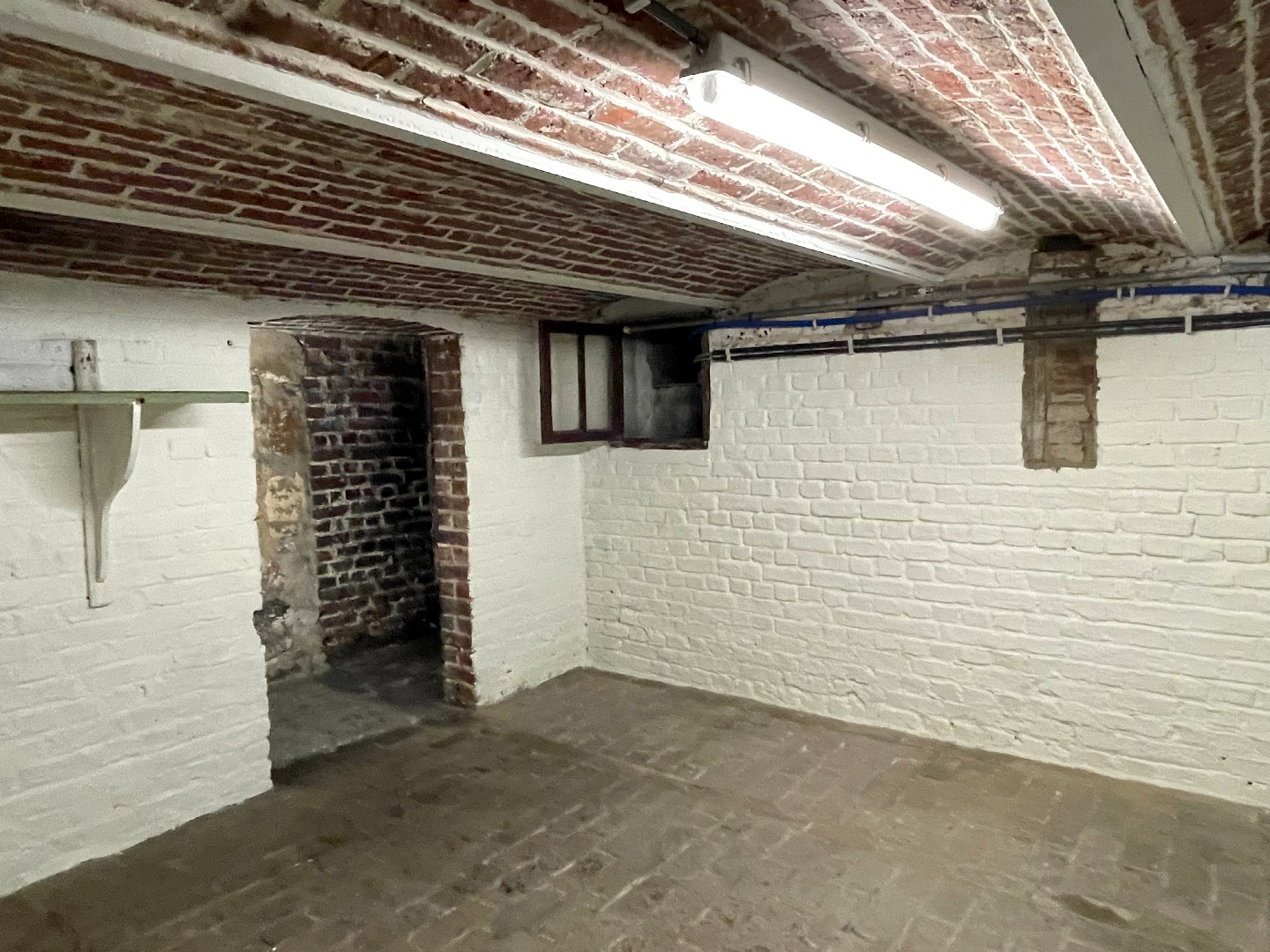 Op het gelijkvloers is er een inkomhal met een kamer langs de voorzijde. Deze kan worden ingericht als salon, buro, …. We gaan de woning verder binnen en komen in de leefruimte met open keuken. Naast de leefruimte is er een overdekte binnenplaats die ons toegang geeft tot een eerste berging, het toilet en een wasberging met daarnaast de badkamer. De badkamer bestaat uit een lavabo en douche.