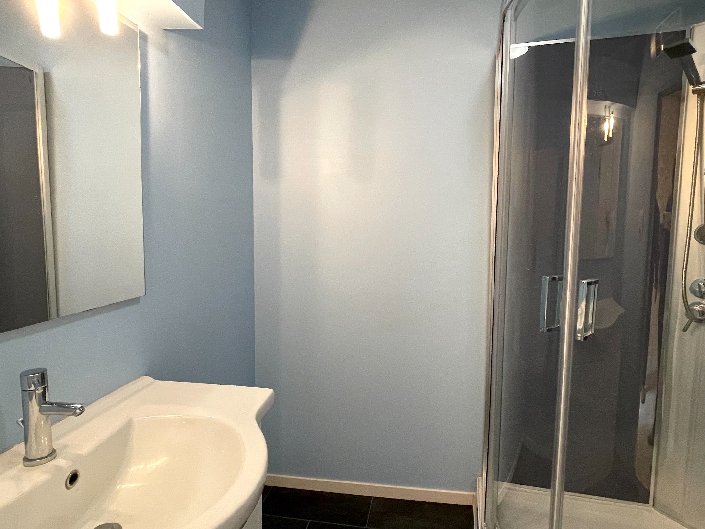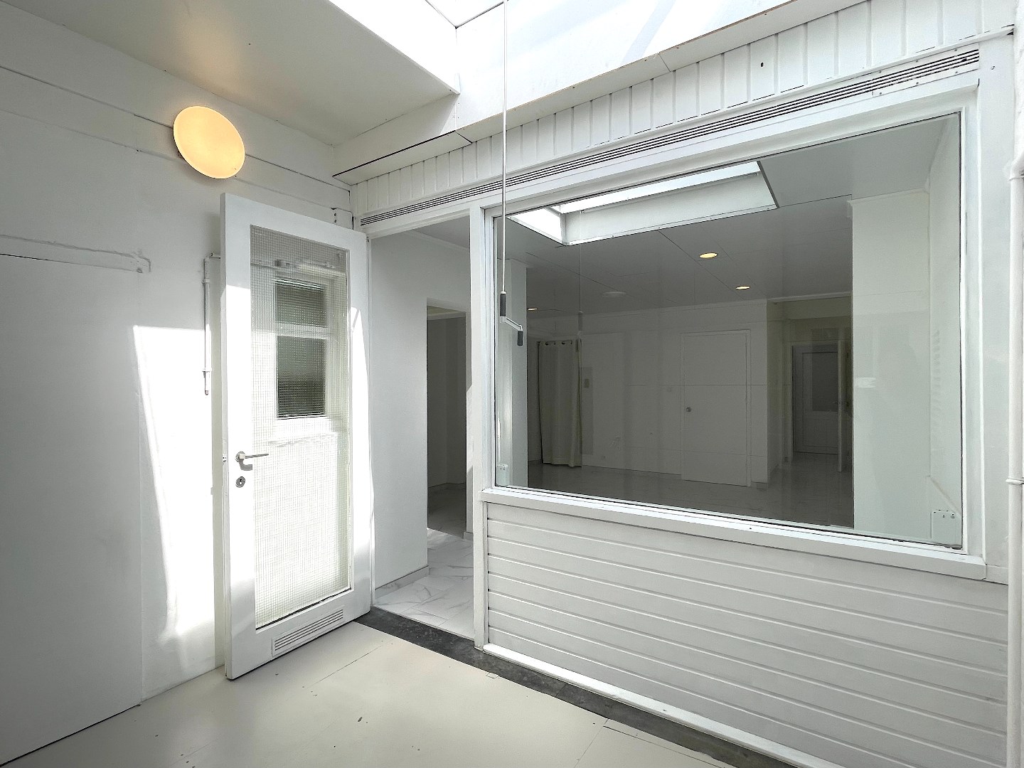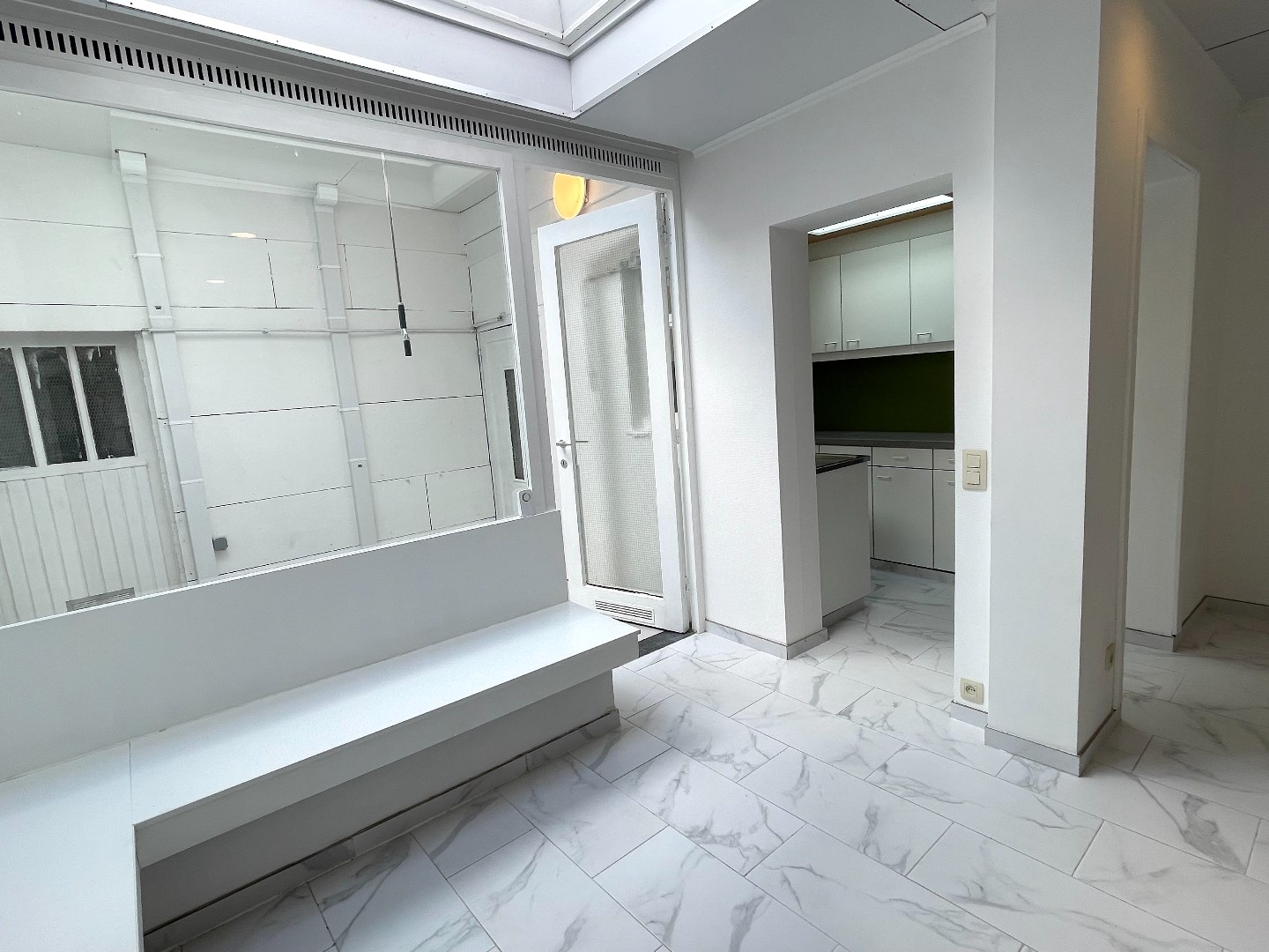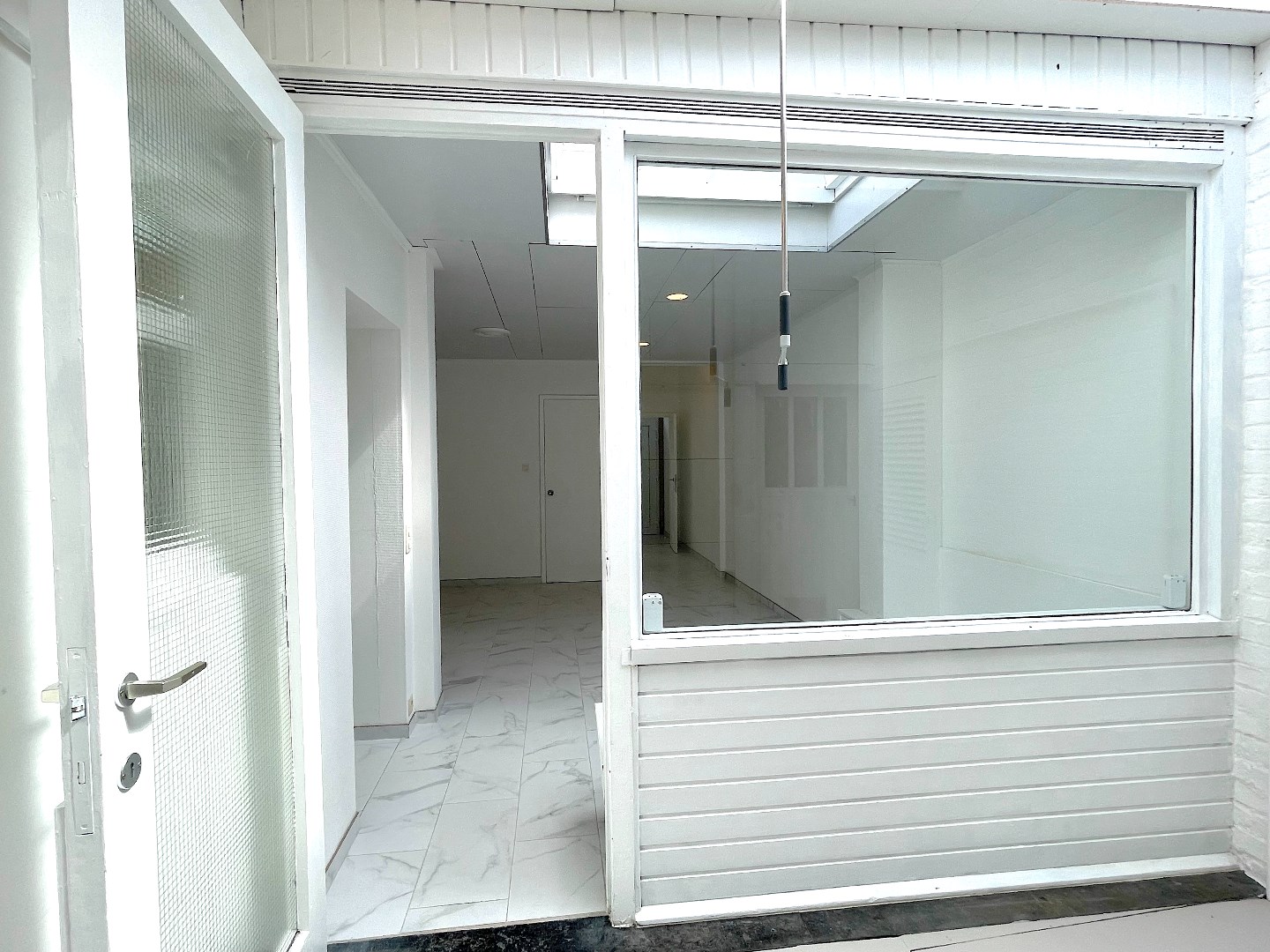 Op het gelijkvloers is er een inkomhal met een kamer langs de voorzijde. Deze kan worden ingericht als salon, buro, …. We gaan de woning verder binnen en komen in de leefruimte met open keuken. Naast de leefruimte is er een overdekte binnenplaats die ons toegang geeft tot een eerste berging, het toilet en een wasberging met daarnaast de badkamer. De badkamer bestaat uit een lavabo en douche.