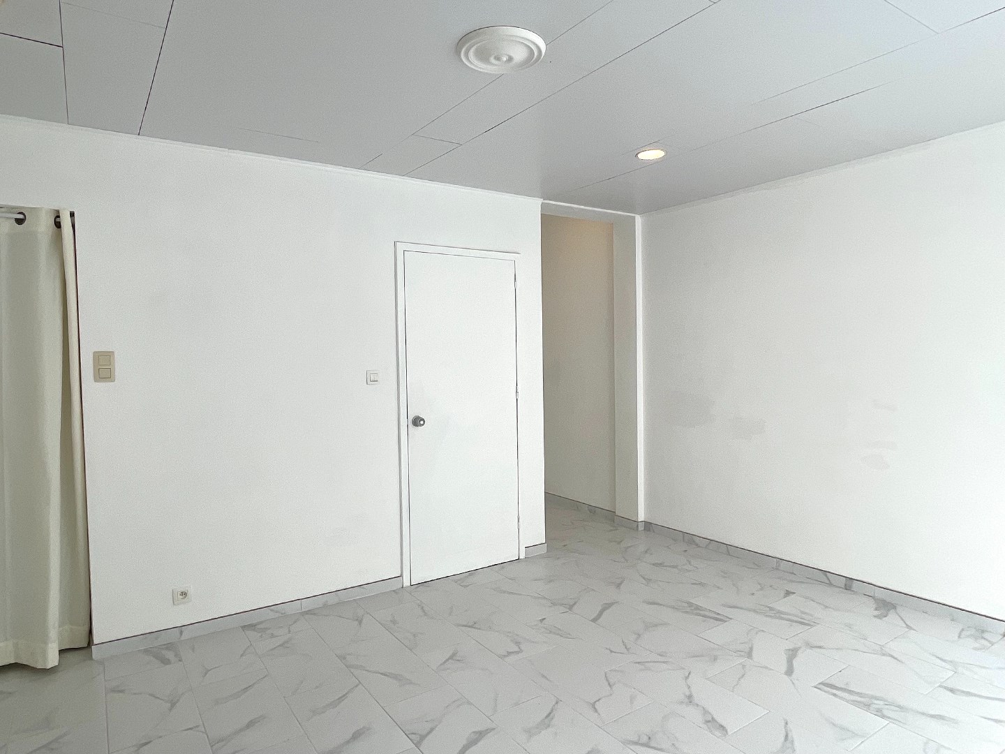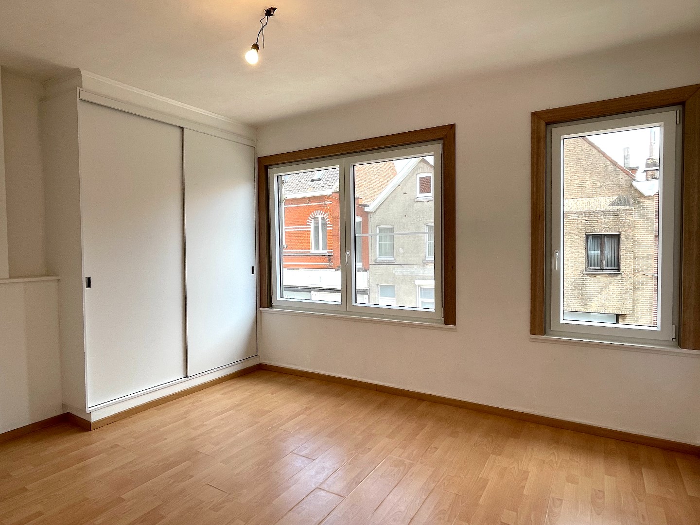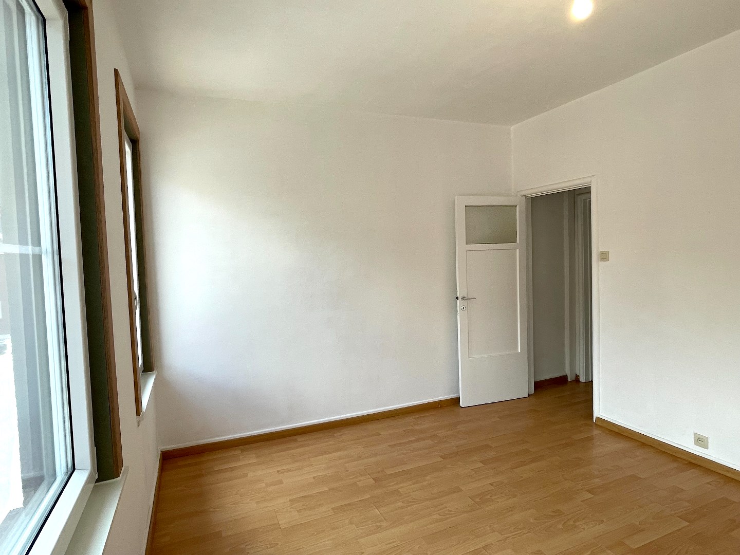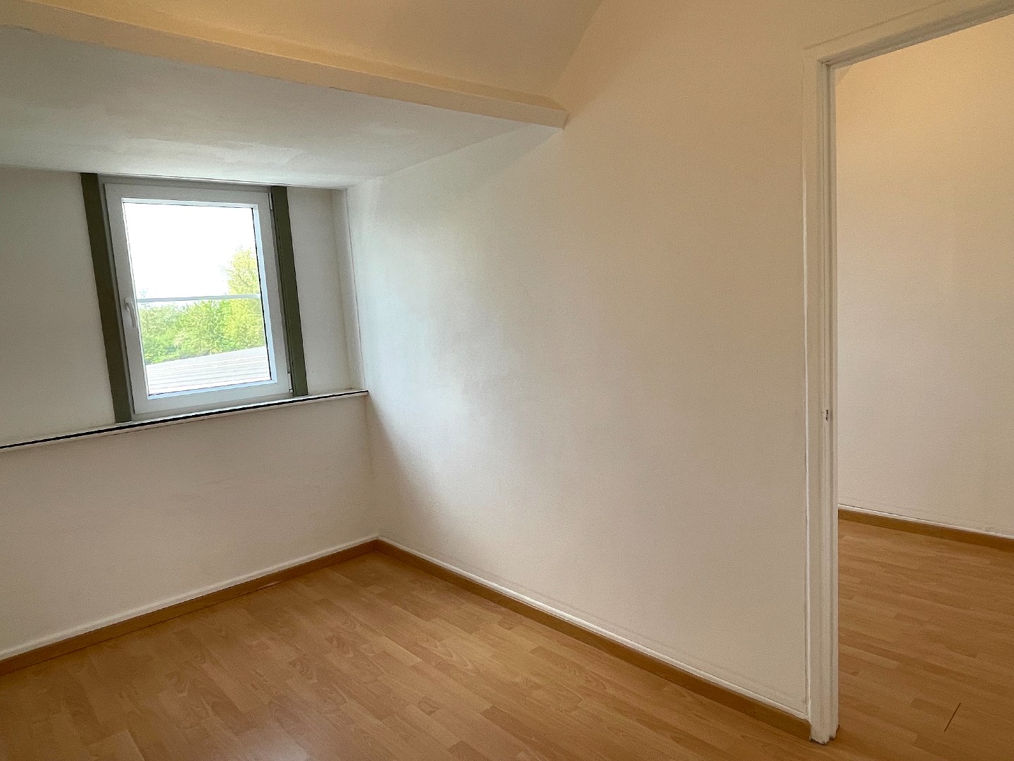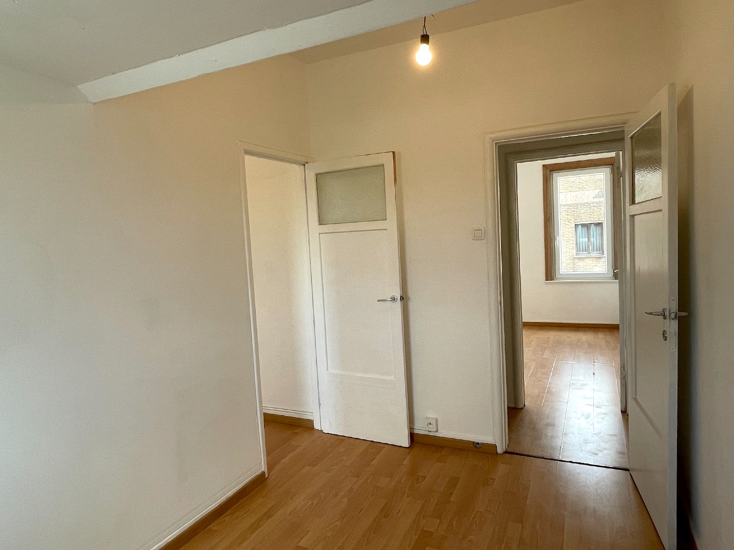 Op de eerste verdieping zijn er 3 slaapkamers waarvan 1 grote en 2 kleine. De grote slaapkamer bevindt langs de voorzijde. Langs de achterzijde moeten we door de eerste kleine slaapkamer om zo in de 2e kleine slaapkamer te komen. Er is hier ook nog een trap naar de zolder.