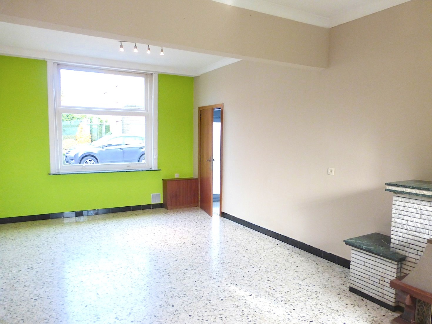 We komen binnen via de hal van waaruit we naar de living of de keuken kunnen. De living strekt zich uit van voor tot achter, waardoor en vele licht binnen komt. Aangrenzend is er een bureelruimte of extra slaapkamer.