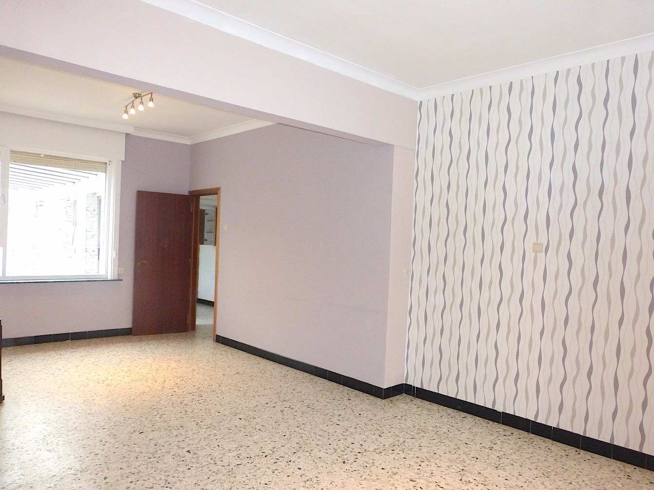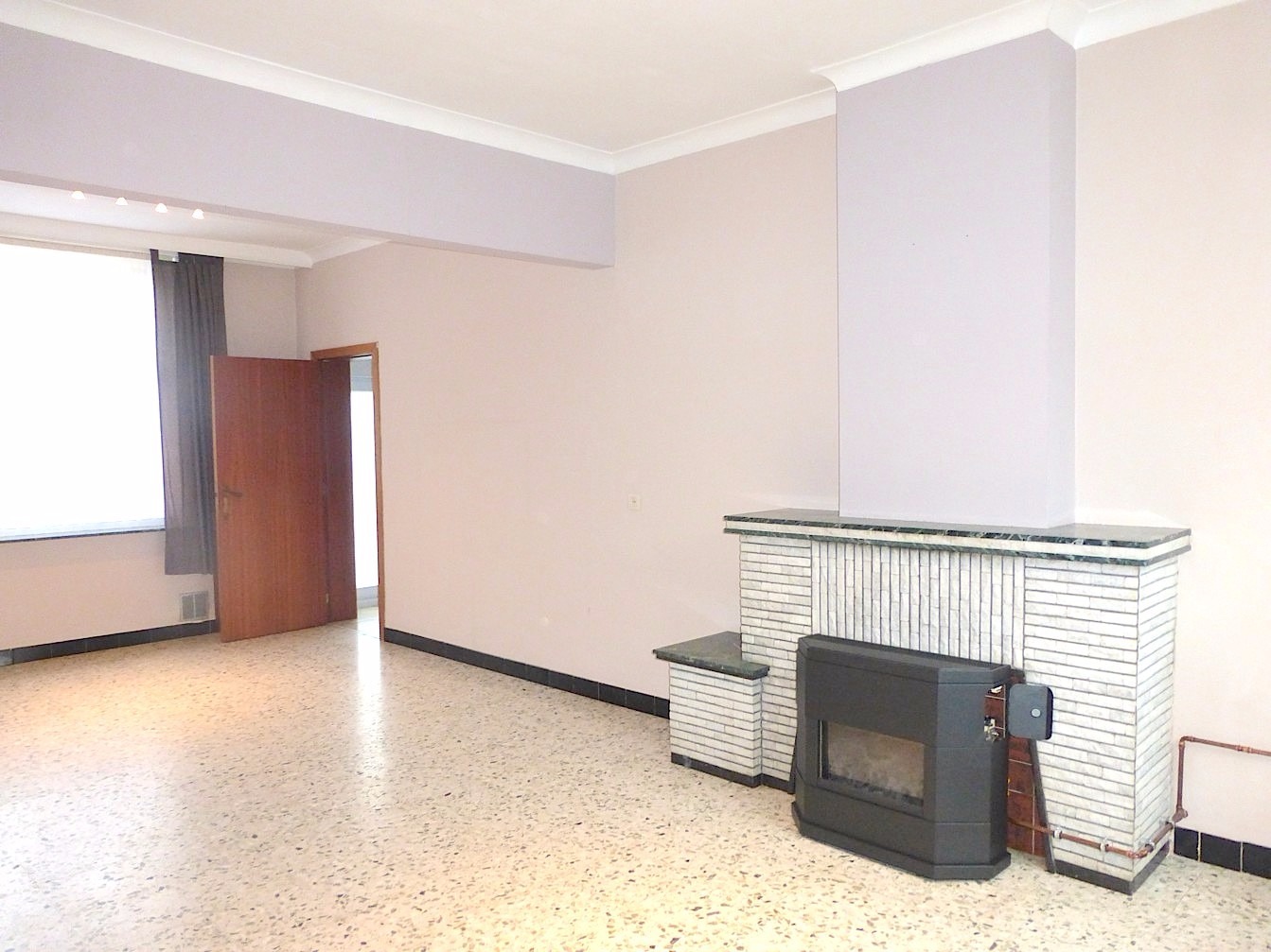 We komen binnen via de hal van waaruit we naar de living of de keuken kunnen. De living strekt zich uit van voor tot achter, waardoor en vele licht binnen komt. Aangrenzend is er een bureelruimte of extra slaapkamer.