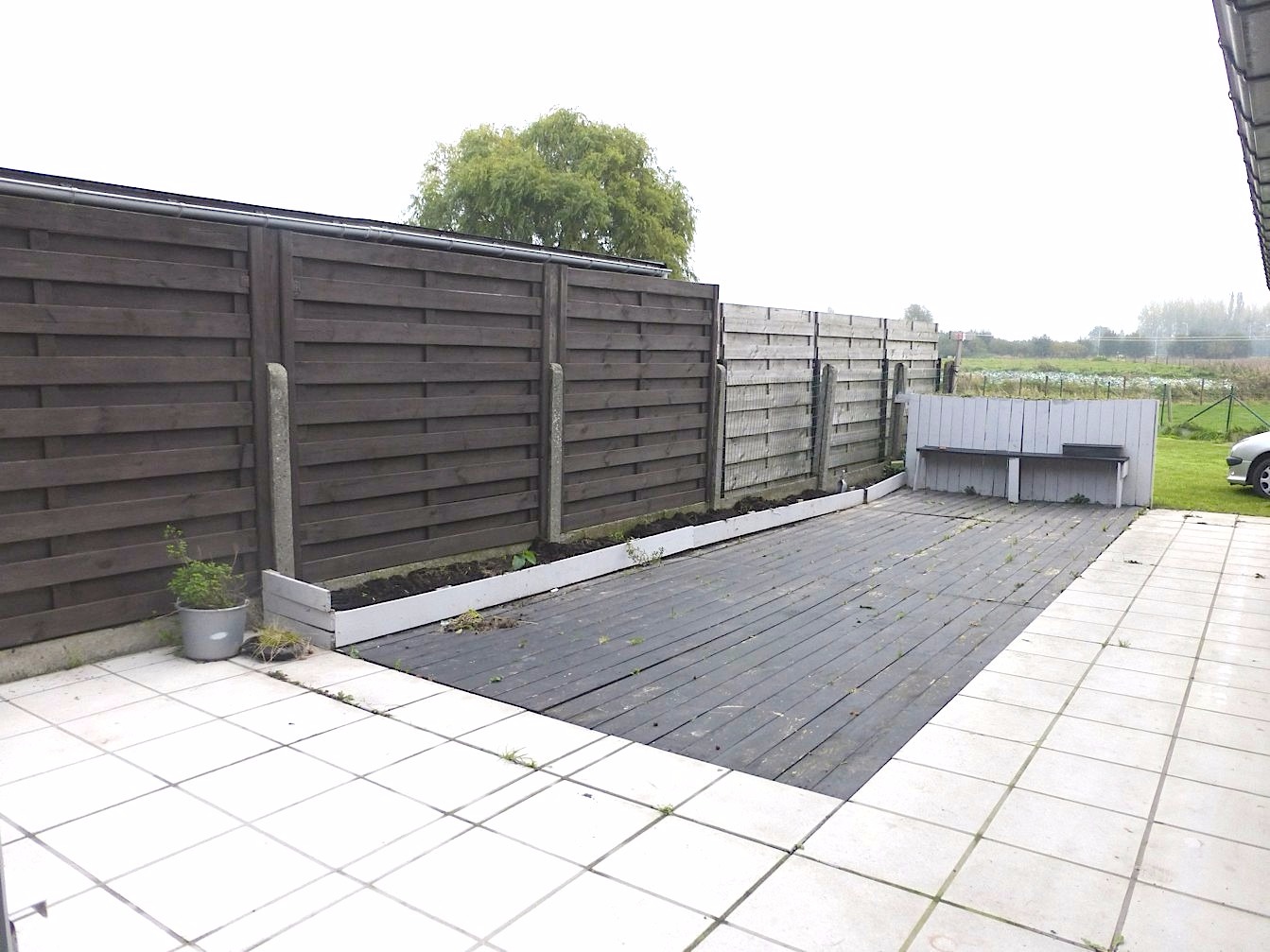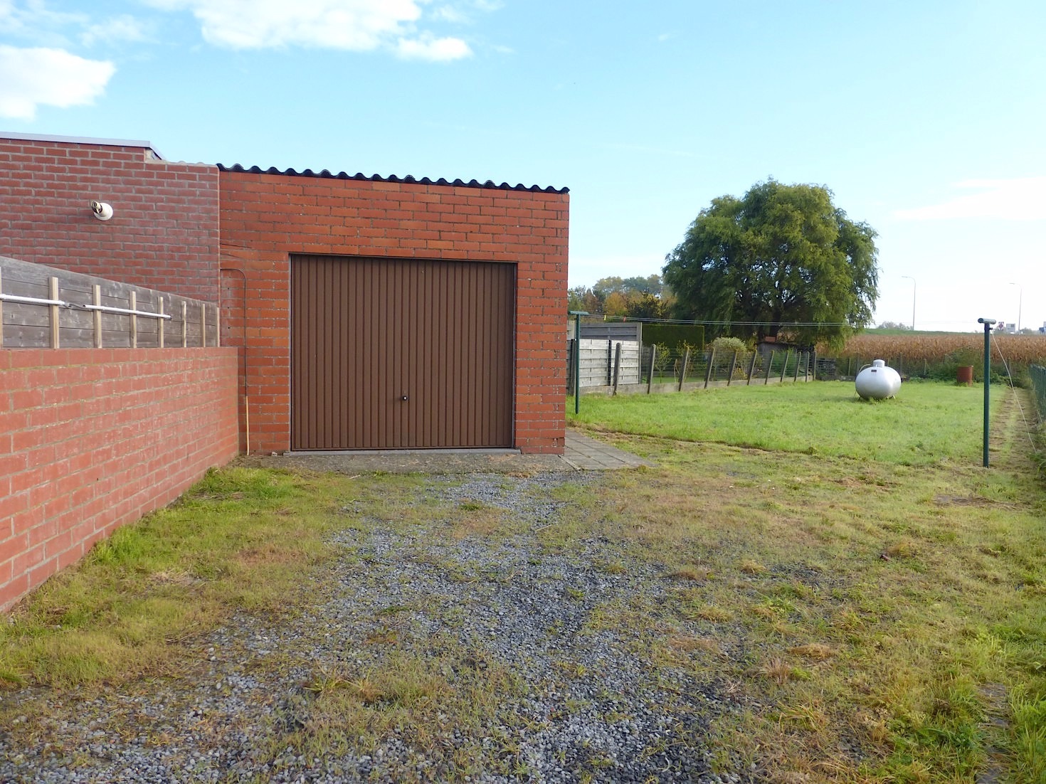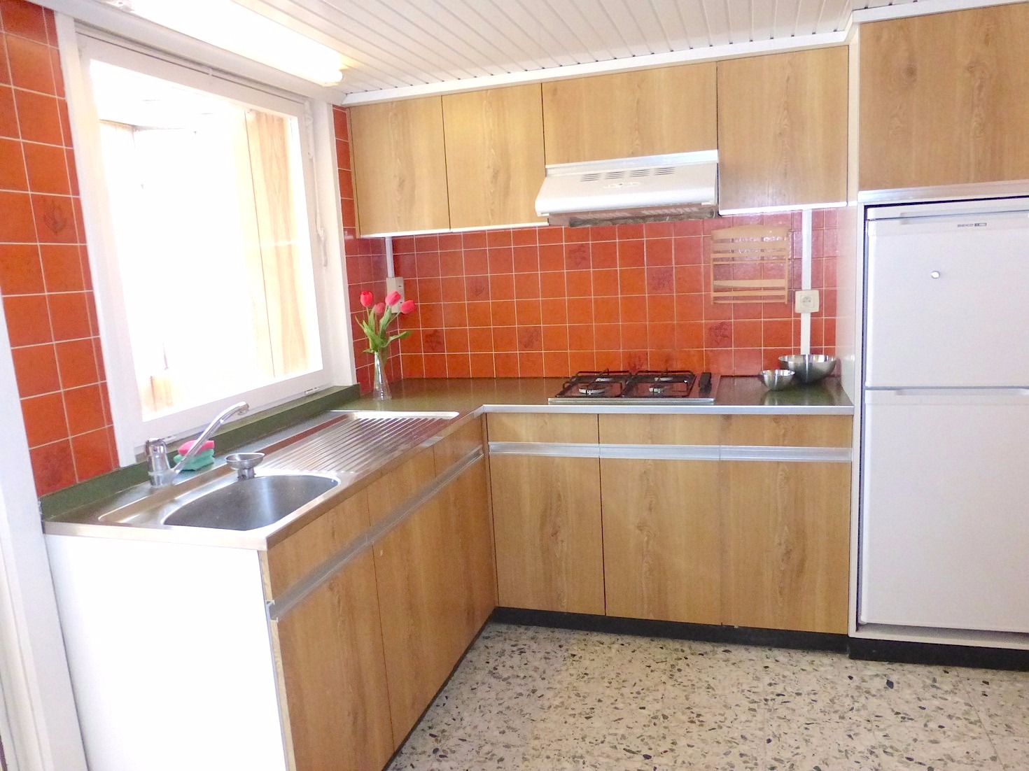 De keuken is eenvoudig ingericht met spoeltafel, ijskast, diepvries, gasvuur en dampkap. Van hieruit kunnen we naar de veranda die mooi aansluit aan het terras met de grote tuin. Van hieruit hebben een een mooi zicht op de weidse omgeving. De tuin is tevens toegankelijk via een aparte garageweg achteraan. Ook de garage is langs hier te te bereiken.