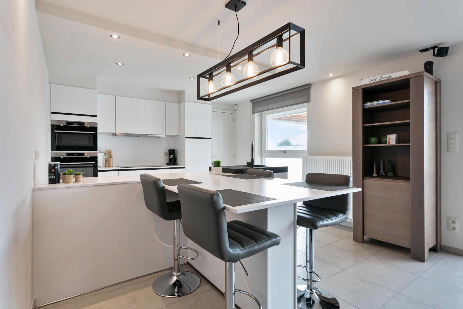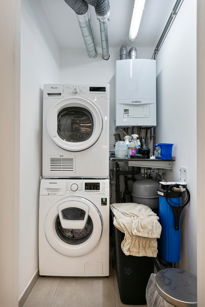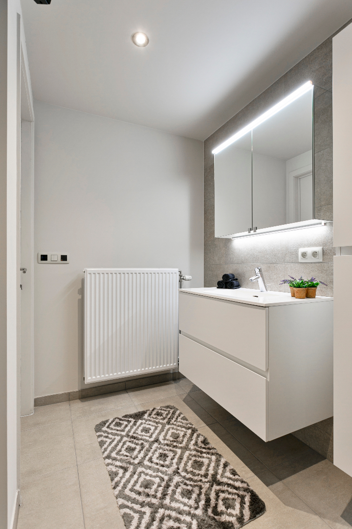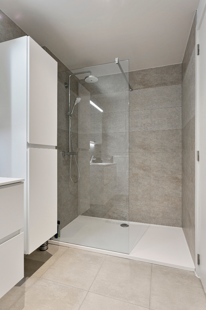 Vanuit de inkomhal hebben we toegang tot de 3 slaapkamers, het aparte toilet, de badkamer of de uiterst lichtrijke leefruimte met open keuken. De leefruimte is echt om de vingers van af te likken. De vele ramen maken het hier zalig genieten. Hier is niets standaard. Alhoewel het om een heel recent appartement gaat, werd de keuken in 2018 volledig vervangen door een prachtige maatkeuken met bijhorend eeteiland. Naast de keuken bevindt zich een handige berging. Vanuit het salon hebben we ook een mooi zicht op het grote terras. Het schuifraam beschikt over zonnescreens. De airco houdt het in zomer heerlijk koel. Op het terras is er een zee aan ruimte. Ook aan de voorzijde van het terras is er nog een extra zonnescreen aanwezig.