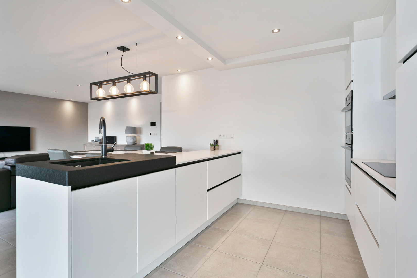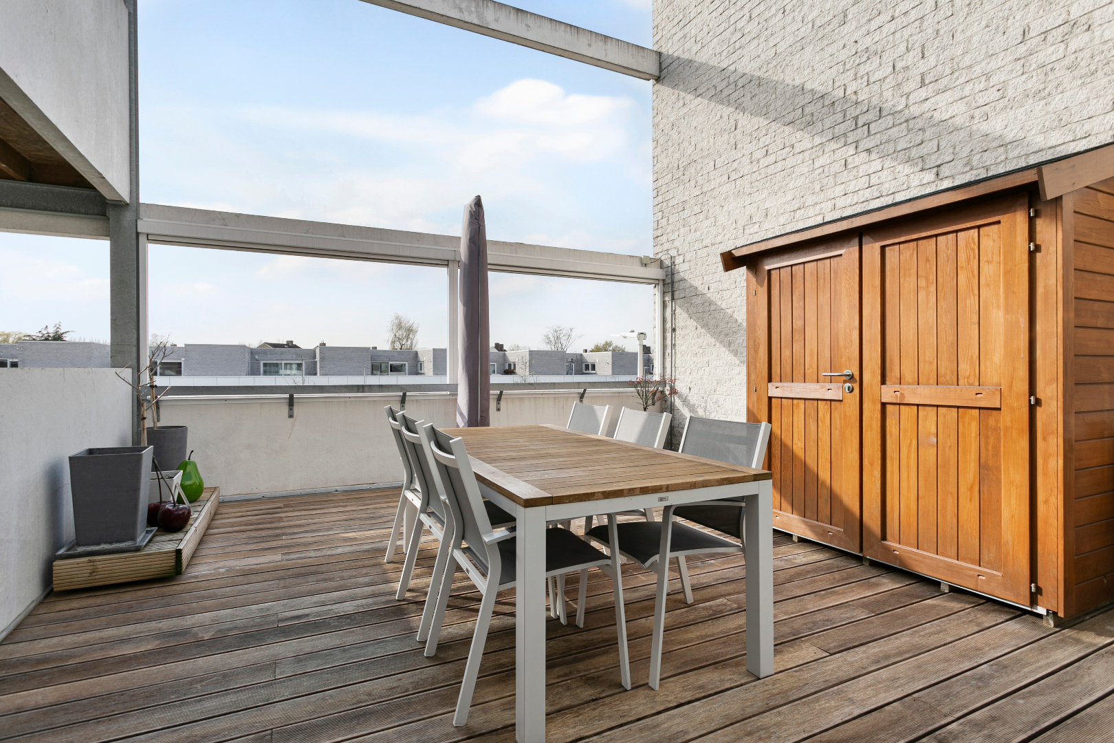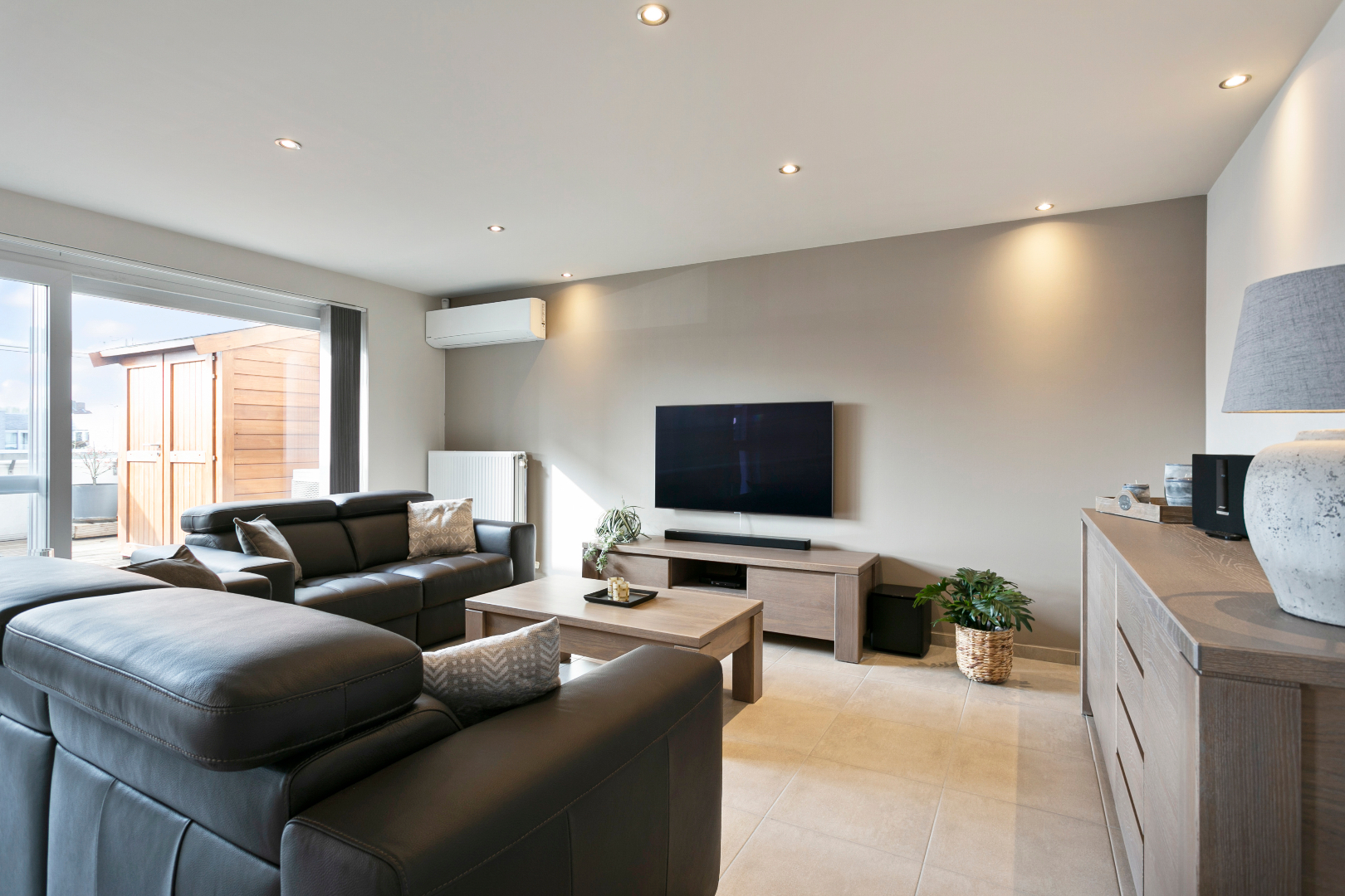 Vanuit de inkomhal hebben we toegang tot de 3 slaapkamers, het aparte toilet, de badkamer of de uiterst lichtrijke leefruimte met open keuken. De leefruimte is echt om de vingers van af te likken. De vele ramen maken het hier zalig genieten. Hier is niets standaard. Alhoewel het om een heel recent appartement gaat, werd de keuken in 2018 volledig vervangen door een prachtige maatkeuken met bijhorend eeteiland. Naast de keuken bevindt zich een handige berging. Vanuit het salon hebben we ook een mooi zicht op het grote terras. Het schuifraam beschikt over zonnescreens. De airco houdt het in zomer heerlijk koel. Op het terras is er een zee aan ruimte. Ook aan de voorzijde van het terras is er nog een extra zonnescreen aanwezig.
