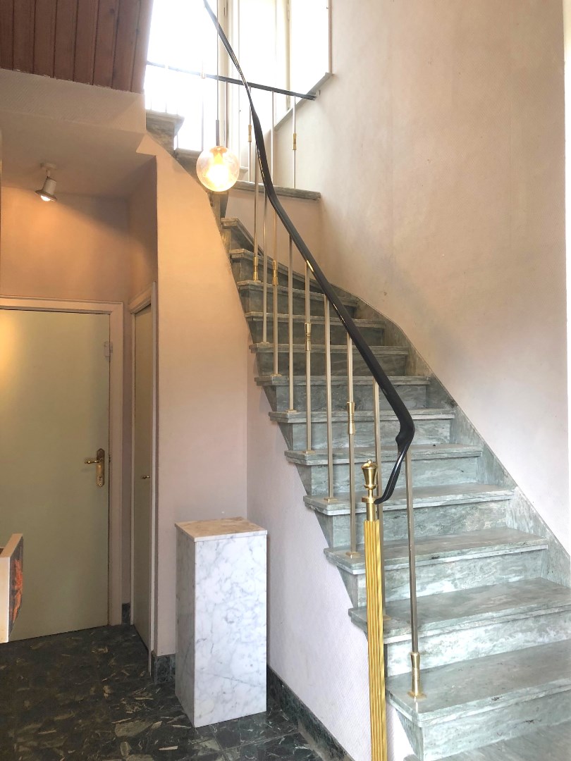 Via de grote oprit komen we binnen in de hal die ons naar de eerste verdieping leidt. Hier vinden we een ruime, aangename living op parket, een ingerichte keuken, toilet en berging.
