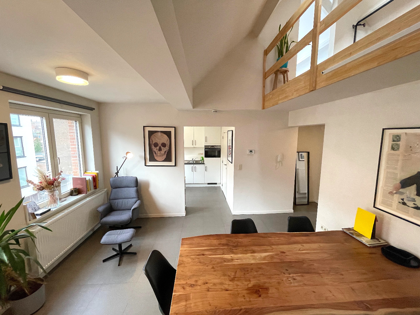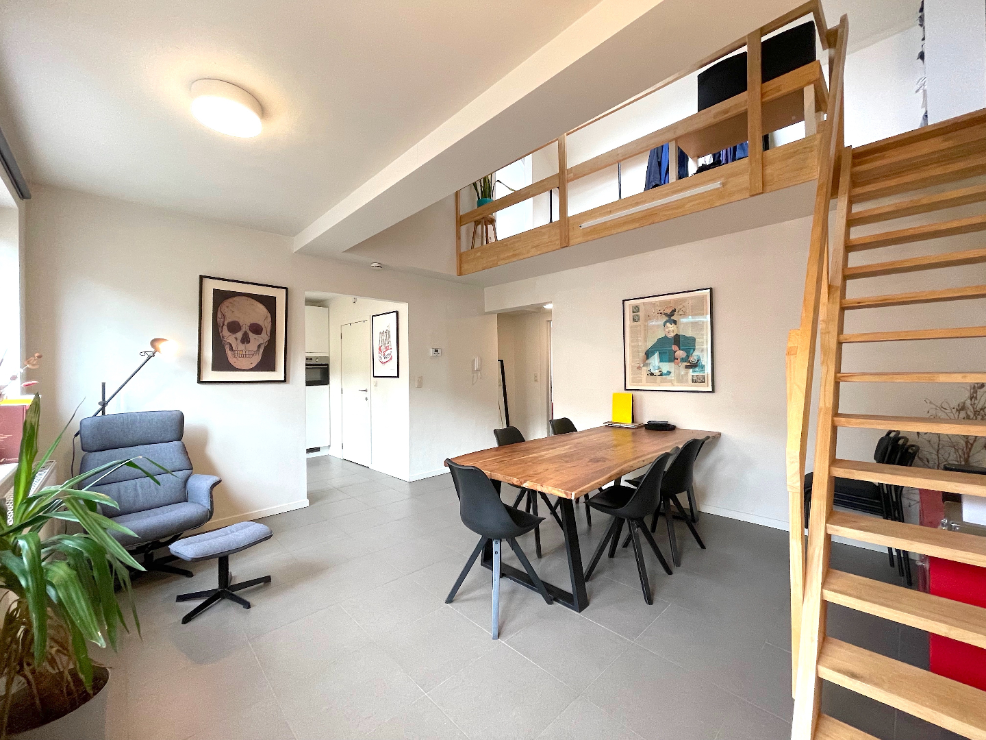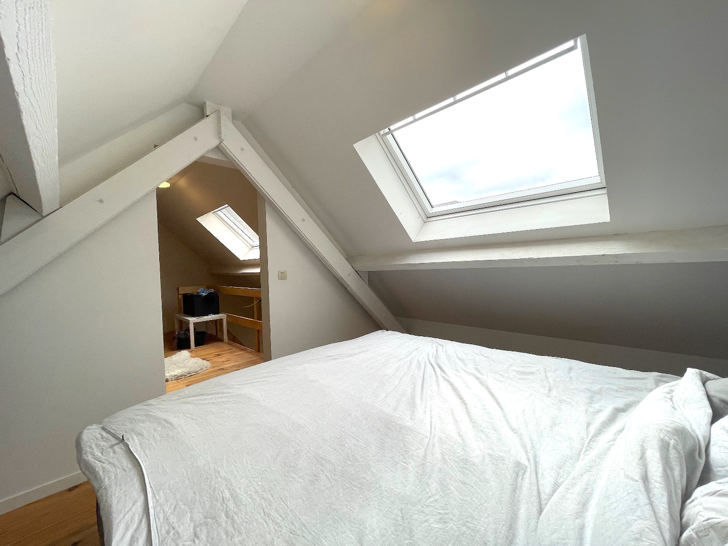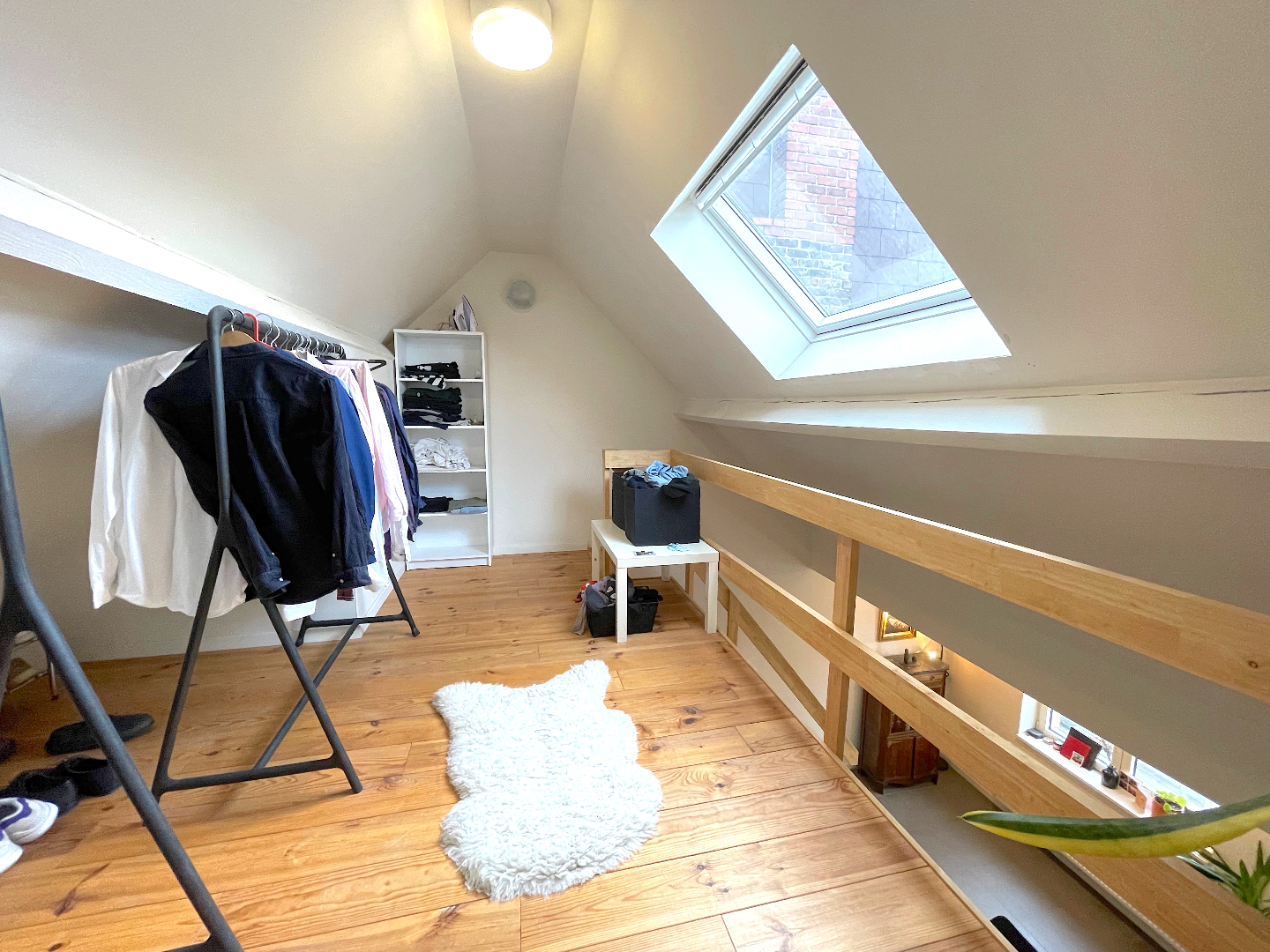 Vanuit de leefruimte kunnen we ook naar de hoger gelegen verdieping. Daar is nog een extra slaapkamer met buro/dressing/ontspanningsruimte.