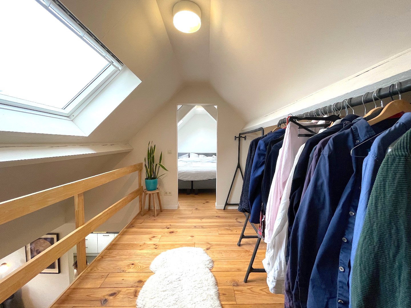Vanuit de leefruimte kunnen we ook naar de hoger gelegen verdieping. Daar is nog een extra slaapkamer met buro/dressing/ontspanningsruimte.