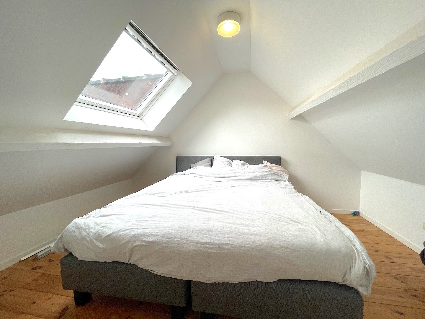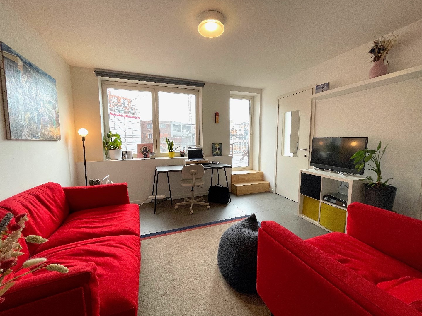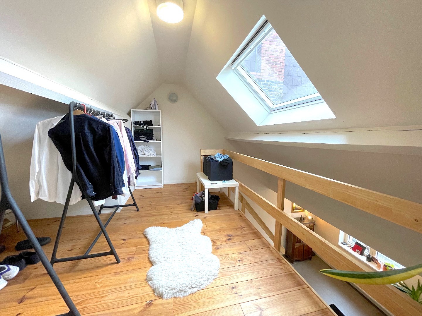 Vanuit de leefruimte kunnen we ook naar de hoger gelegen verdieping. Daar is nog een extra slaapkamer met buro/dressing/ontspanningsruimte.