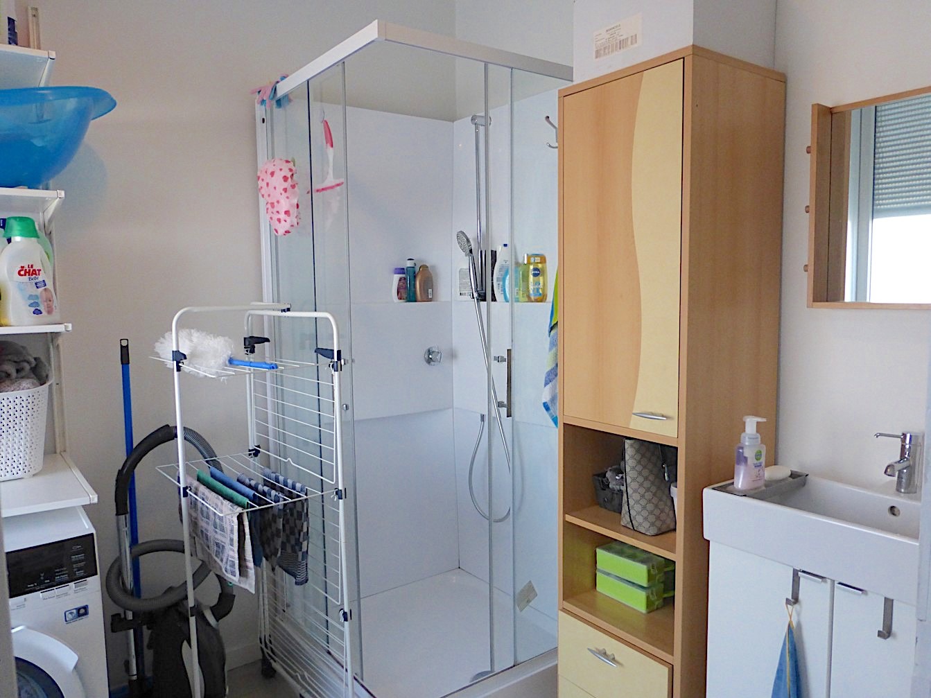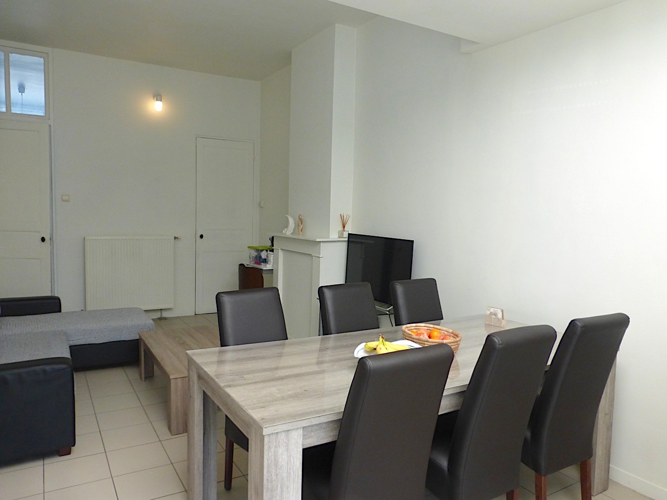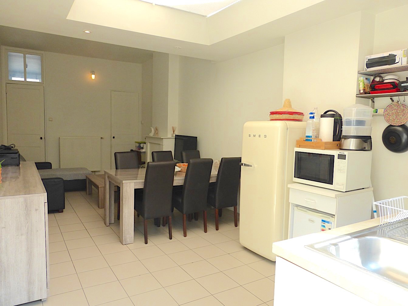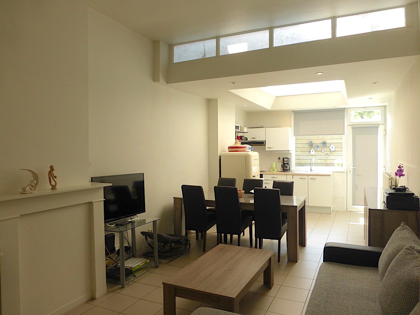 We komen de woning binnen in de hal, waar we vooraan de badkamer terug vinden. Deze is voorzien van een lavabo, toilet en douche. Verder vinden we een gezellige living met open keuken. Van hieruit kunnen we naar het kleine, maar leuke stadstuintje!