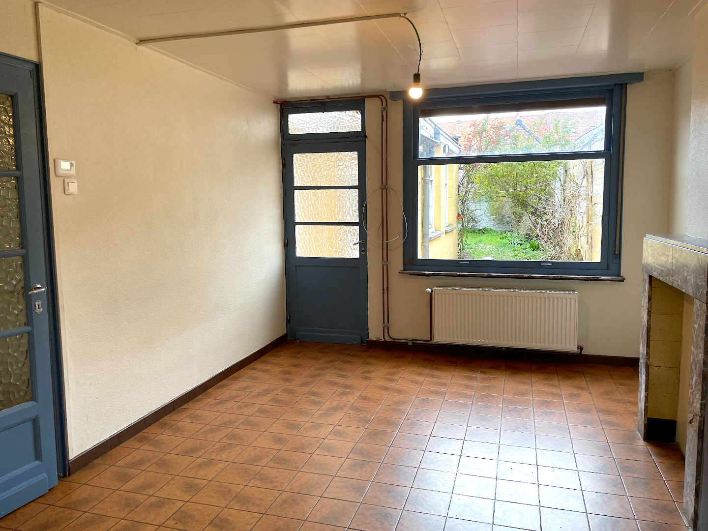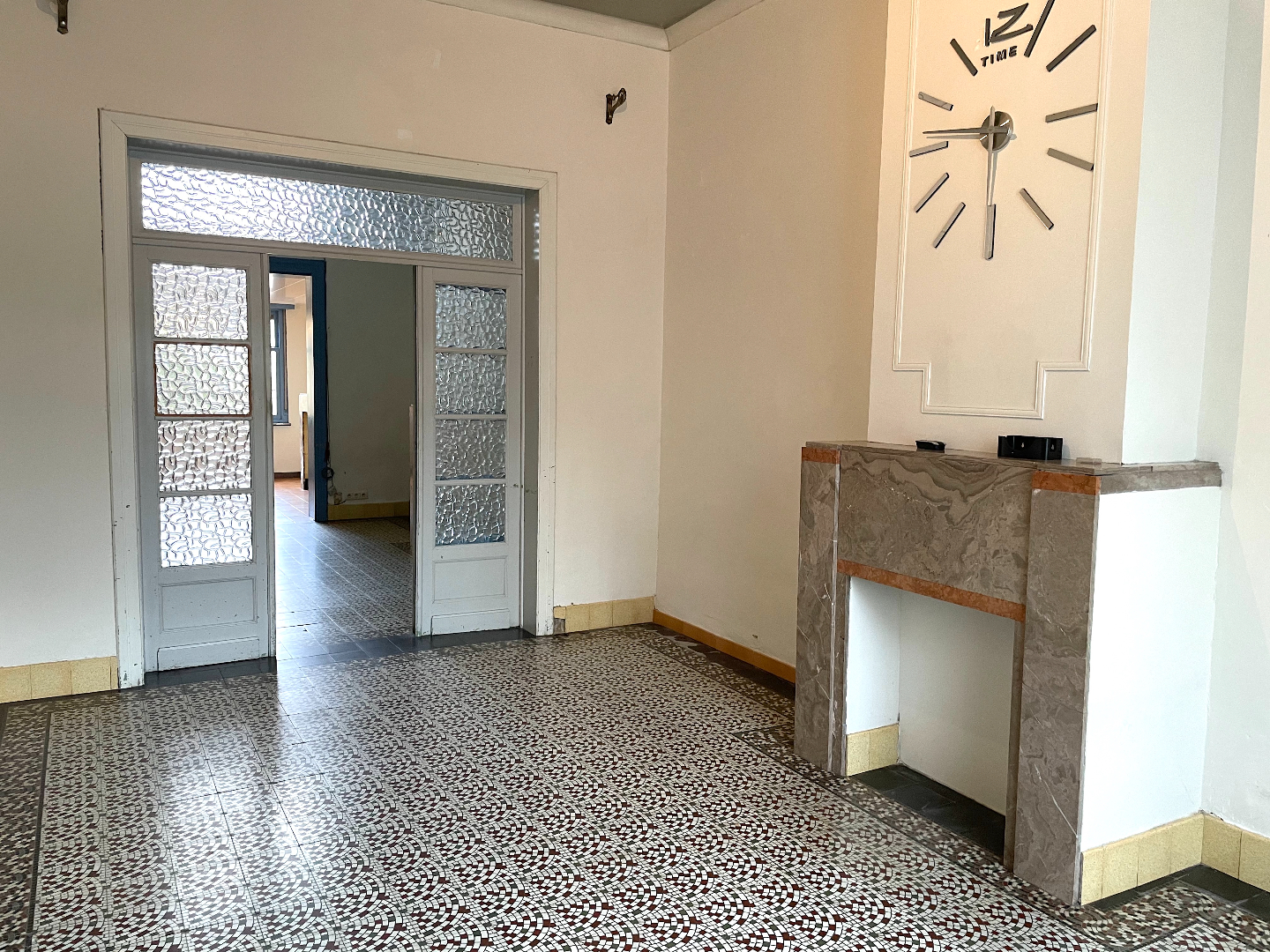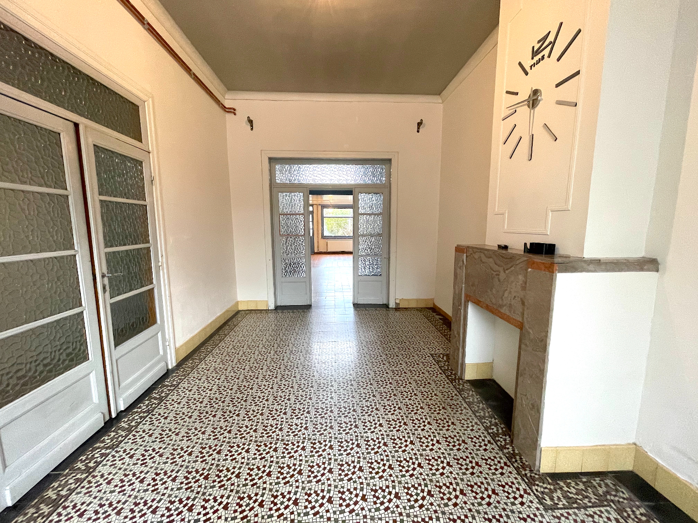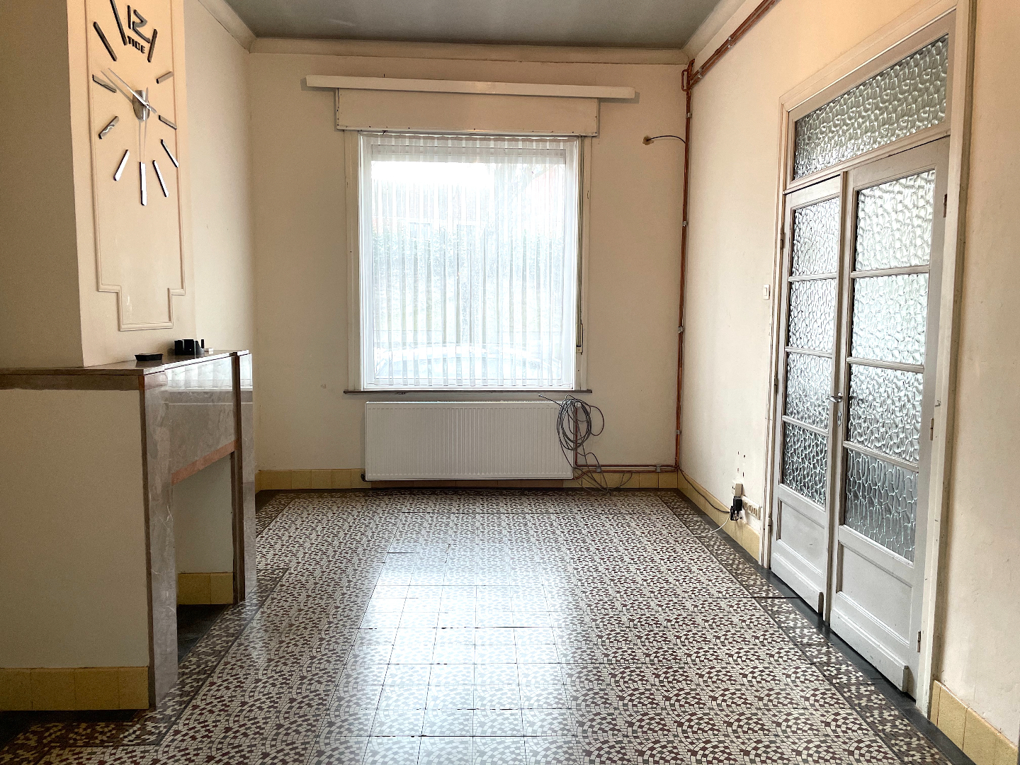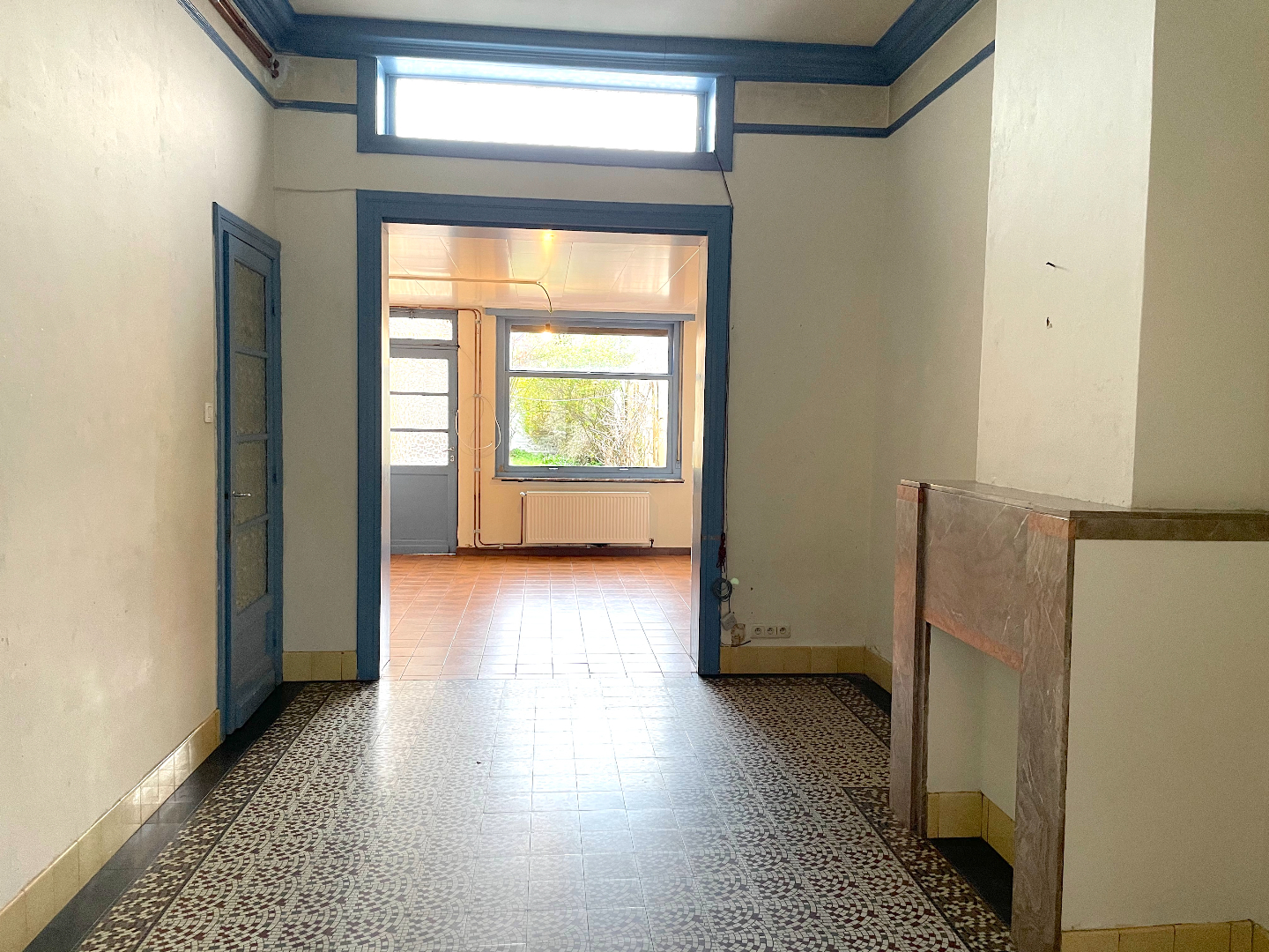 We komen de woning binnen in de hal vanwaar we naar het salon, de leefruimte of de keuken kunnen gaan. Vanuit de leefruimte en de keuken hebben we toegang tot de stadstuin.