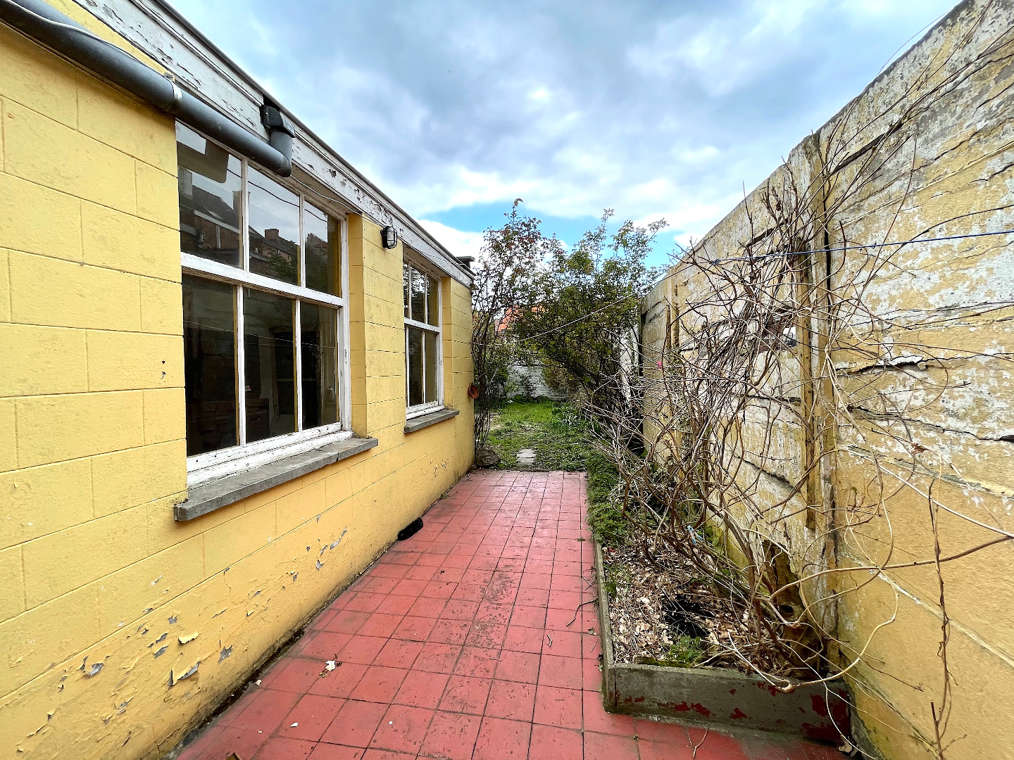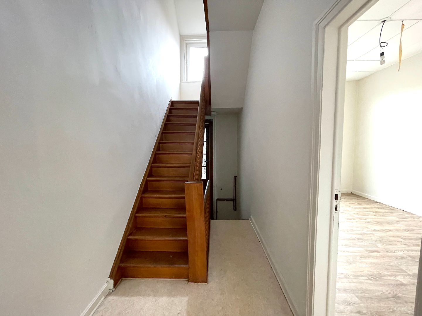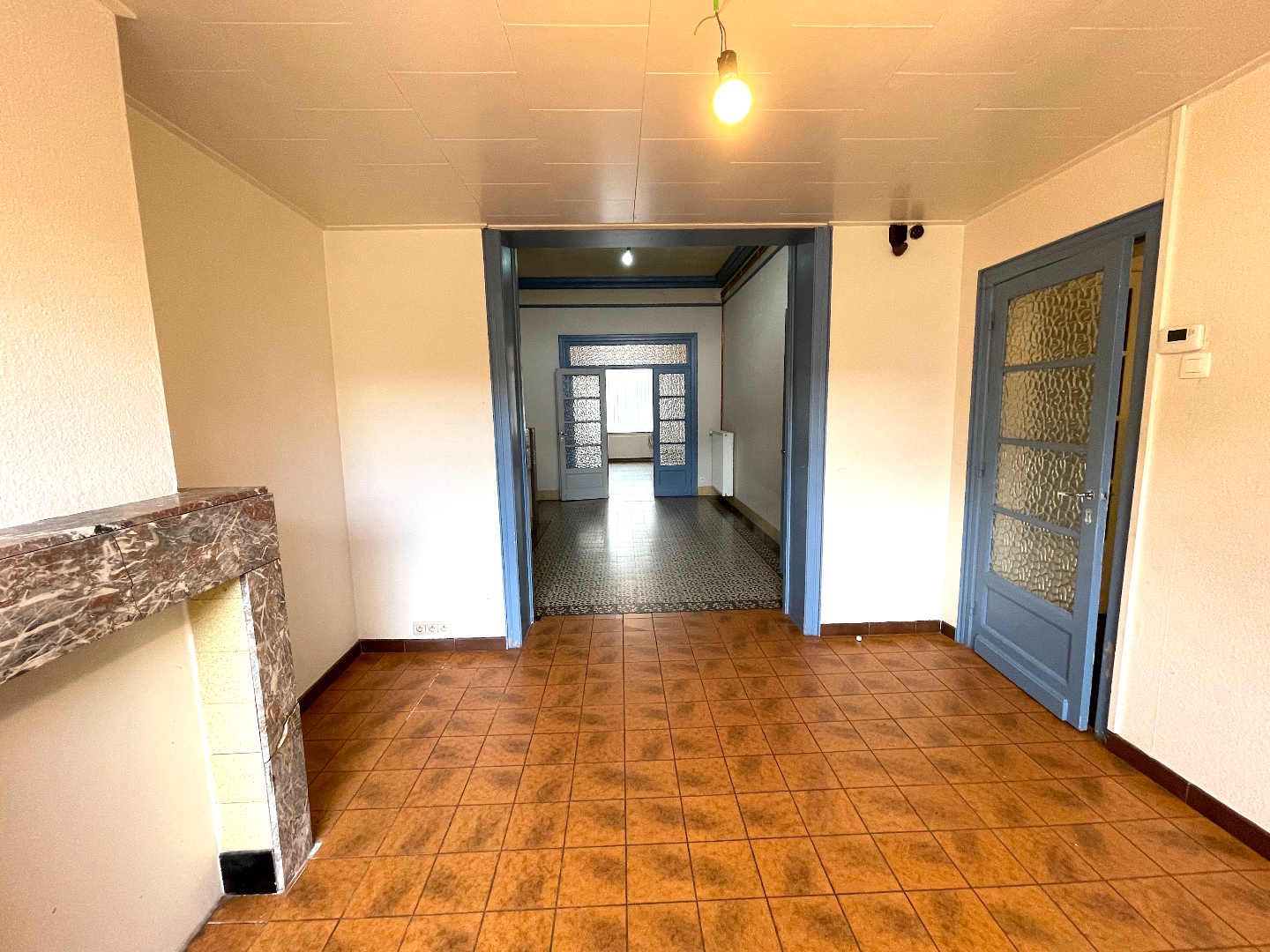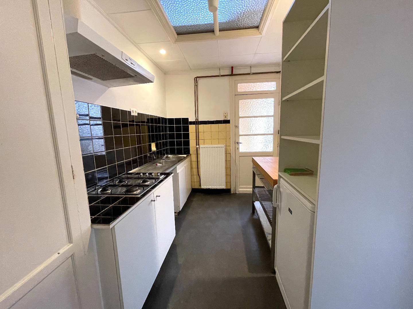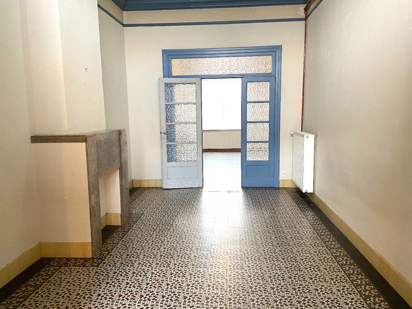 We komen de woning binnen in de hal vanwaar we naar het salon, de leefruimte of de keuken kunnen gaan. Vanuit de leefruimte en de keuken hebben we toegang tot de stadstuin.