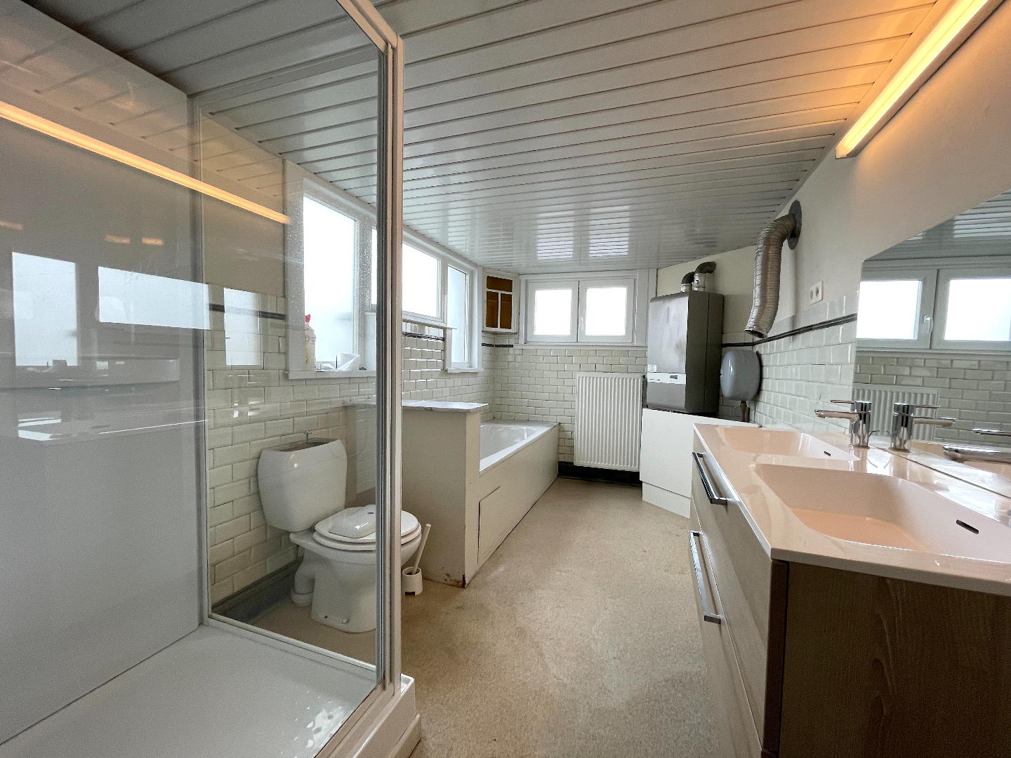 Op de eerste verdieping vinden we 2 grote slaapkamers en de badkamer. De badkamer beschikt over een douche, toilet, bad en dubbele lavabo. Hier is ook plaats om een wasmachine en droogkast te plaatsen.