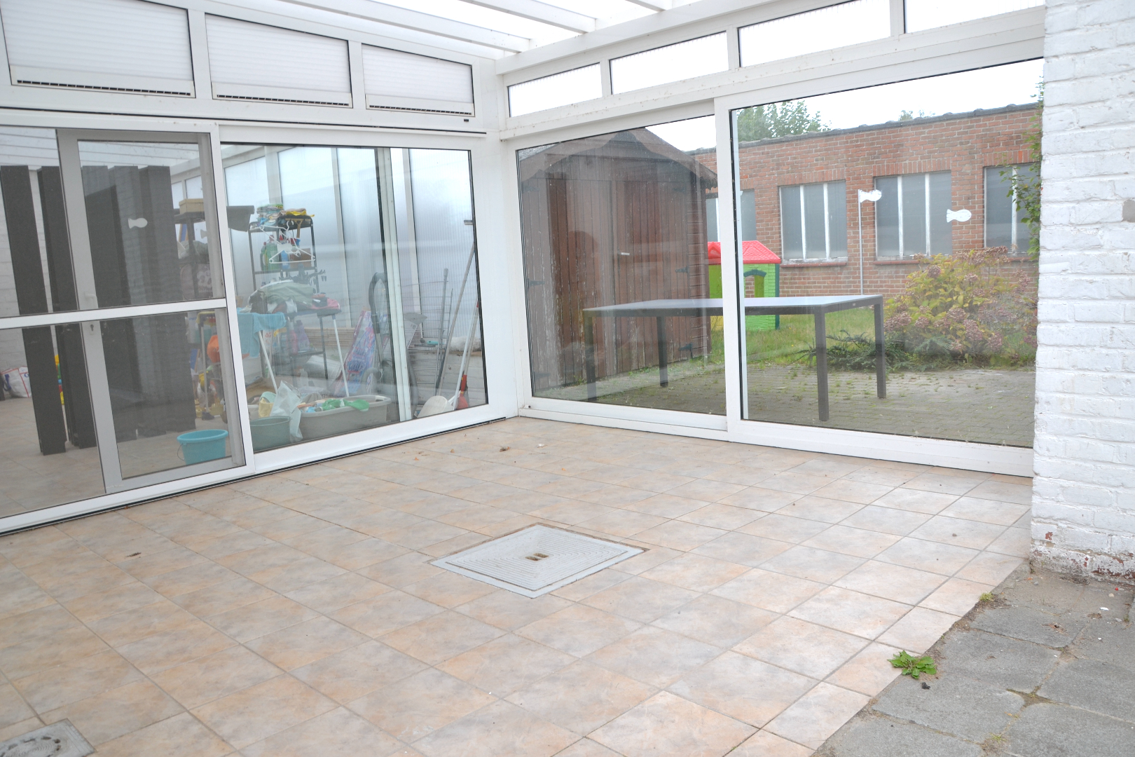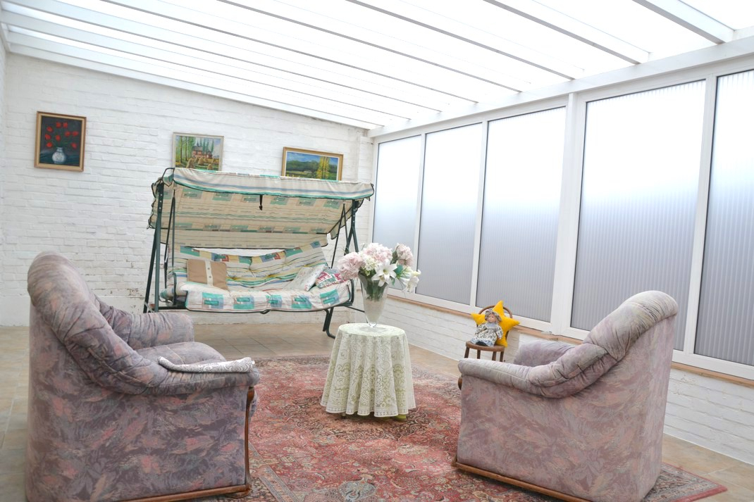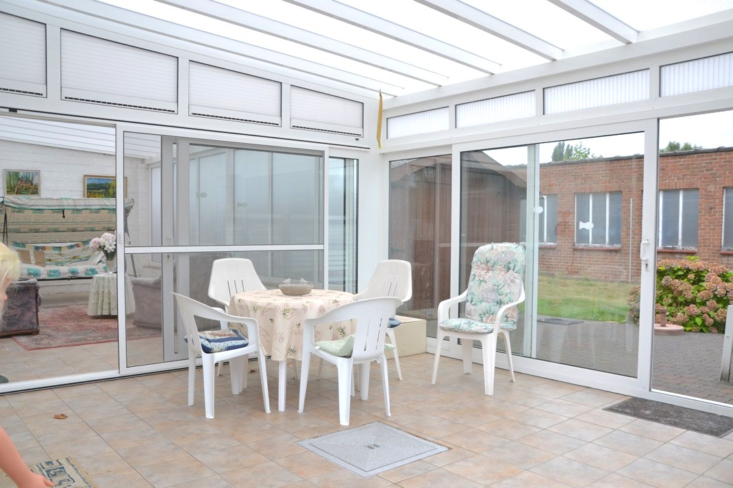 Achteraan is een lichtrijke veranda en overdekt terras aangebouwd. Dit grenst aan de gezellige tuin met tuinberging, die zijdelings grenst een de grote garage die bij de woning hoort.