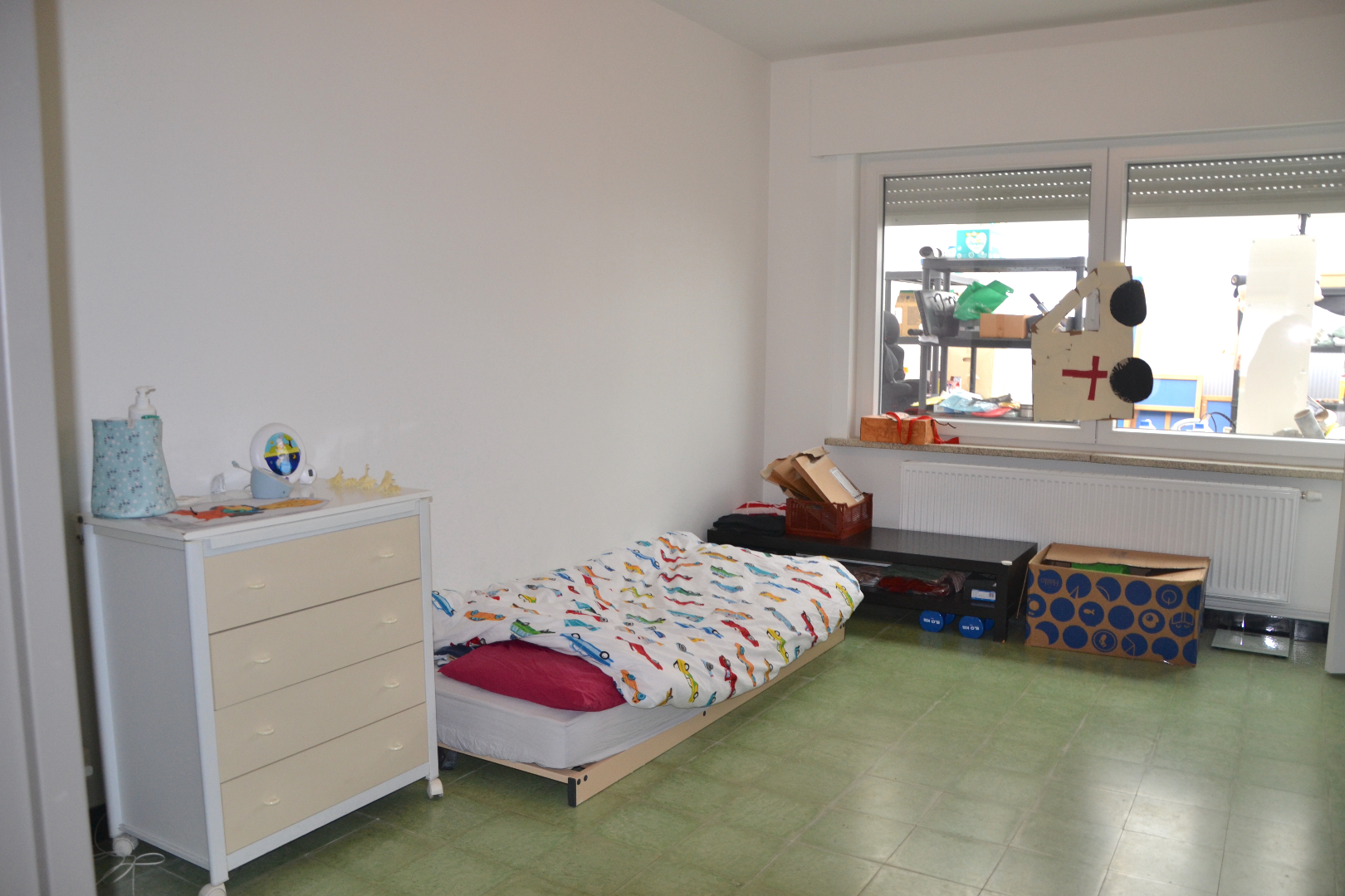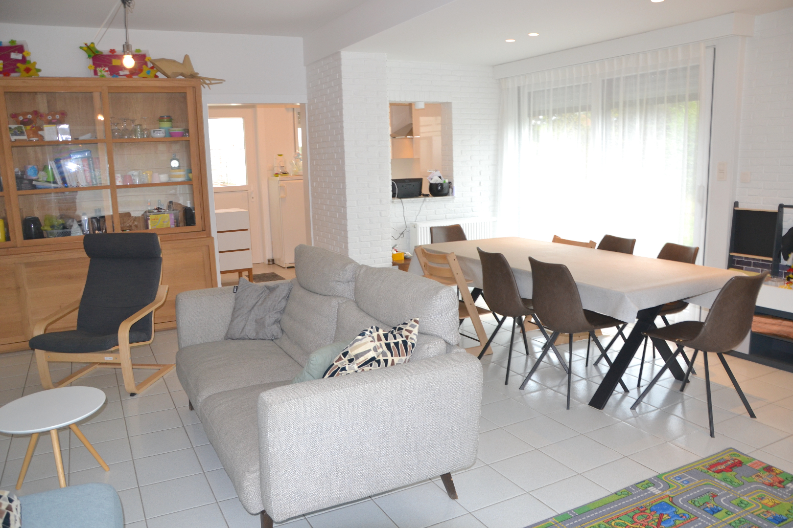 in de woning is er op het gelijkvloers een leefruimte, keuken, badkamer, twee (slaap)kamers en een toegang tot de kelder.
