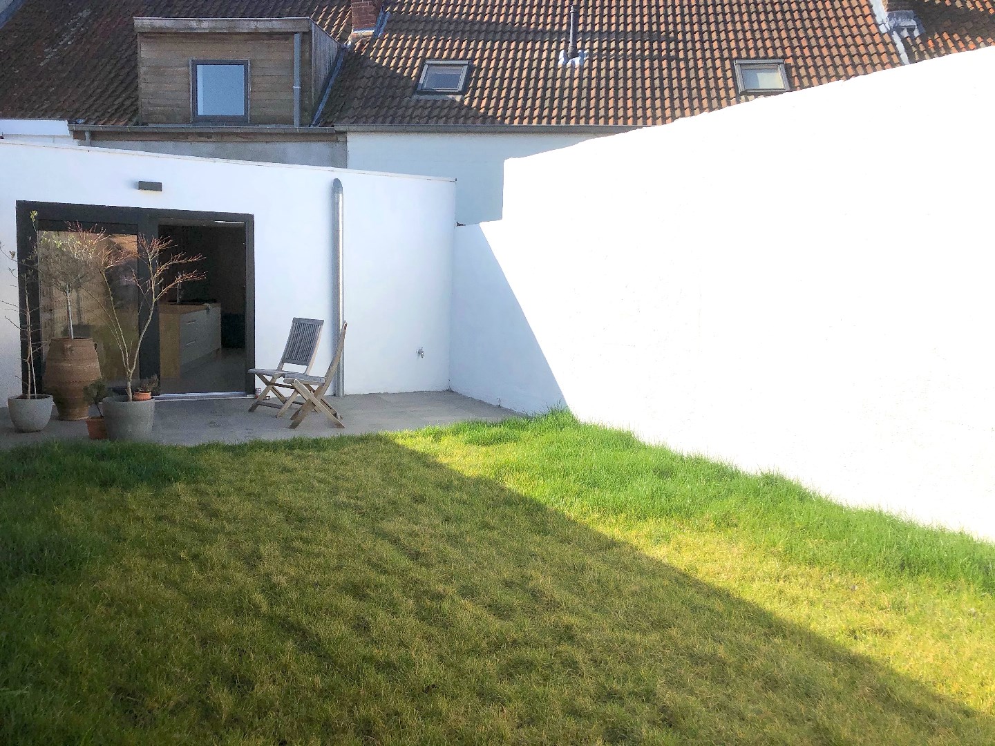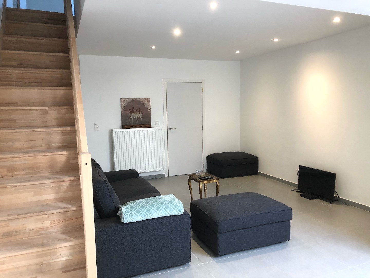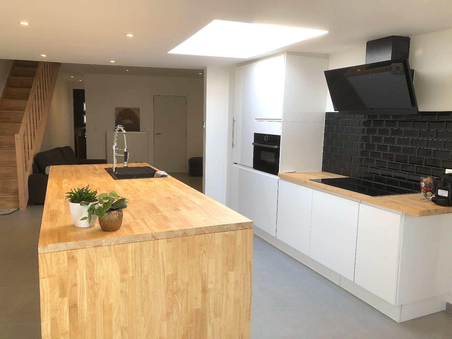 We komen binnen in de hal met apart gastentoilet. De zithoek gaat over in de prachtige open keuken. Deze is voorzien van alle toestellen en een groot kookeiland met zitplaatsen. Door het grote schuifraam kunnen we naar het leuke tuintje met terras. Op het gelijkvloers is er nog een badkamer met dubbel lavabomeubel en inloopdouche. Er is tevens een technische bering.