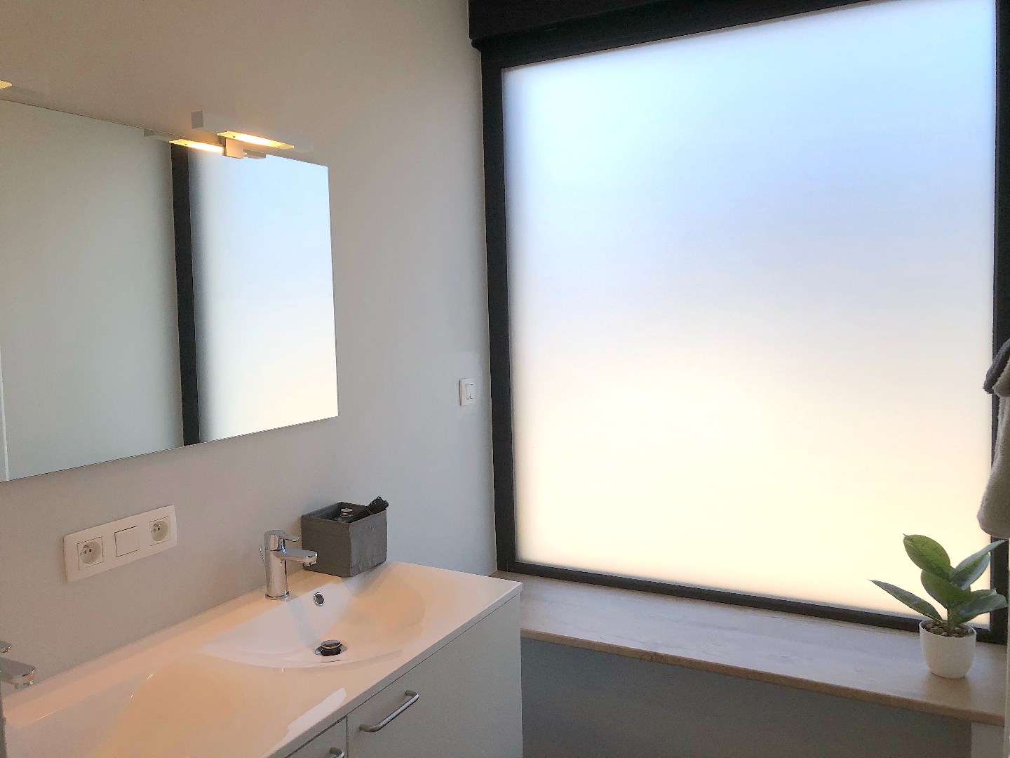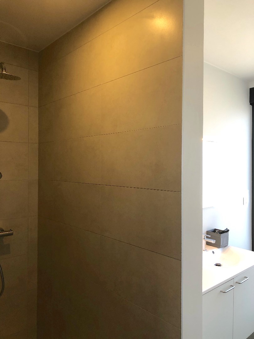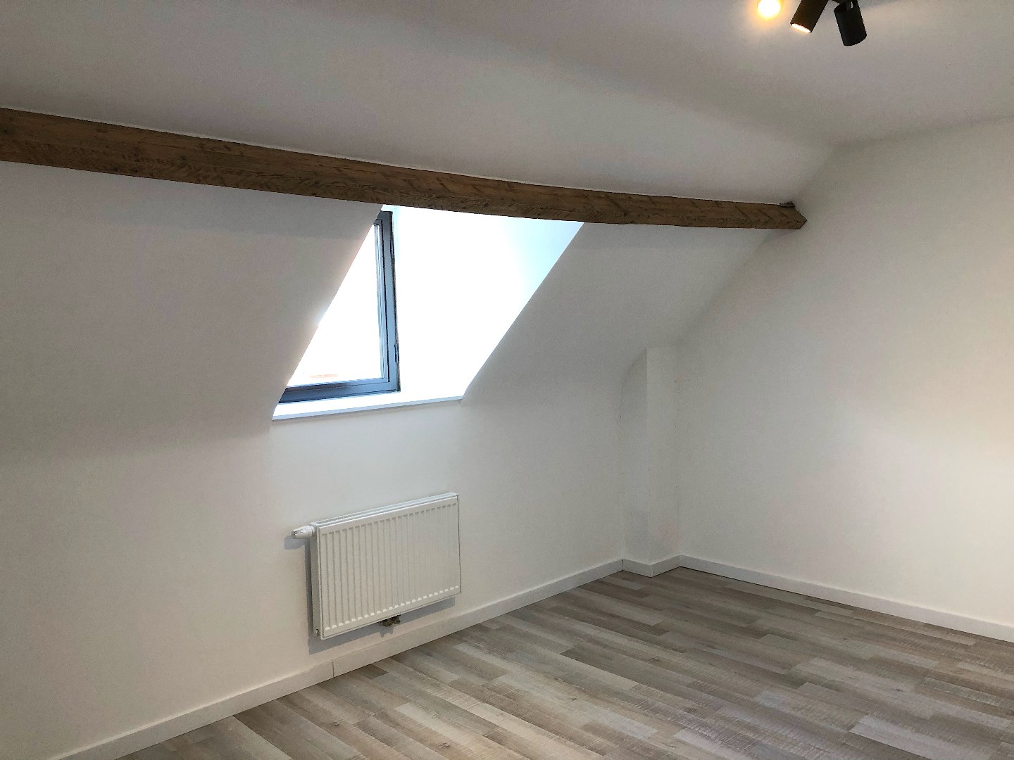 We komen binnen in de hal met apart gastentoilet. De zithoek gaat over in de prachtige open keuken. Deze is voorzien van alle toestellen en een groot kookeiland met zitplaatsen. Door het grote schuifraam kunnen we naar het leuke tuintje met terras. Op het gelijkvloers is er nog een badkamer met dubbel lavabomeubel en inloopdouche. Er is tevens een technische bering.