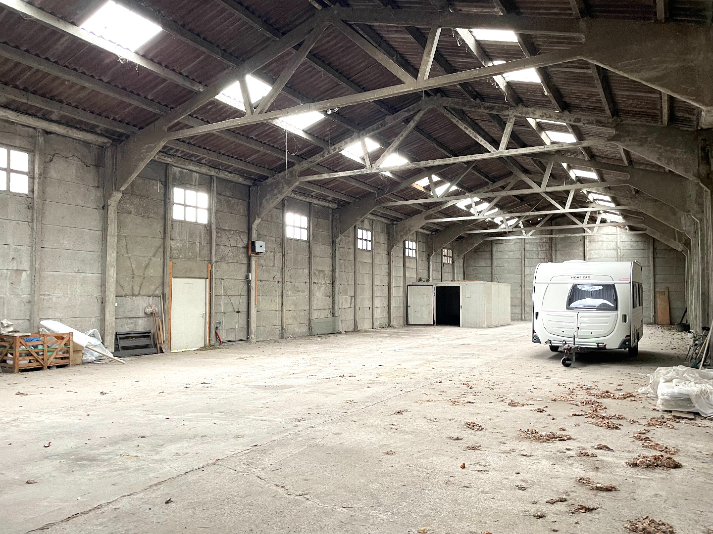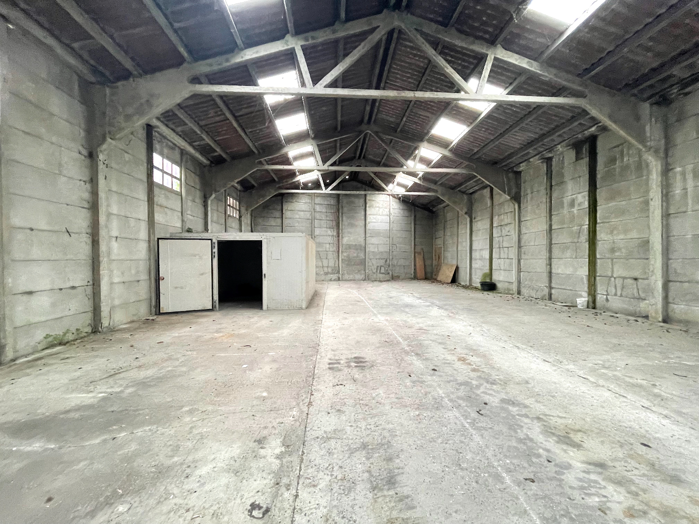 Grote loods die voorzien is van elektriciteit en een manuele poort. De poort heeft een hoogte van 4 meter.