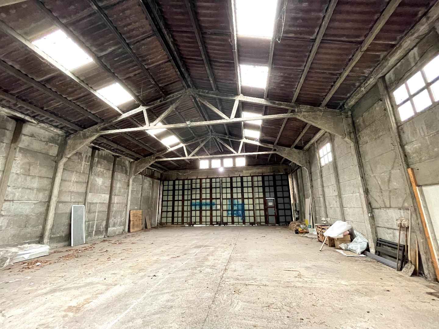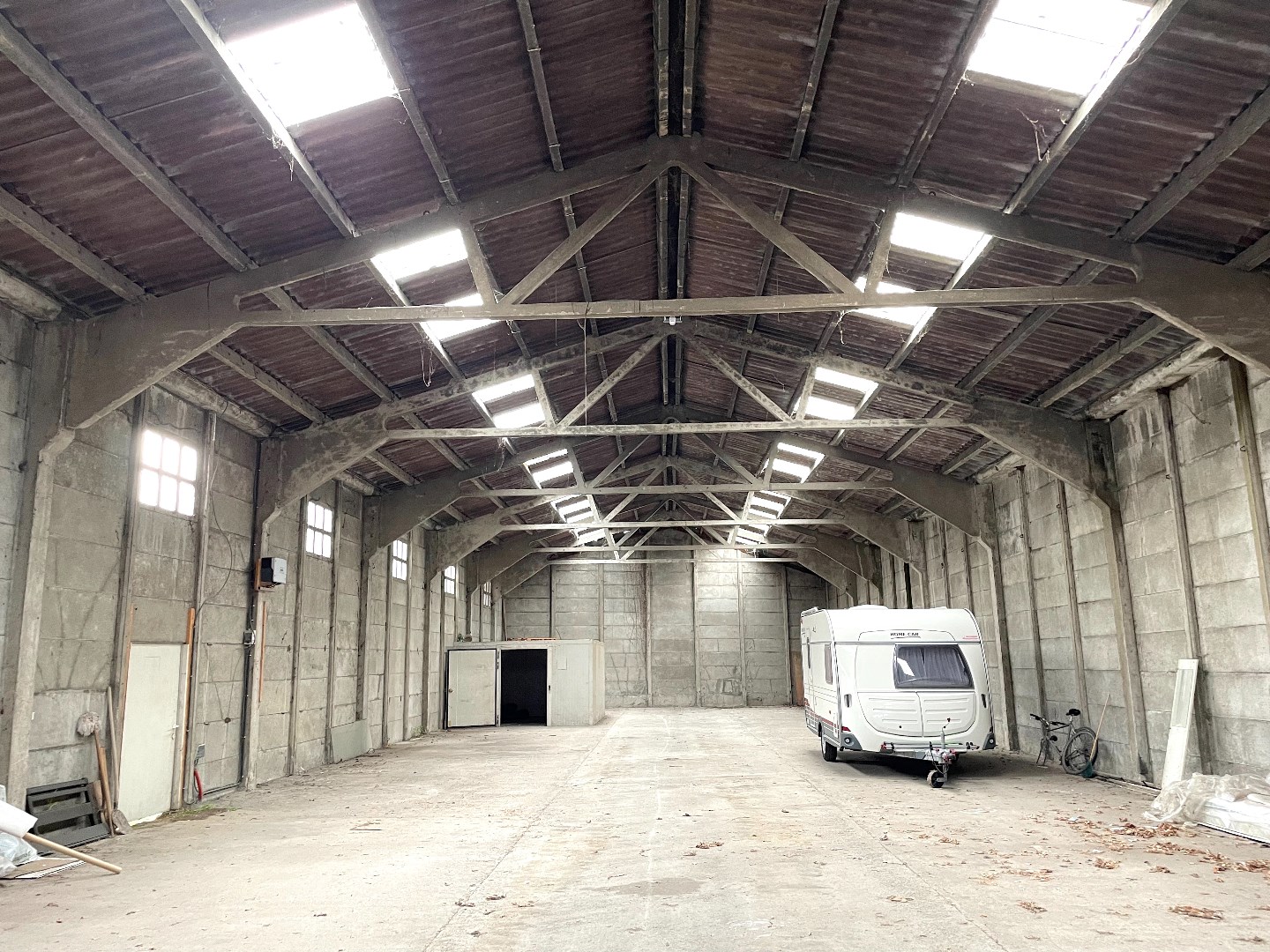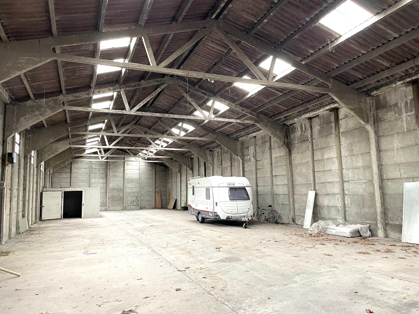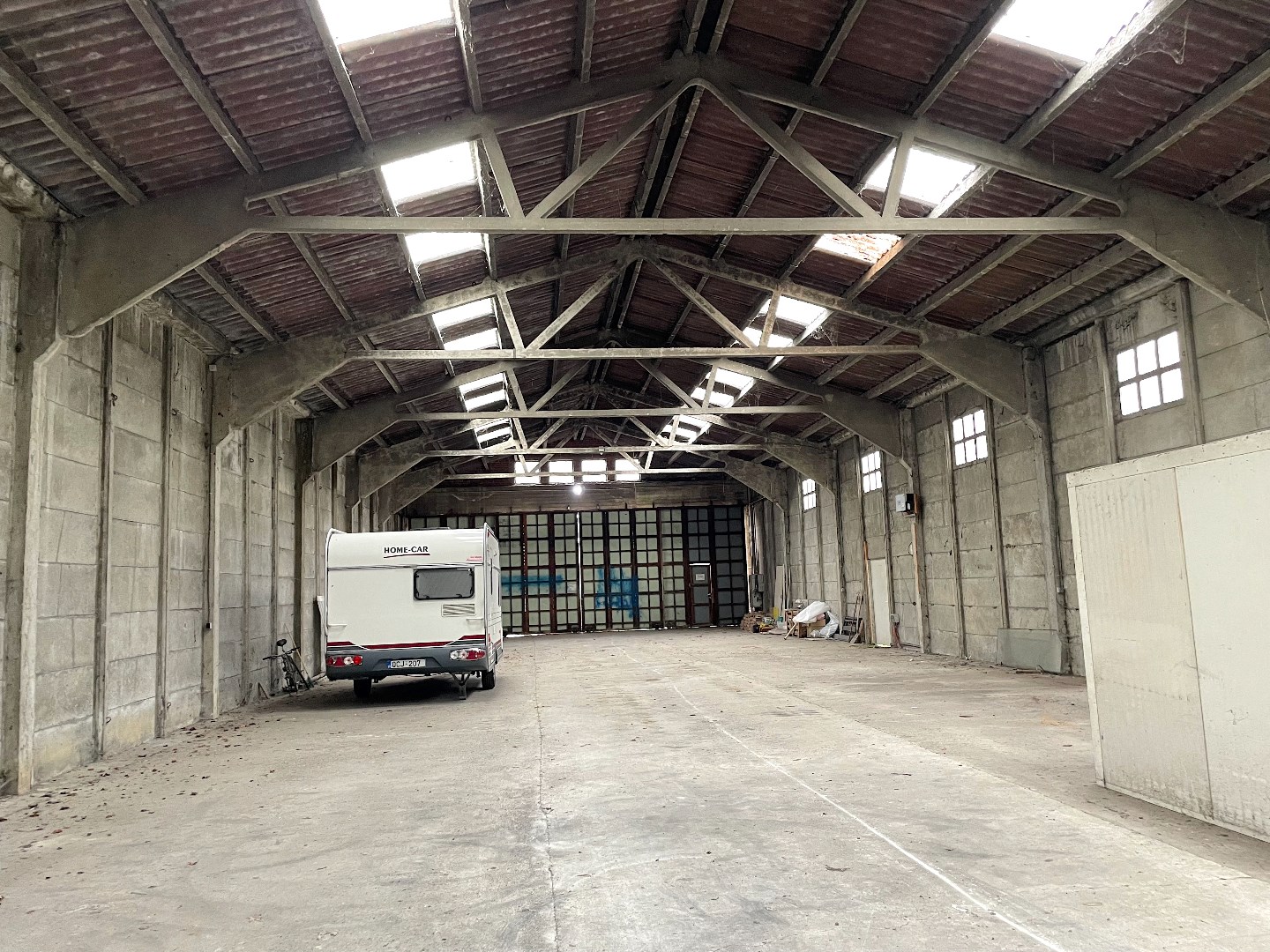 Grote loods die voorzien is van elektriciteit en een manuele poort. De poort heeft een hoogte van 4 meter.