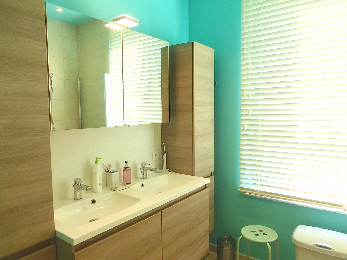 De ruime inkomhal met mooie, ingemaakte maatkasten leidt ons naar de lichtrijke leefruimte op parket met aansluitend een open keuken. Deze maatkeuken is hoogwaaardig afgewerkt en volledig uitgerust. Naast de keuken is een bergruimte.