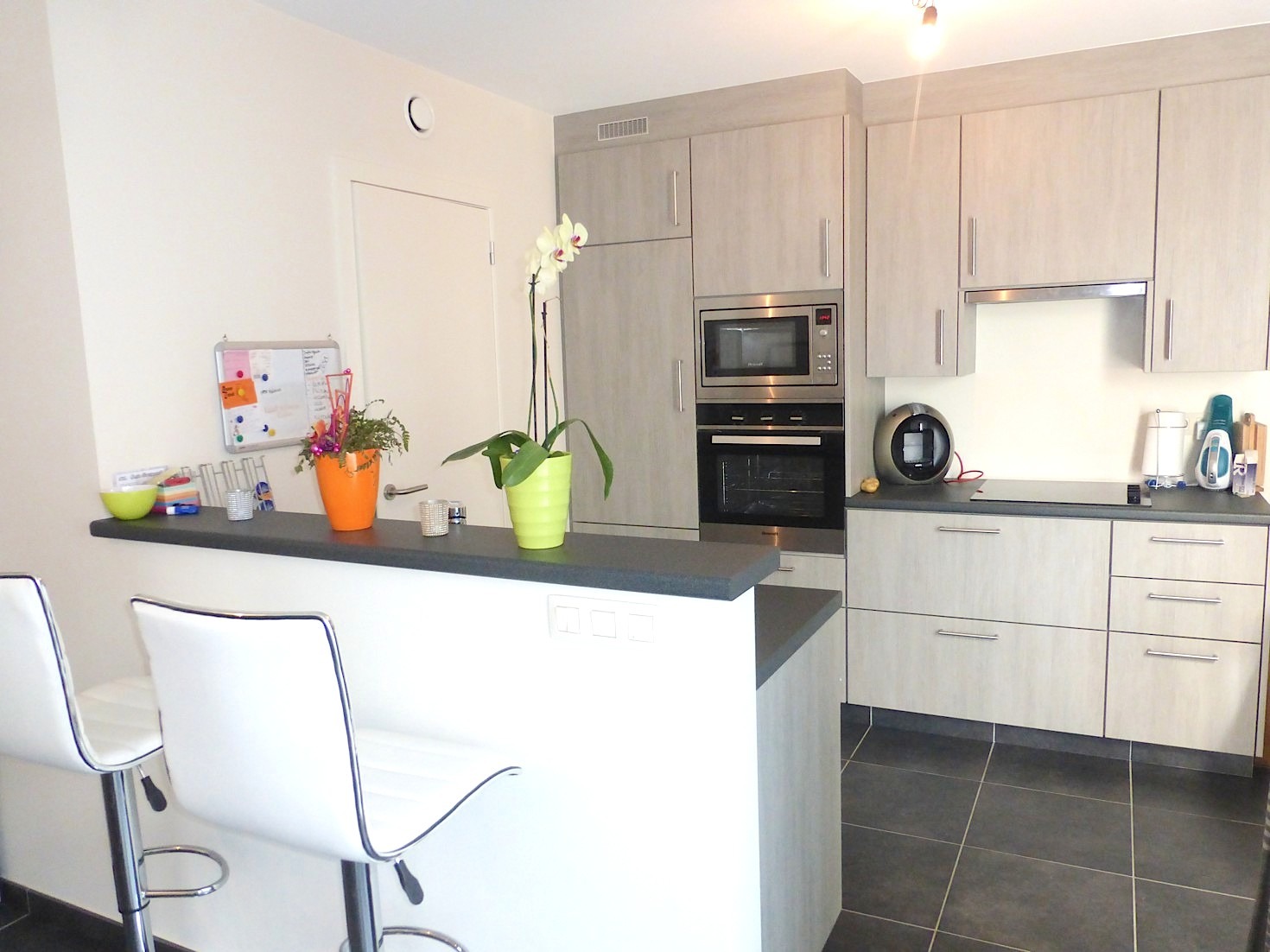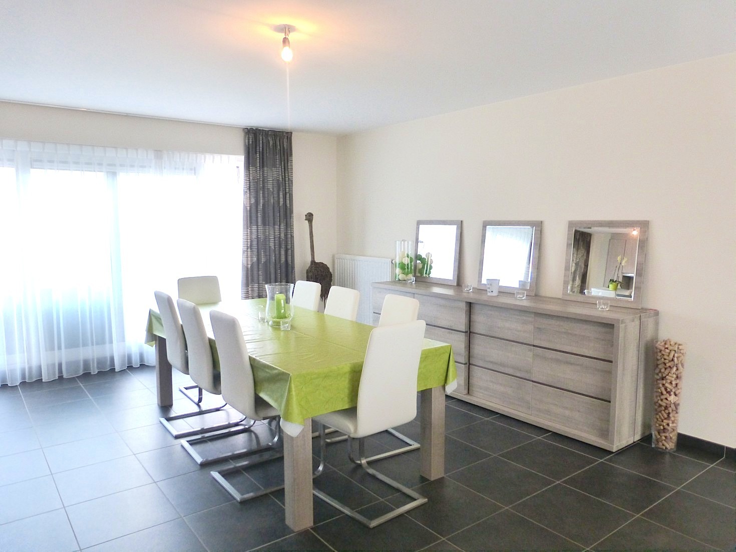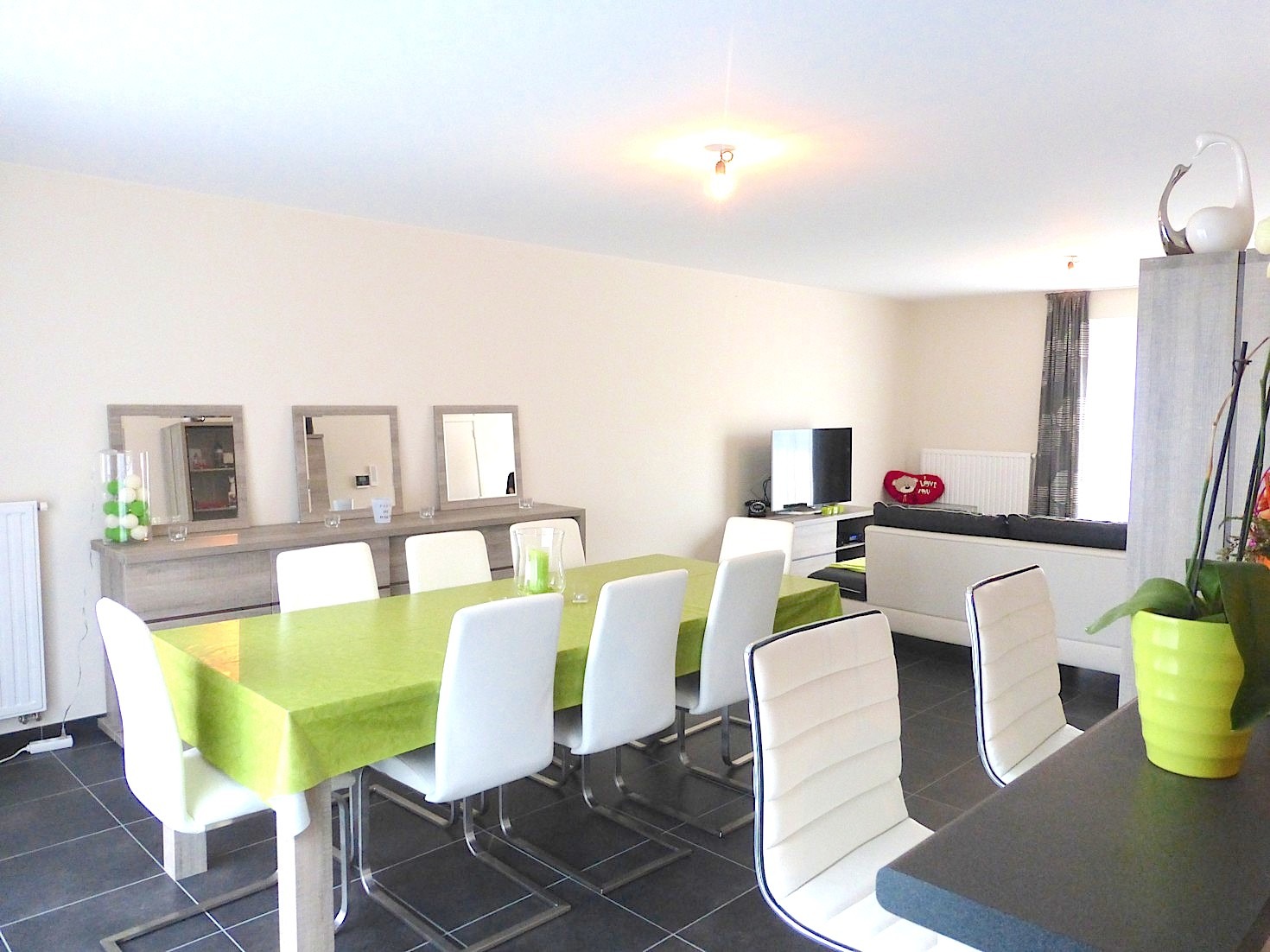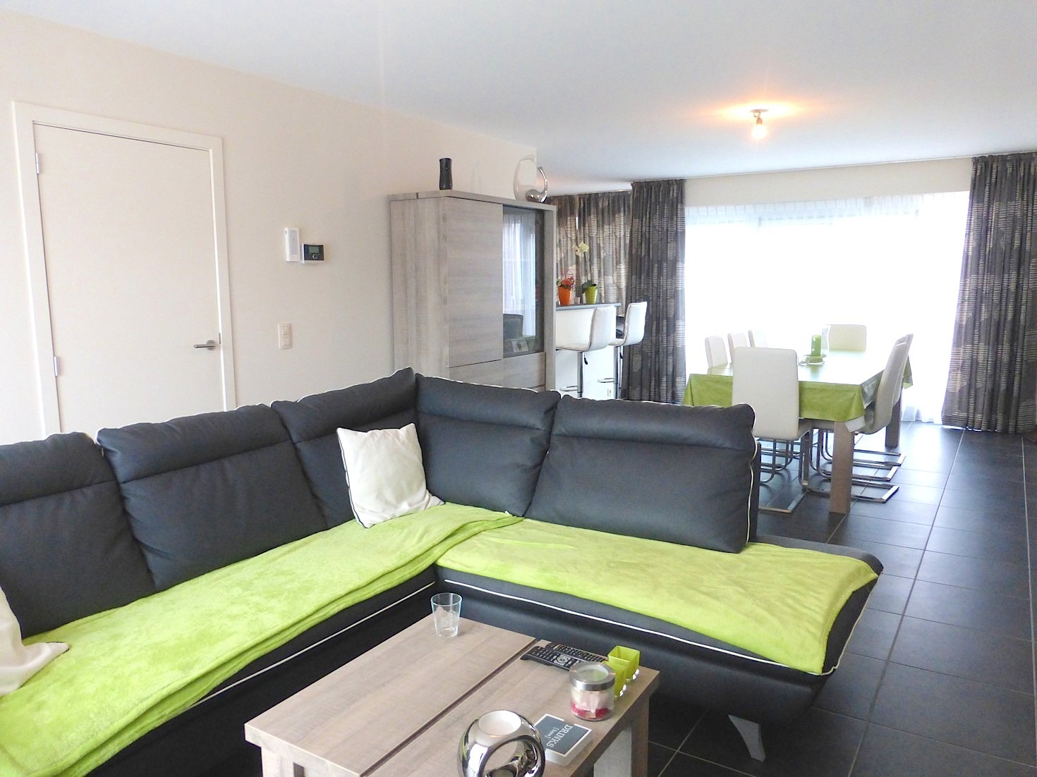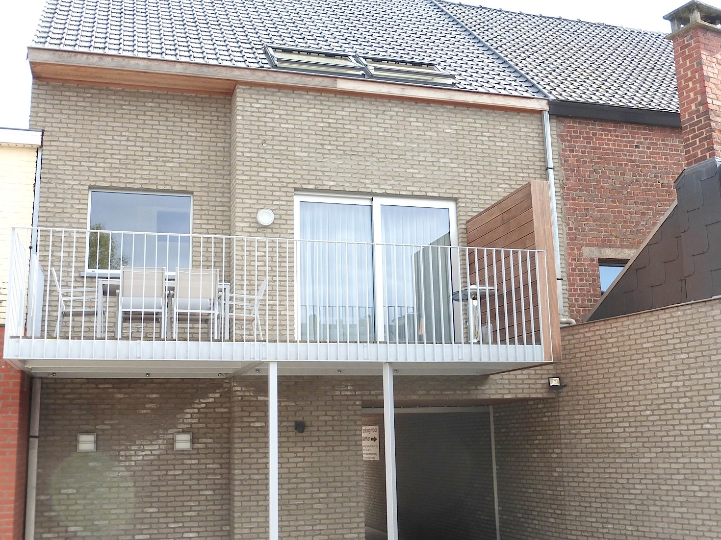 Via een aparte ingang gaan we langs de trap naar het appartement op de 1e verdieping. We komen binnen in de hal met gastentoilet. De living is ruim en beschikt over veel ramen, waardoor de ochtend- en de avondzon heerlijk binnen vallen... Zowel vooraan als achteraan is er een aangenaam terras. De open keuken is praktisch ingericht en beschikt over alle noodzakelijke toestellen. Aansluitend is er een handige berging (met aansluiting voor wasmachine).