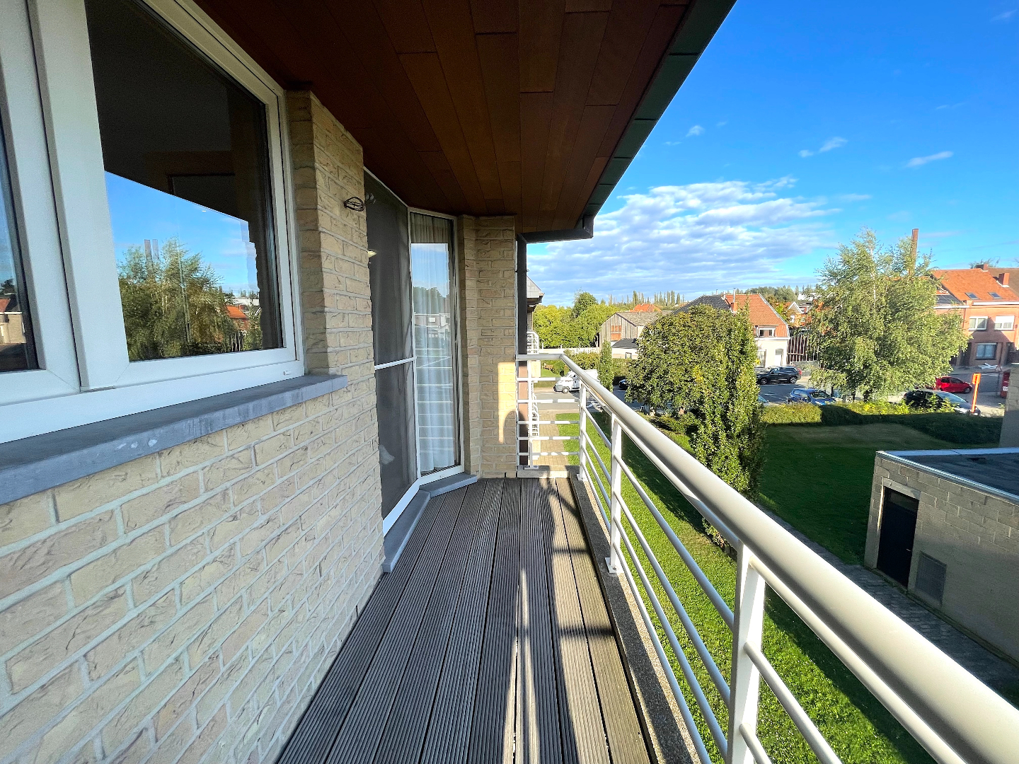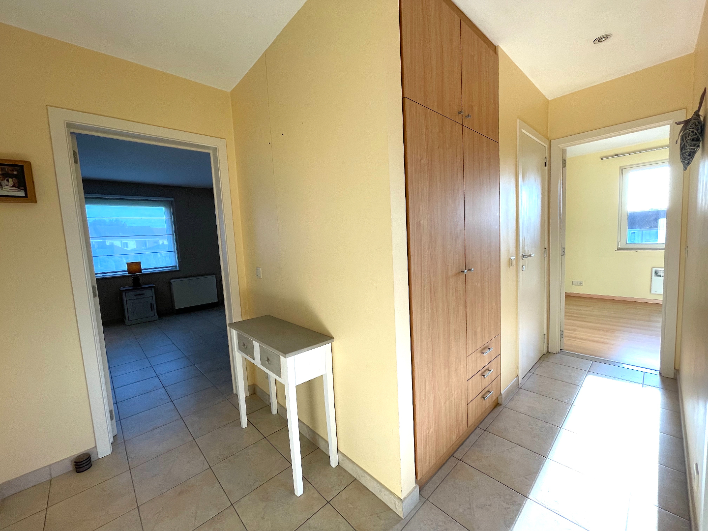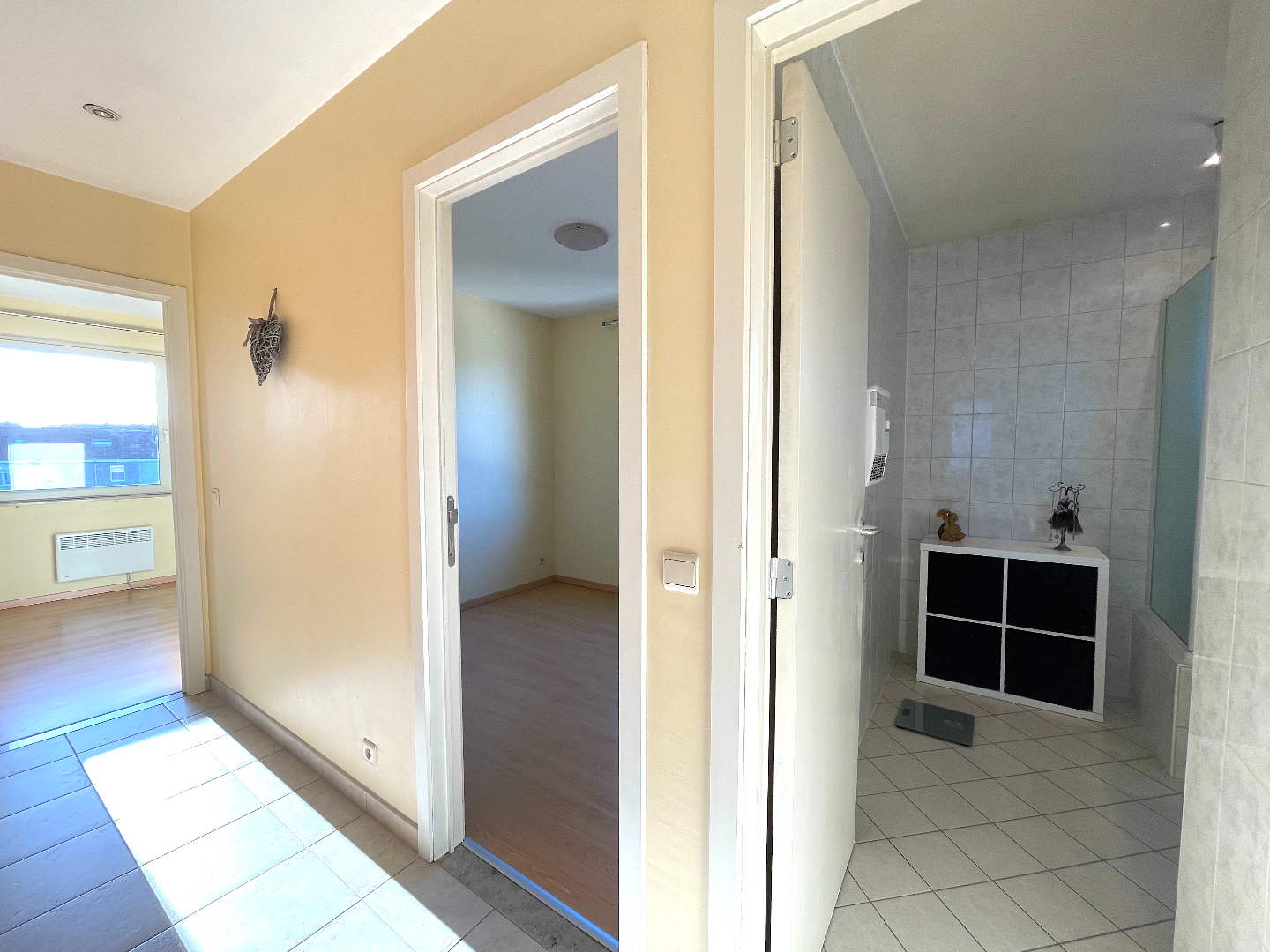 We nemen de lift naar de tweede verdieping. We komen het appartement binnen in de hal met apart gastentoilet en vestiairekast. Vanuit de hal hebben we eveneens toegang tot de slaapkamers, de badkamer en de leefruimte. De living is langs de zijkant gelegen en voorzien van een leuk terras. De living is enorm lichtrijk door de grote raampartijen. De open keuken is uitgerust met de nodige toestellen. Naast de keuken bevindt zich ook een handige berging die ruimte biedt aan een wasmachine en/of droogkast.