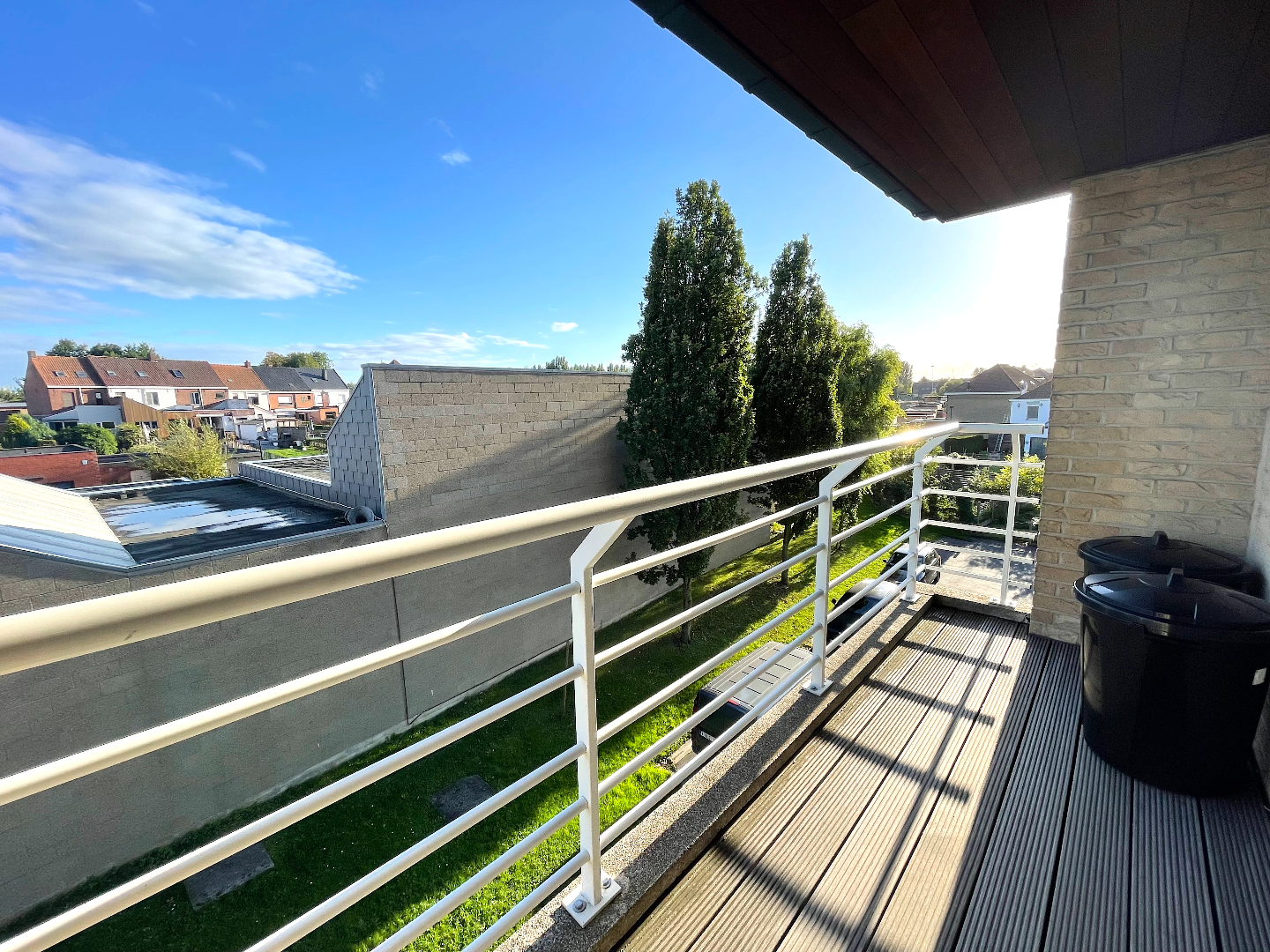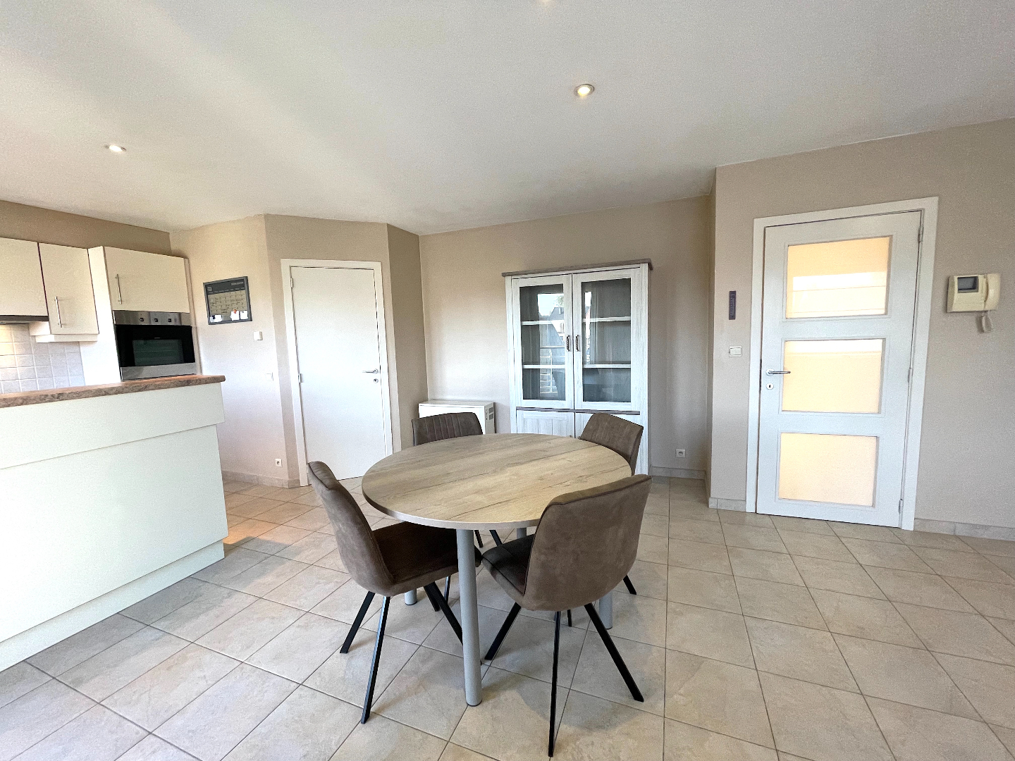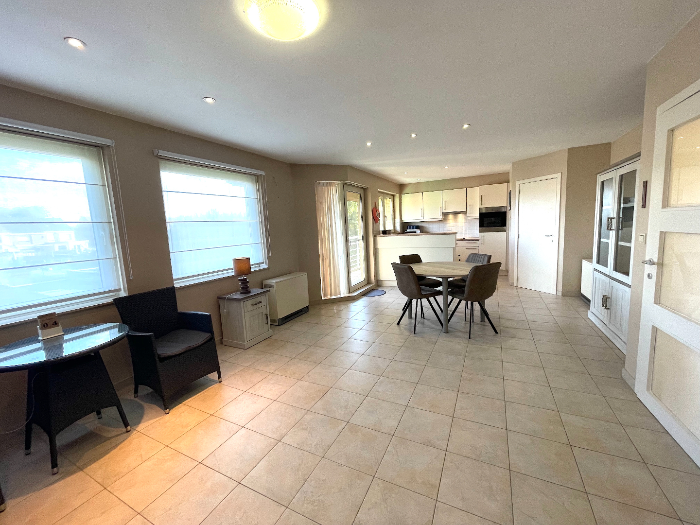 We nemen de lift naar de tweede verdieping. We komen het appartement binnen in de hal met apart gastentoilet en vestiairekast. Vanuit de hal hebben we eveneens toegang tot de slaapkamers, de badkamer en de leefruimte. De living is langs de zijkant gelegen en voorzien van een leuk terras. De living is enorm lichtrijk door de grote raampartijen. De open keuken is uitgerust met de nodige toestellen. Naast de keuken bevindt zich ook een handige berging die ruimte biedt aan een wasmachine en/of droogkast.