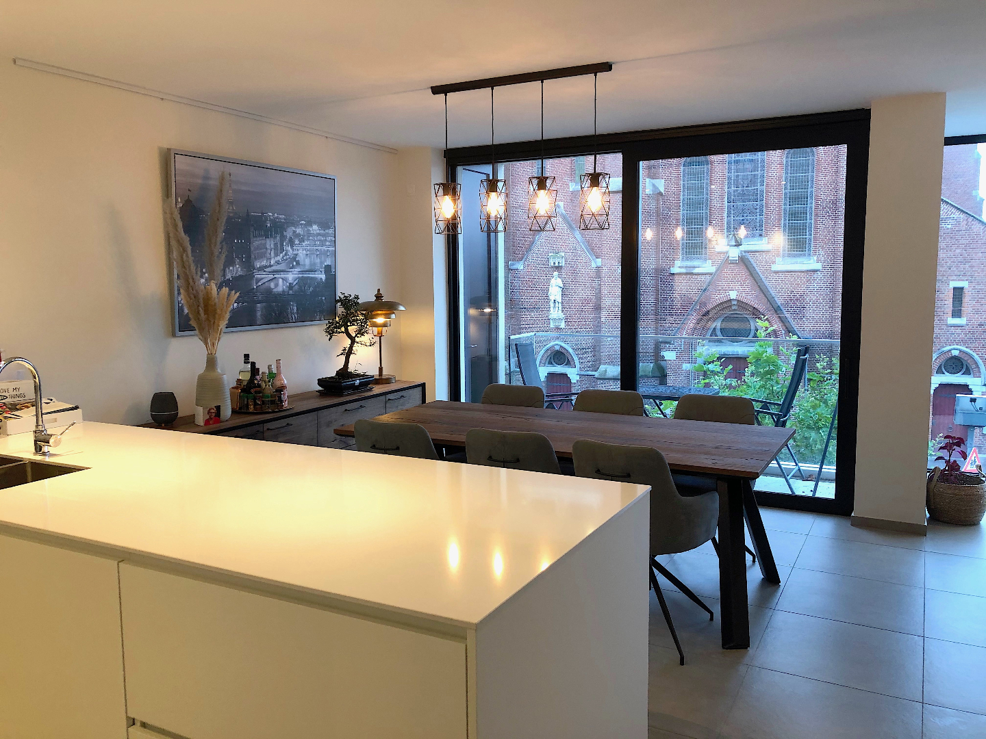 We vinden dit appartement terug op de 2e verdieping van een kleine residentie. Via de lift gaan de naar het appartement. Bij het binnenkomen merken we meteen de zeer lichtrijke living op met een schitterend zicht op Lauweplaats. Door de grote raampartijen heeft u het gevoel buiten te leven. De ideale zuid-oriëntatie maakt het helemaal compleet. De open keuken is voorzien van alle toestellen en zeer tof ingericht.