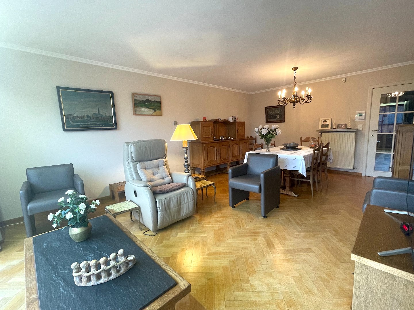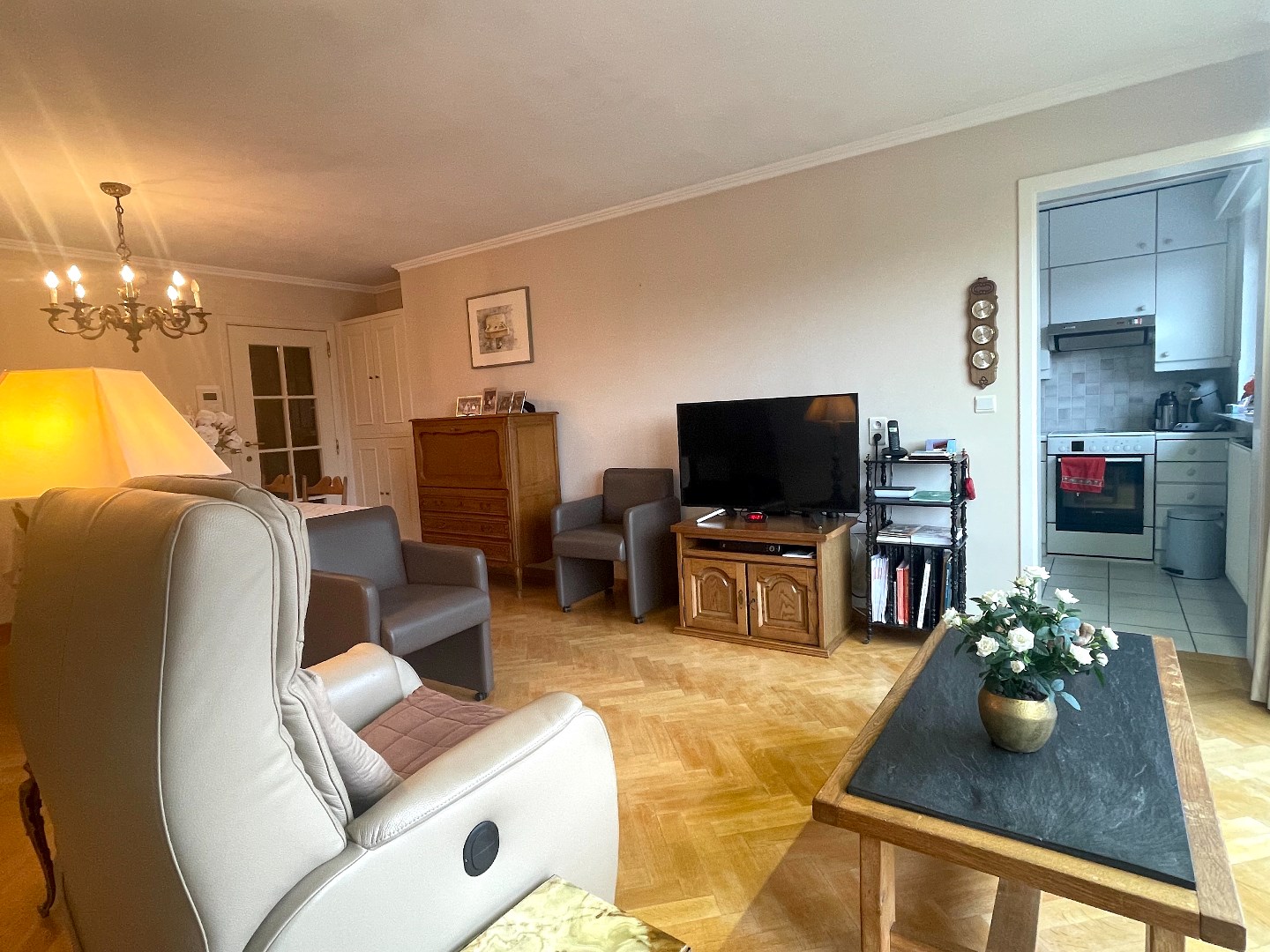 In deze verzorgde residentie komen we het appartement op de 2e verdieping binnen in de hal met apart gastentoilet. De living heeft een groot raam, waar we een mooi zicht hebben op het bruisende centrum van Lauwe. Aangrenzend is er de keuken met handige berging.