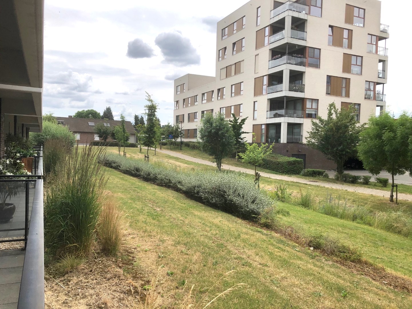 Langs het grote schuifraam kunnen we vanuit de leefruimte naar het ruime terras. Van hieruit hebben we zicht op het vele groen in de buurt.