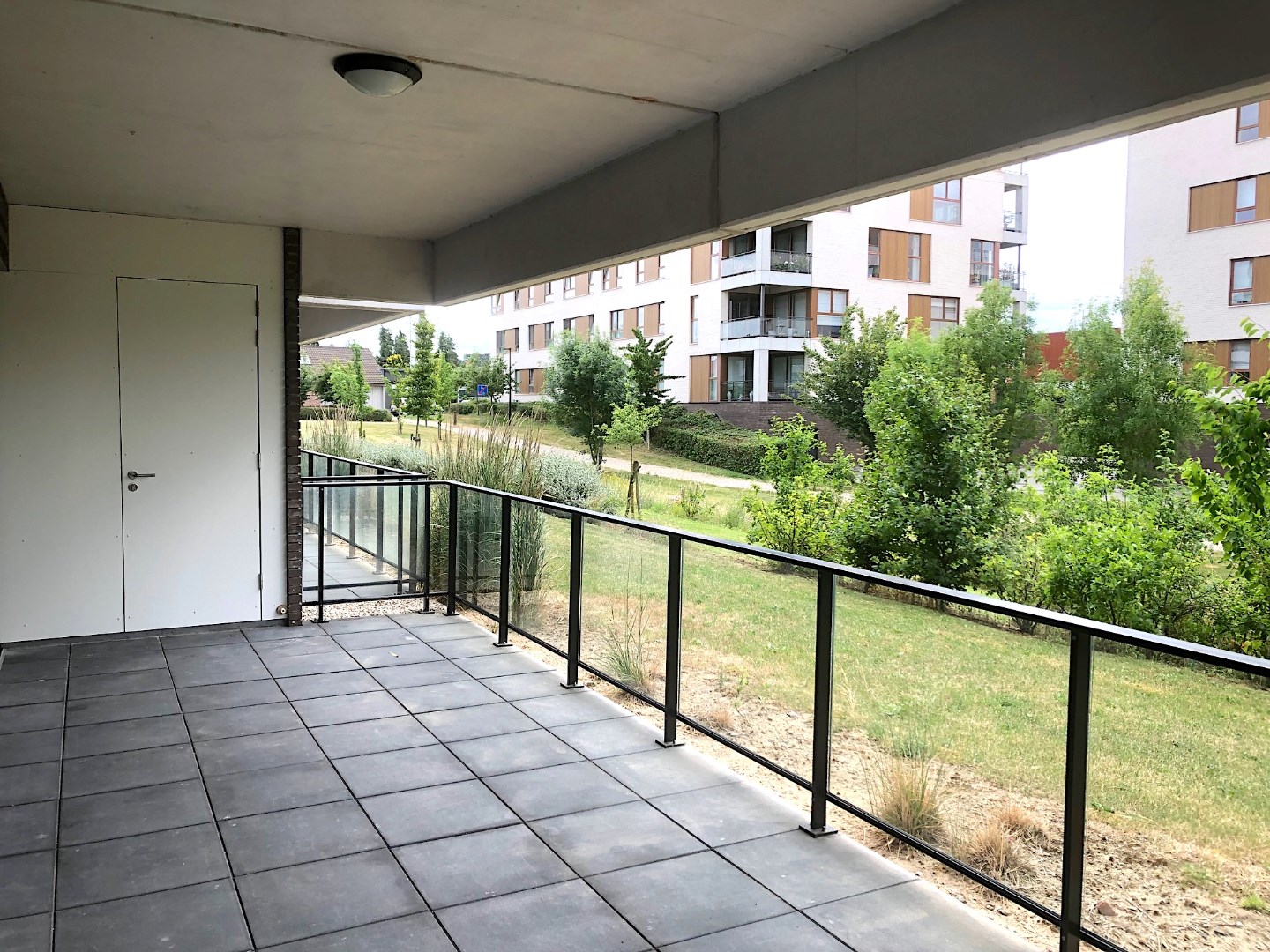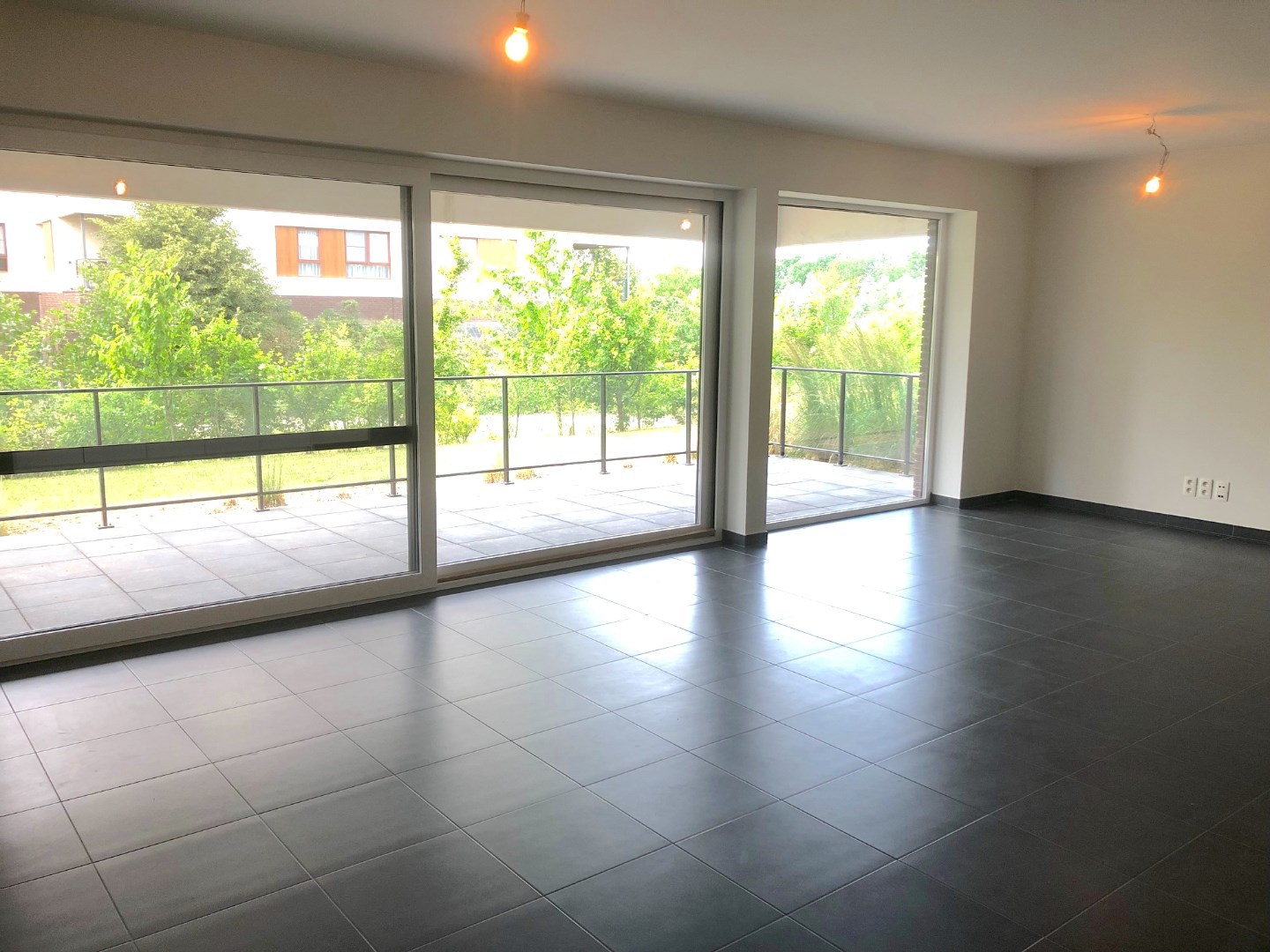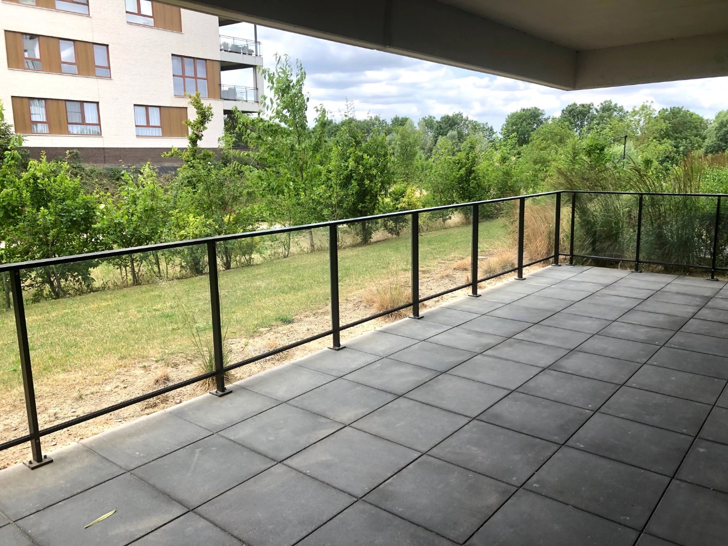 Langs het grote schuifraam kunnen we vanuit de leefruimte naar het ruime terras. Van hieruit hebben we zicht op het vele groen in de buurt.
