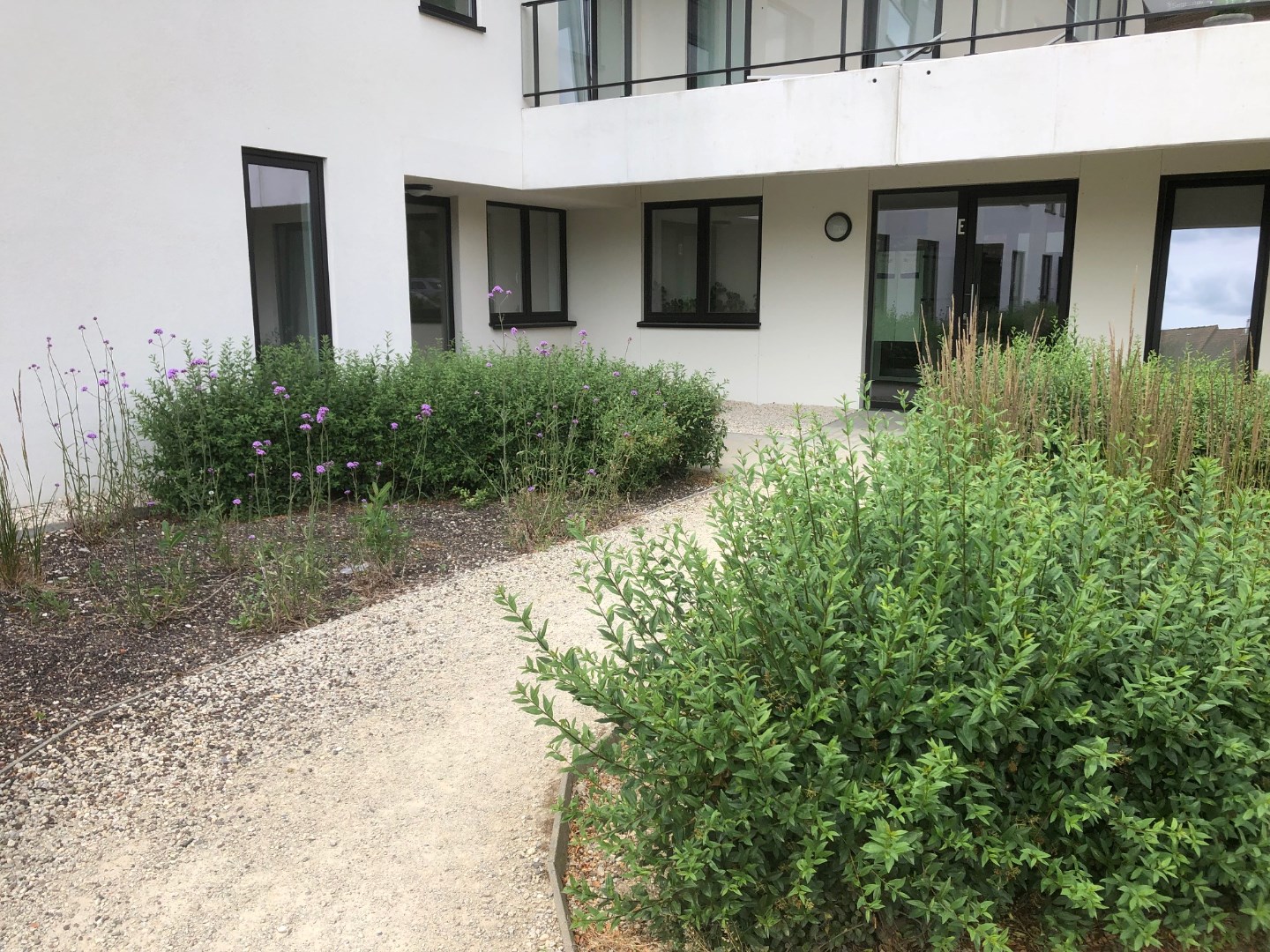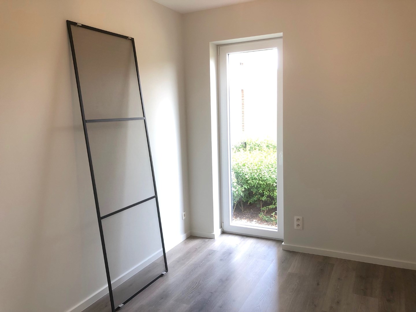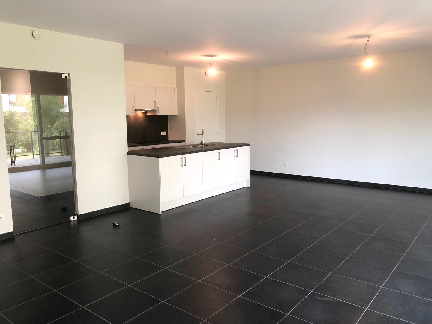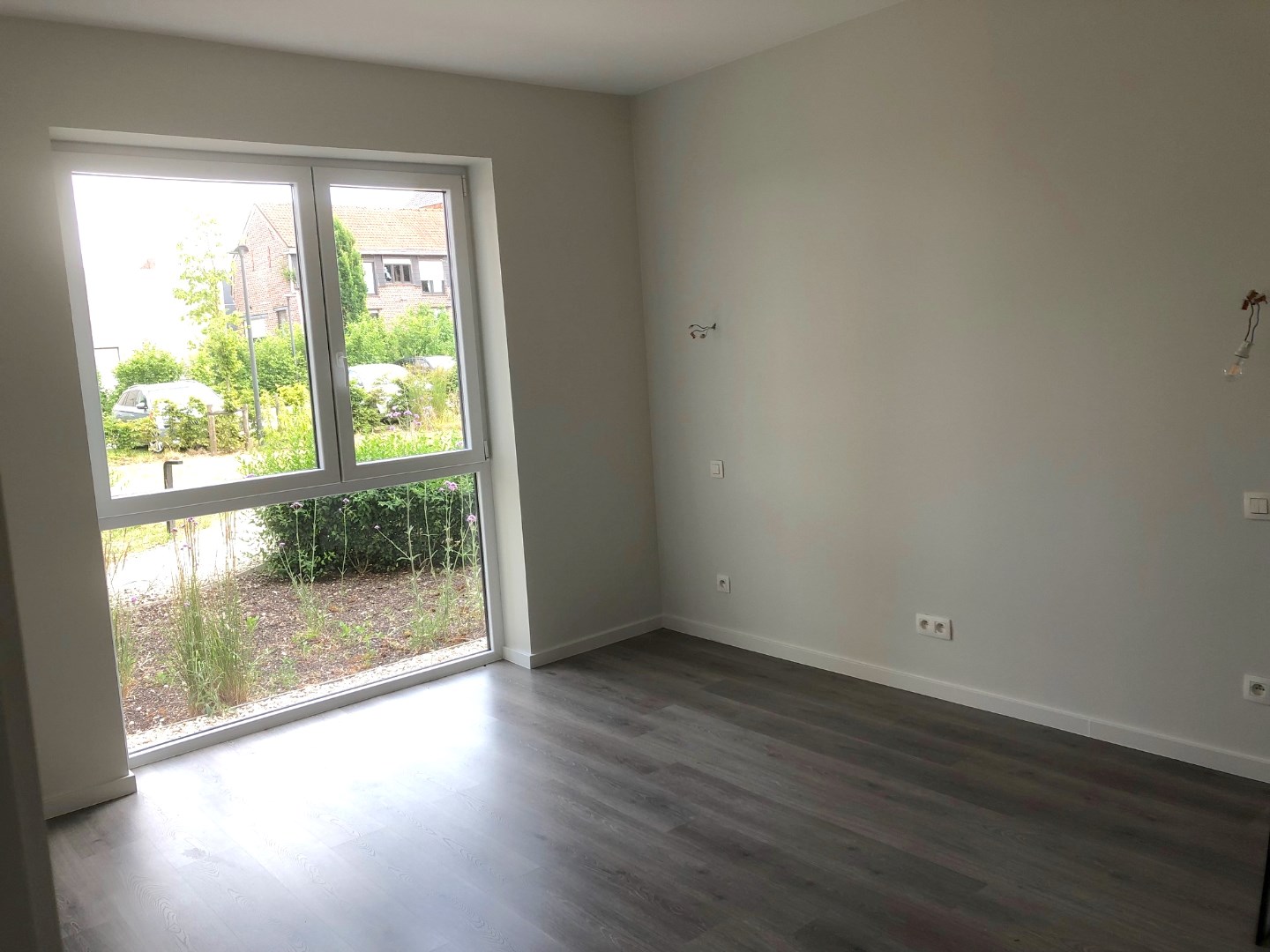 Langs het grote schuifraam kunnen we vanuit de leefruimte naar het ruime terras. Van hieruit hebben we zicht op het vele groen in de buurt.