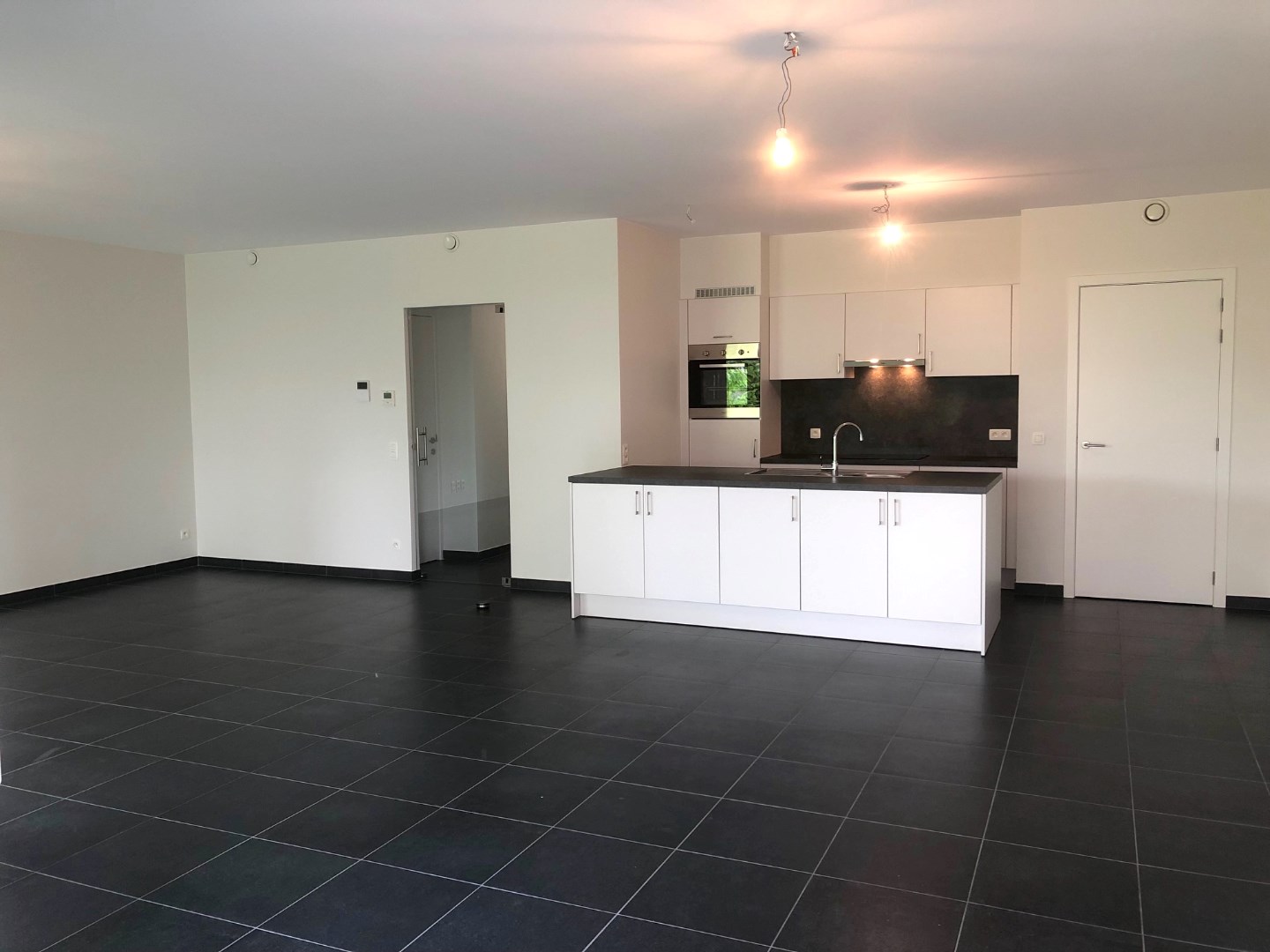 We komen het appartement binnen in de hal met apart gastentoilet. Via de glazen deur komen we in de grote living met de volledig ingerichte open keuken. Aansluitend is er een handige berging.