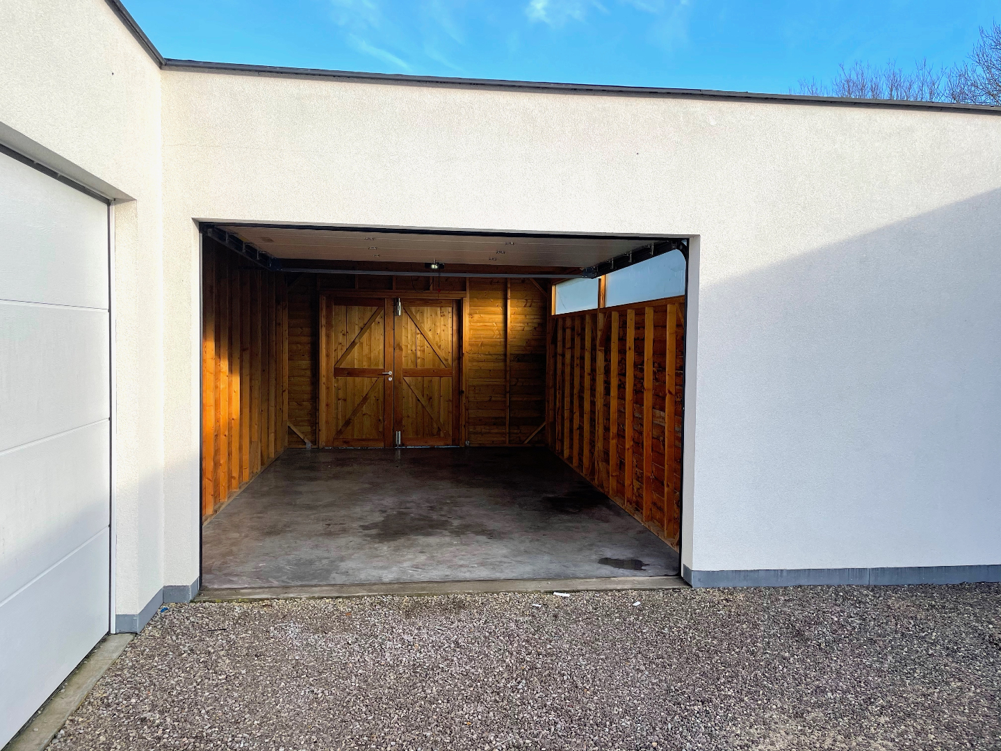 Er is elektriciteit in de garage en een elektrische poort.