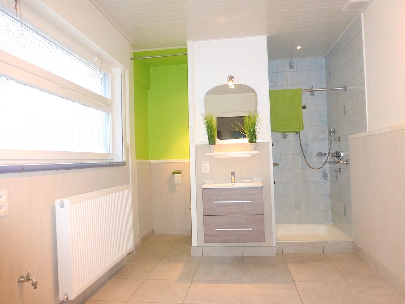 Op het gelijkvloers vinden we tevens de mooi vernieuwde badkamer (met lavabo, douche en toilet), aslook een ruime slaapkamer. Op de verdieping vinden we de 2e slaapkamer.