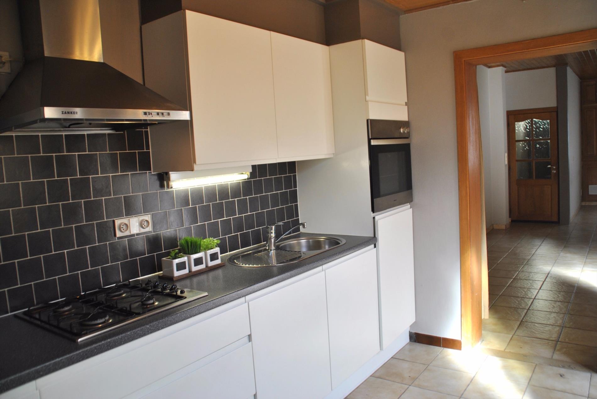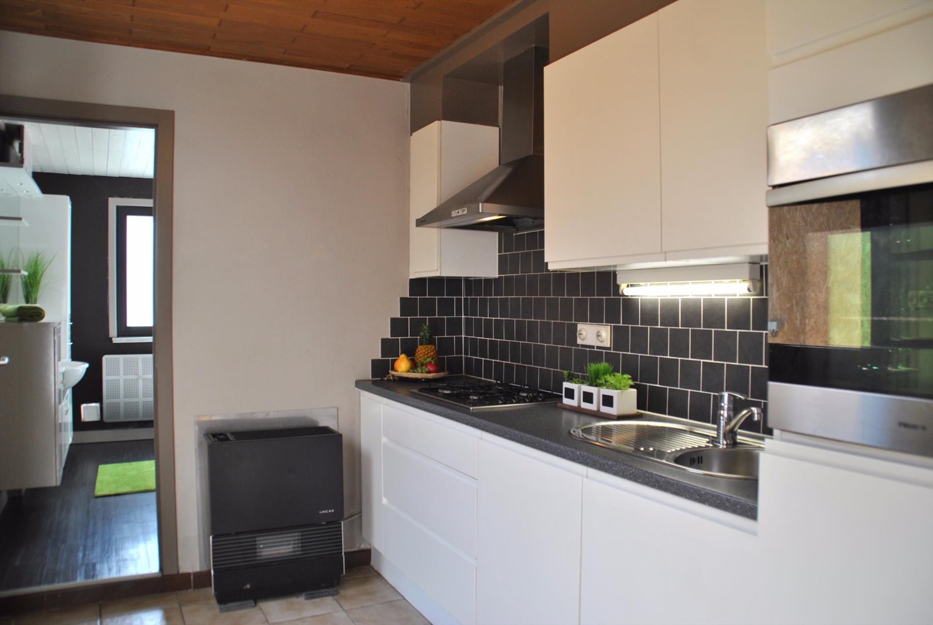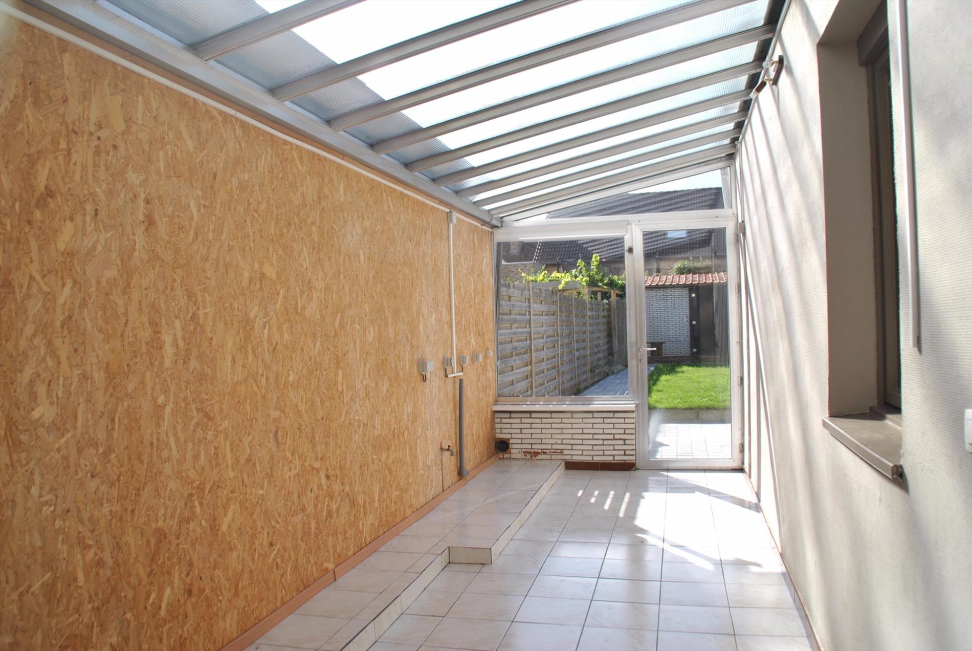 De leefruimte is ruim en klaar. De gashaard zorgt voor de gezellige toets. Aanpalend is er de keuken met daarachter de badkamer met toilet, lavabo en bad. De woning beschikt over een veranda die bereikbaar is via de living of de keuken.