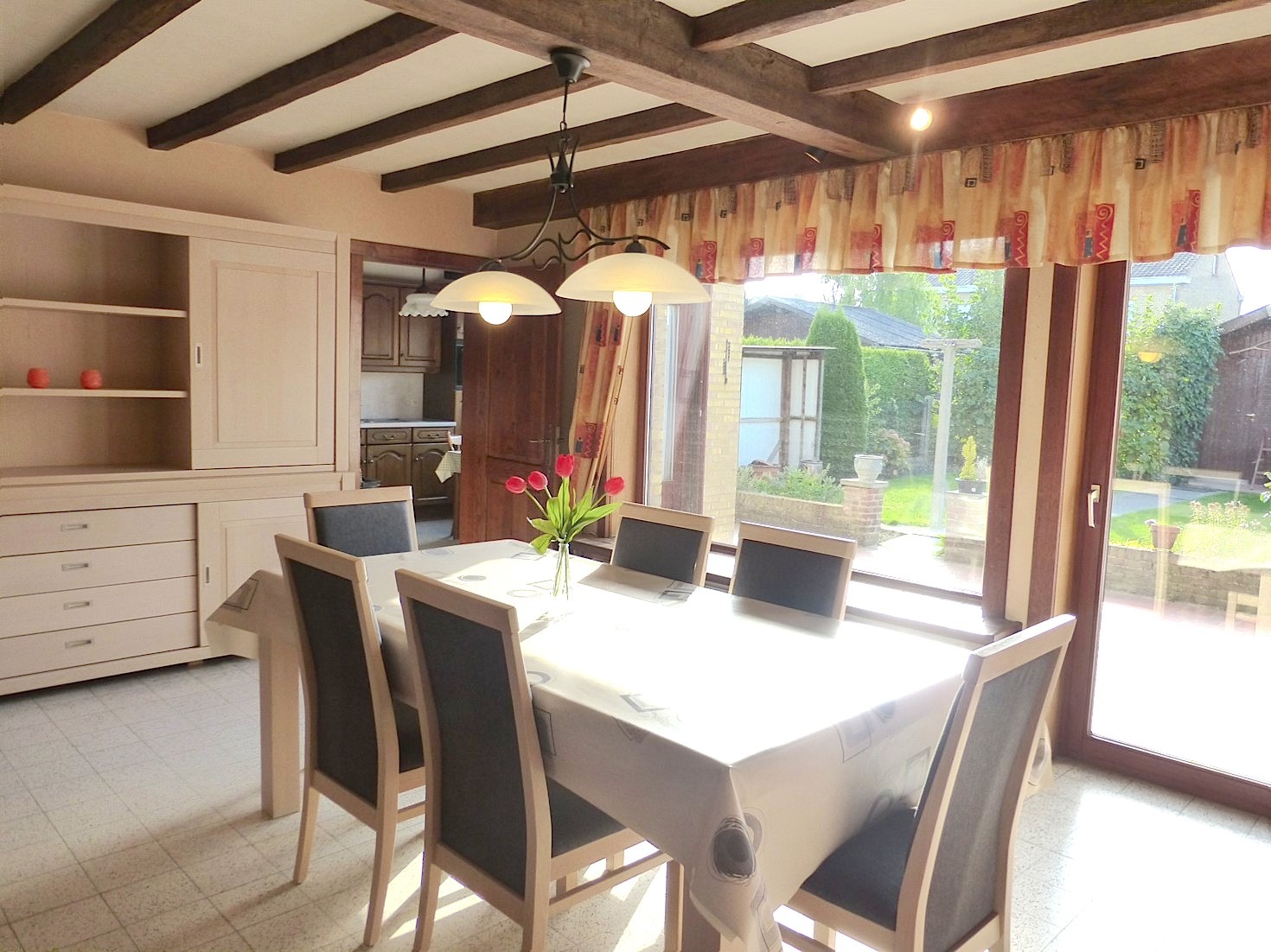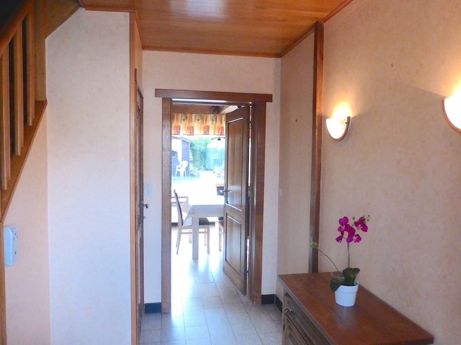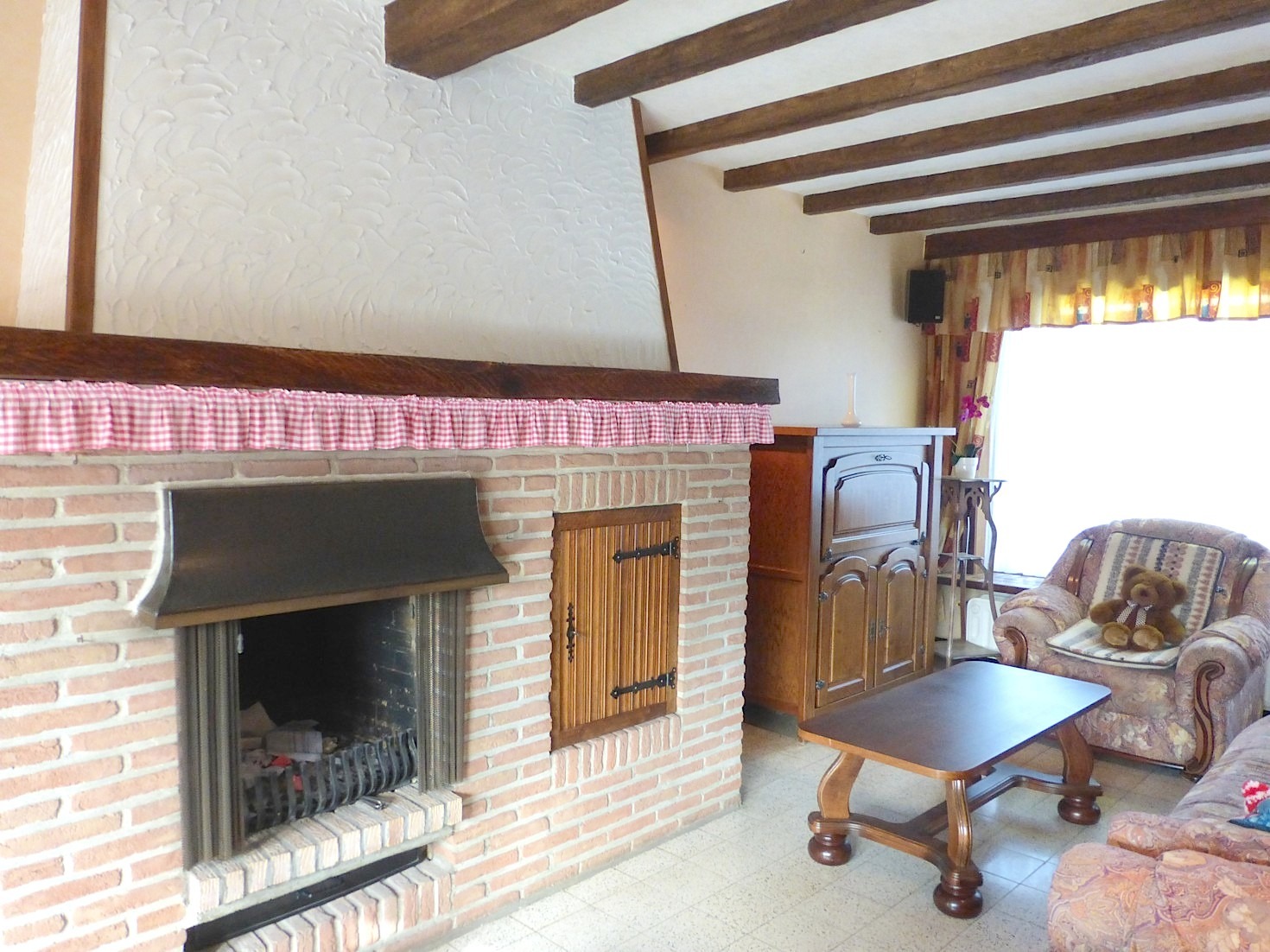 We komen de woning binnen in de hal met apart toilet. Langs de trap is heden een traplift geïnstalleerd, maar kan indien nodig weggenomen worden. De living zorgt door de L vorm, rustieke elementen en open haard voor een zeer gezellige sfeer. Aangrenzend vinden we de verzorgde keuken, welke is uitgerust met de nodige toestellen. Van hieruit kunnen we naar de leuke tuin met terras. Door de ideale zuid oriëntatie is het er gans de dag genieten in de zon!