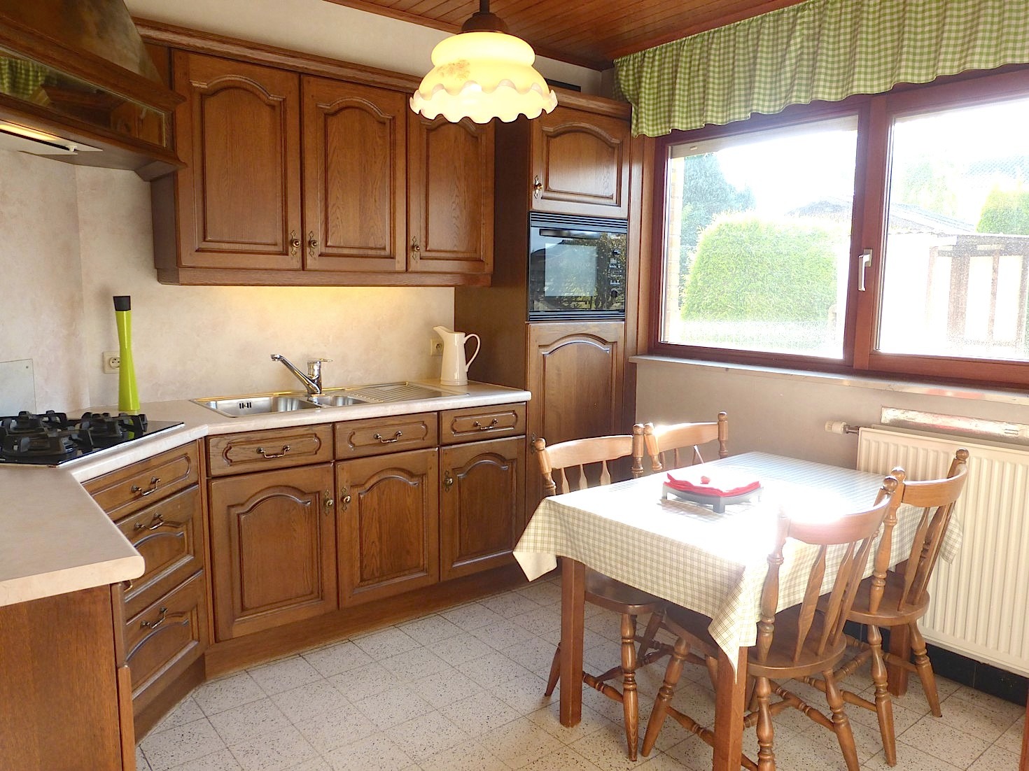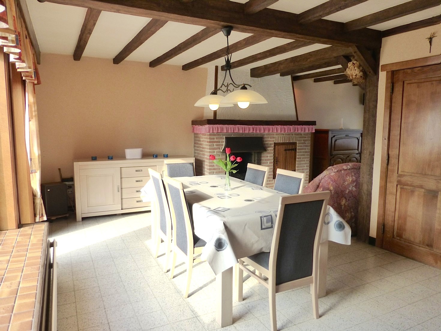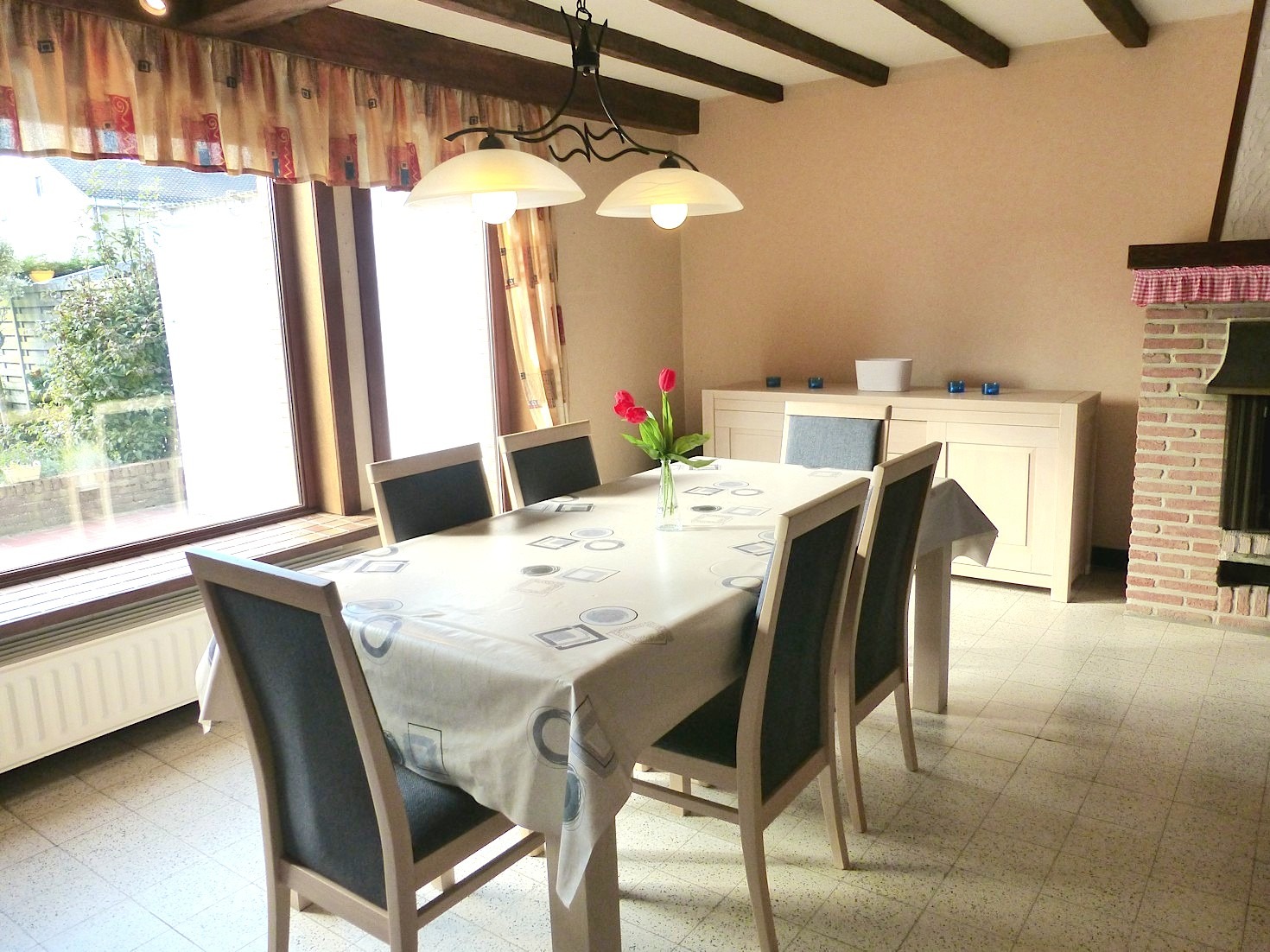 We komen de woning binnen in de hal met apart toilet. Langs de trap is heden een traplift geïnstalleerd, maar kan indien nodig weggenomen worden. De living zorgt door de L vorm, rustieke elementen en open haard voor een zeer gezellige sfeer. Aangrenzend vinden we de verzorgde keuken, welke is uitgerust met de nodige toestellen. Van hieruit kunnen we naar de leuke tuin met terras. Door de ideale zuid oriëntatie is het er gans de dag genieten in de zon!