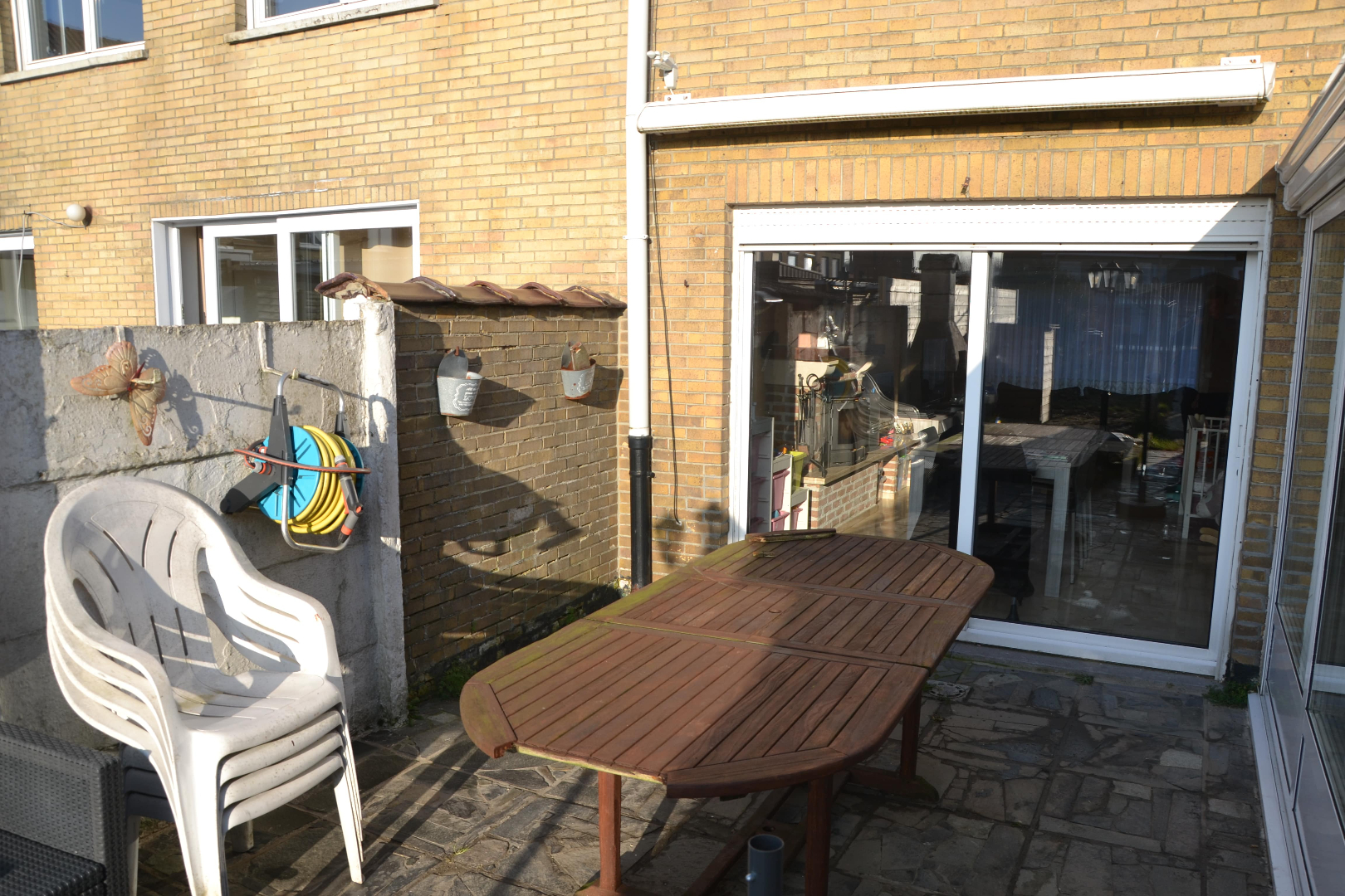 Op het gelijkvloers is er een inkomhal met apart gastentoilet, leefruimte met aparte bureelruimte, lichtrijke veranda met aansluiting op de ingerichte keuken. Achteraan is er een leuk tuintje met terras en tuinberging.