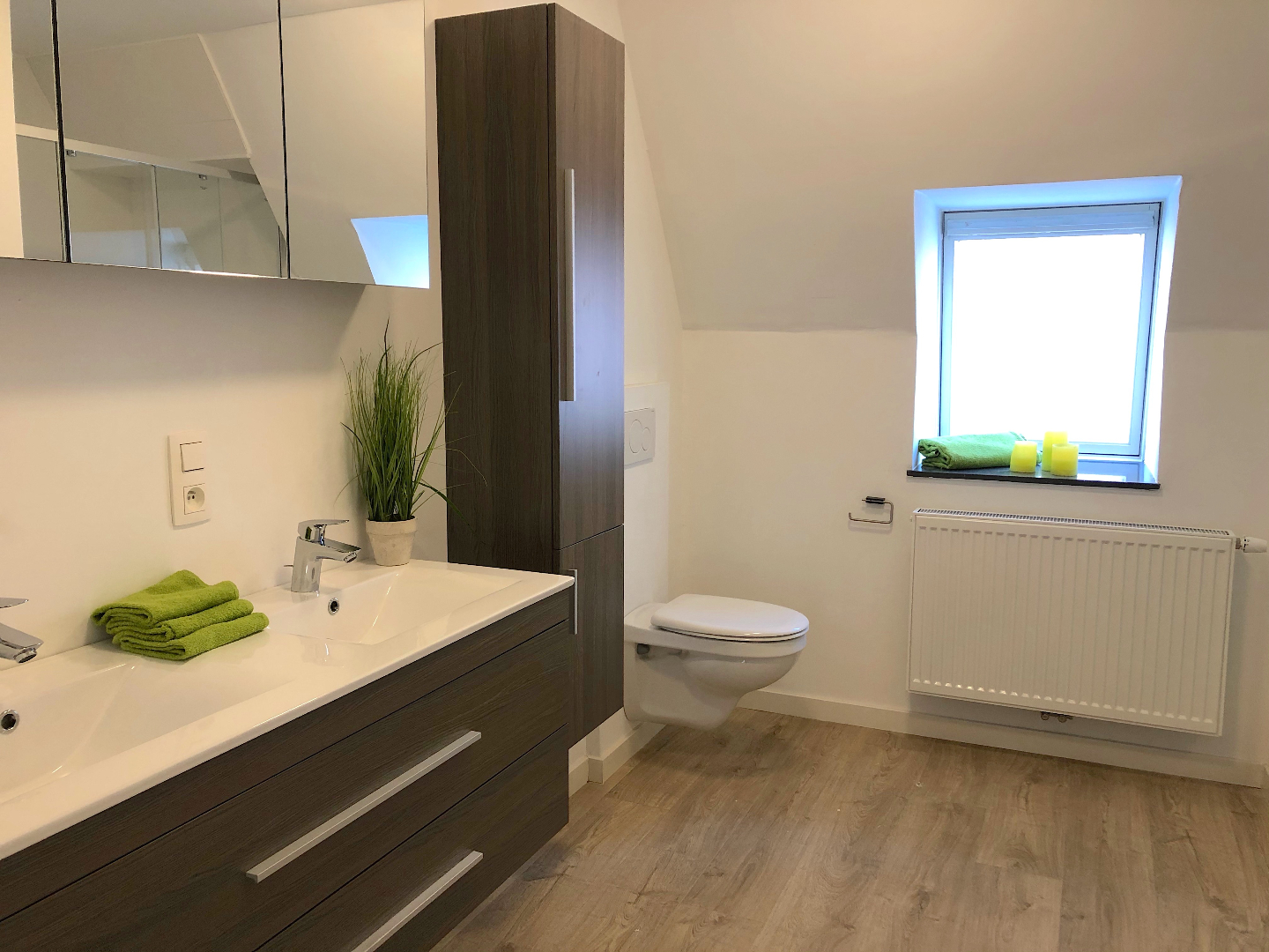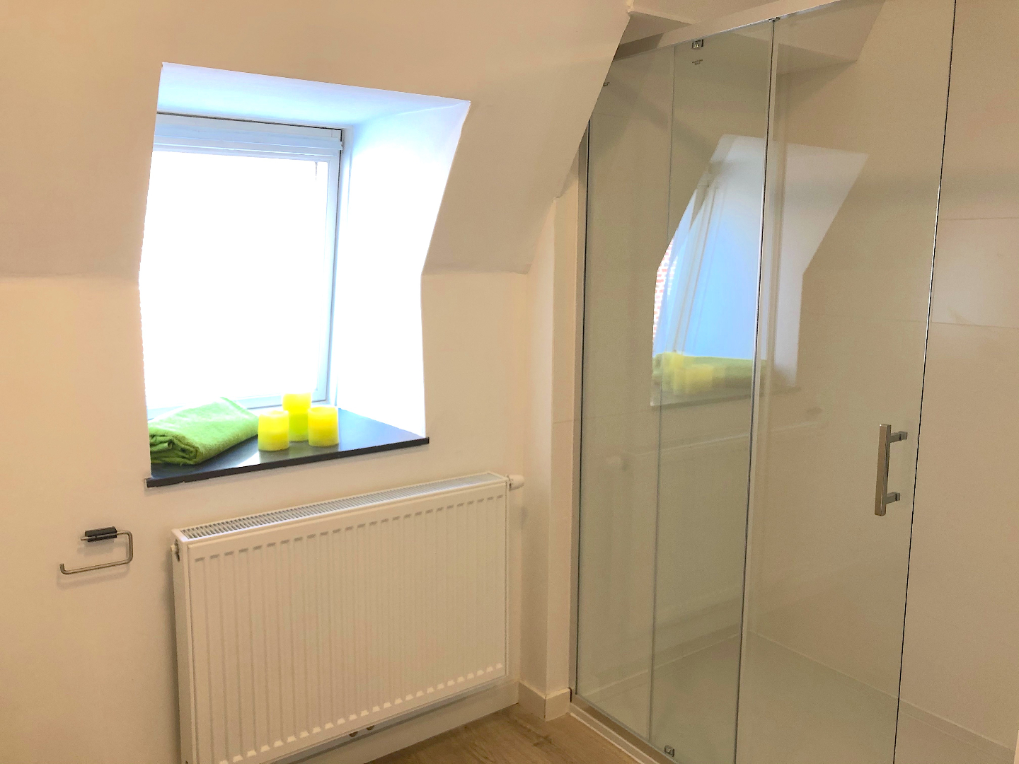 De verdieping beschikt over 2 mooie slaapkamers en een badkamer met dubbel lavabomeubel, toilet en douche.