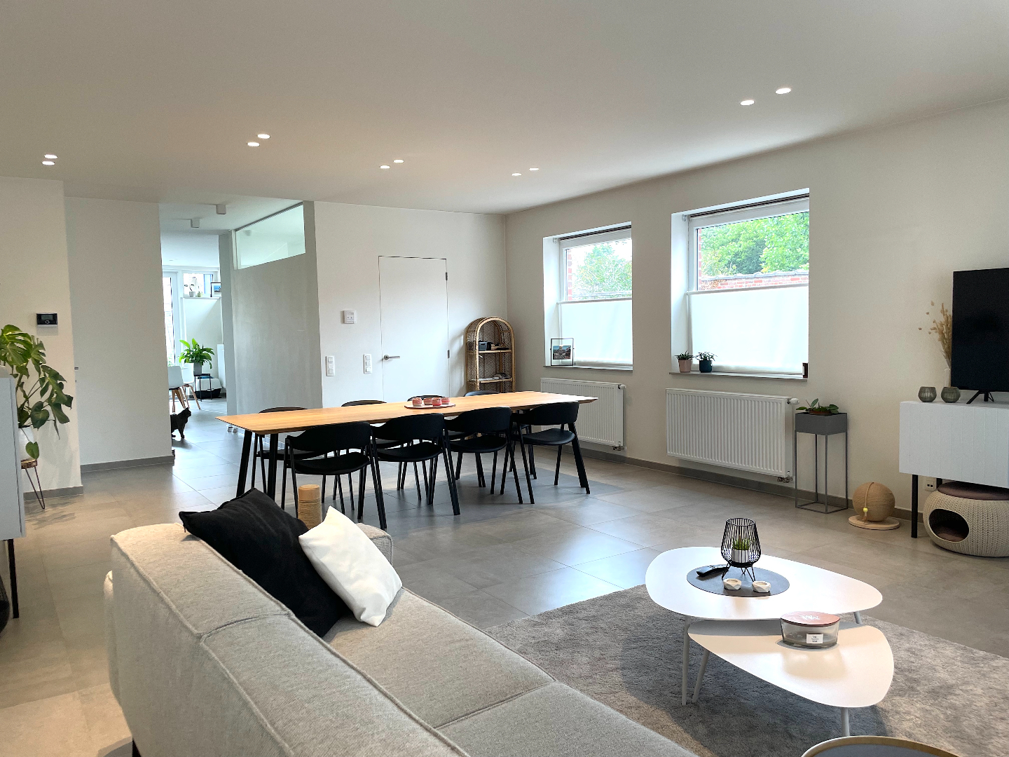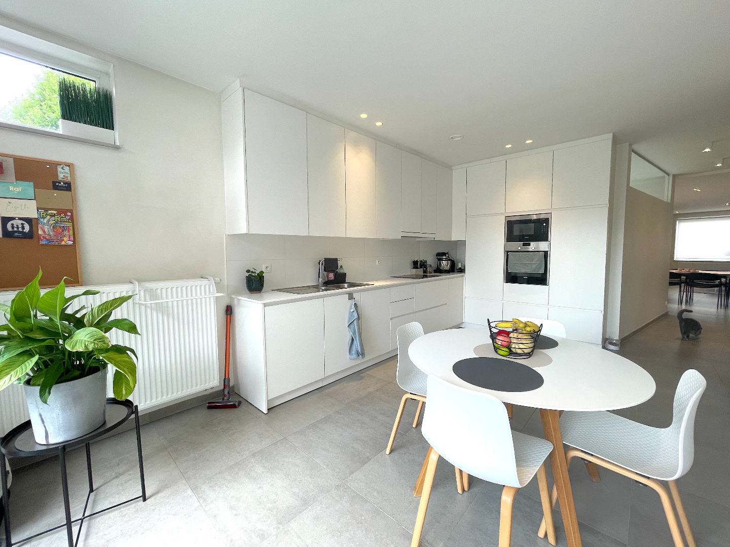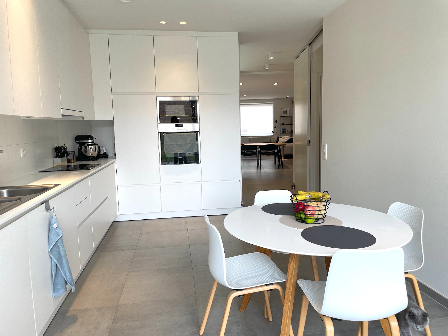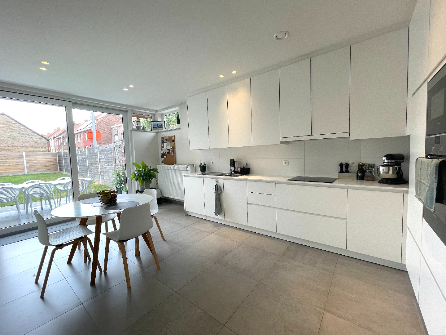 We komen binnen in een mooie inkomhal en stappen zo de gigantische leefruimte in. Deze living is uiterst aangenaam, ontzettend ruim en heel lichtrijk. De aangename, totaal ingerichte keuken bevindt zich langs de achterzijde. Van hieruit hebben we mooi zicht op de west-gerichte tuin. Het grote raam geeft u werkelijk het gevoel buiten te vertoeven.
