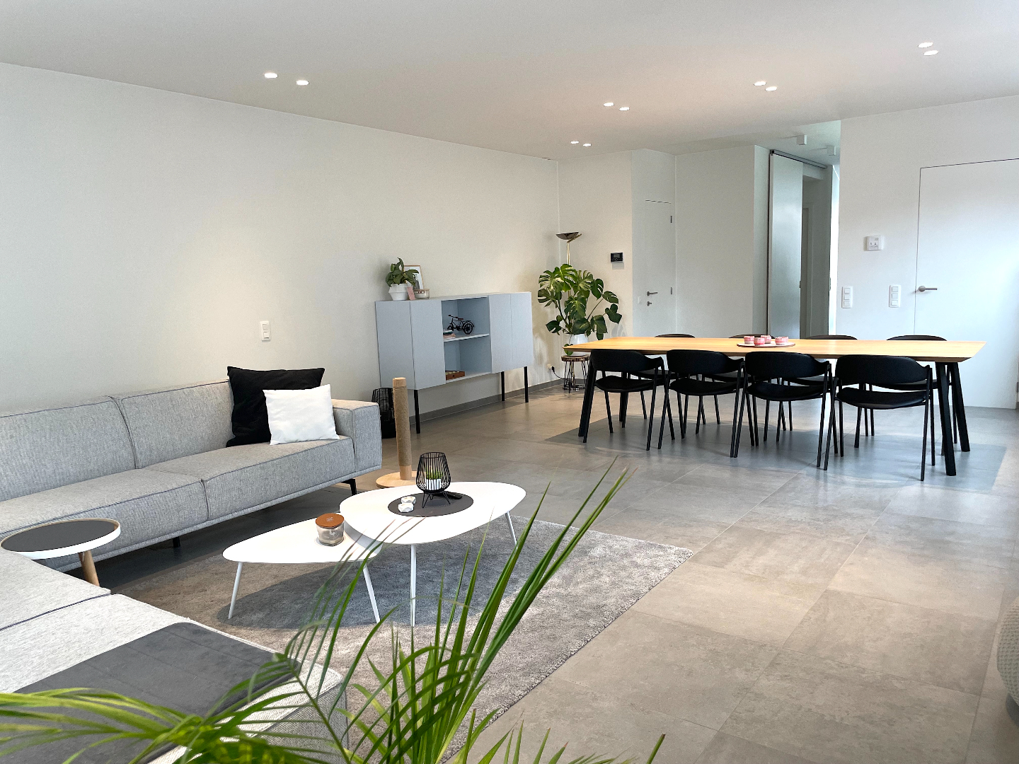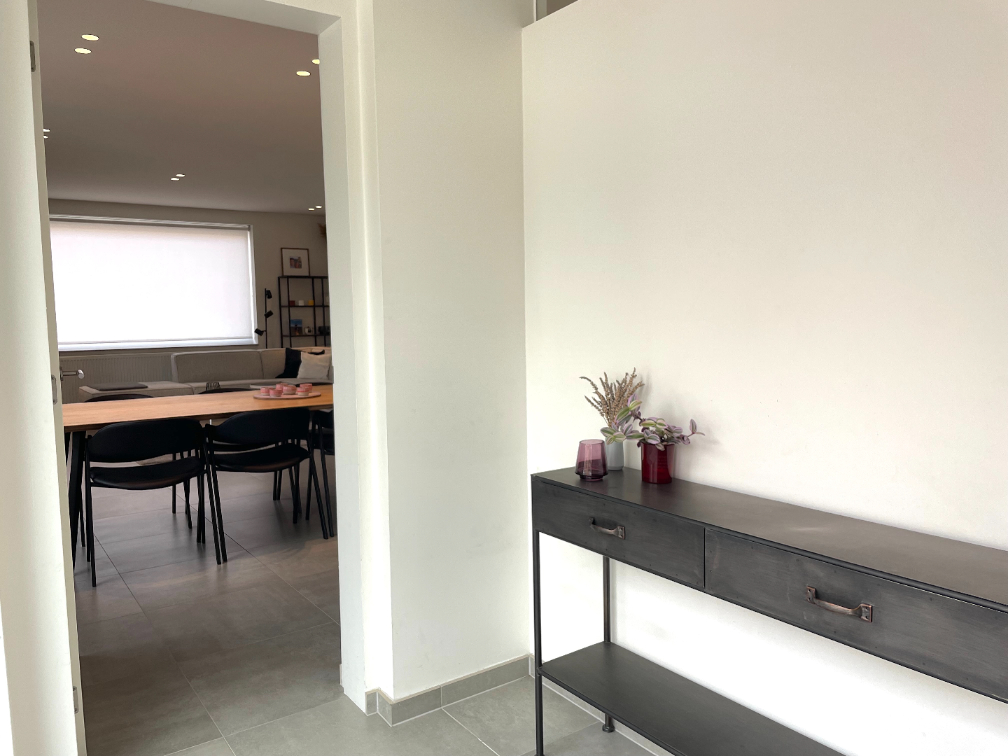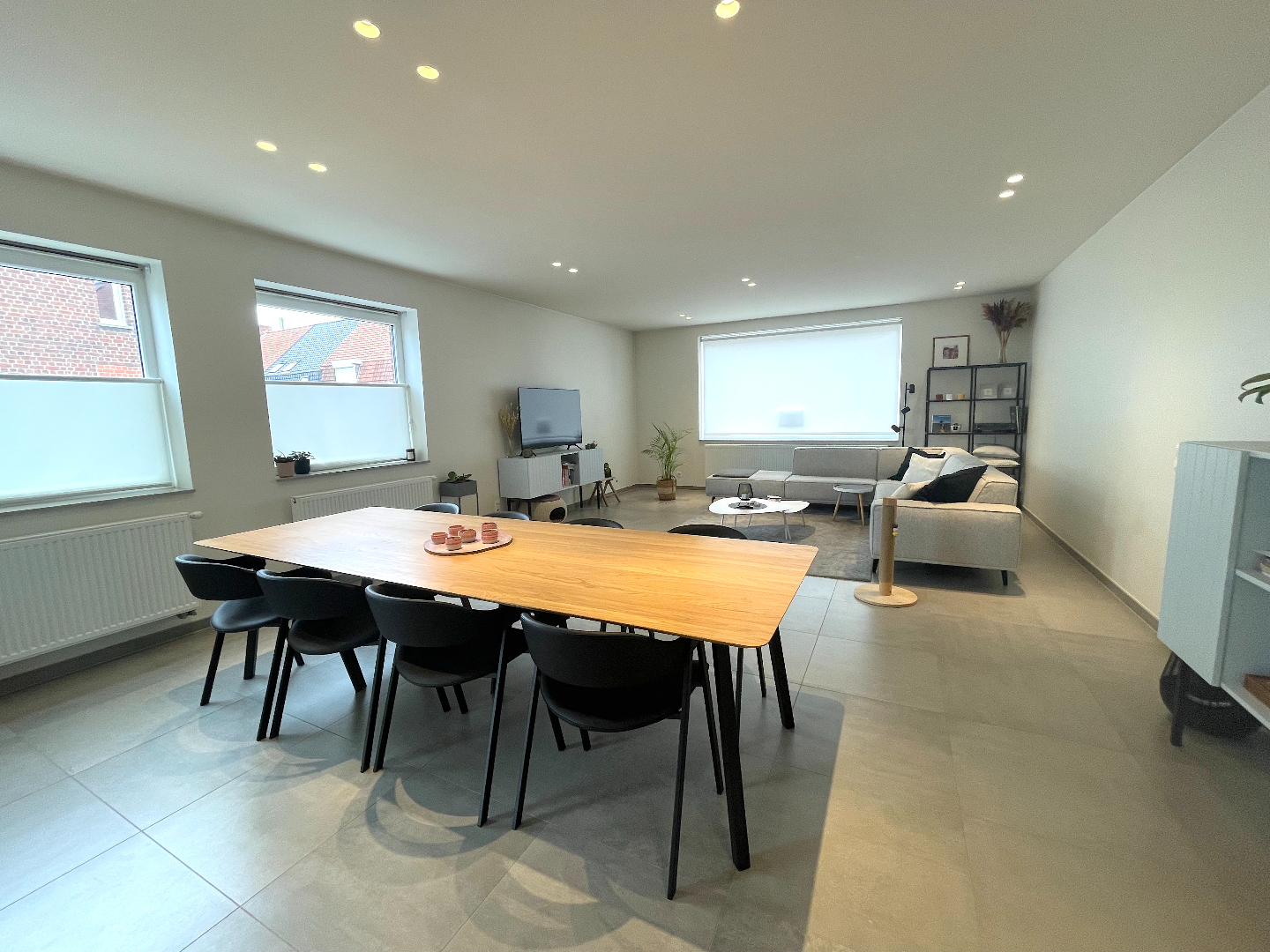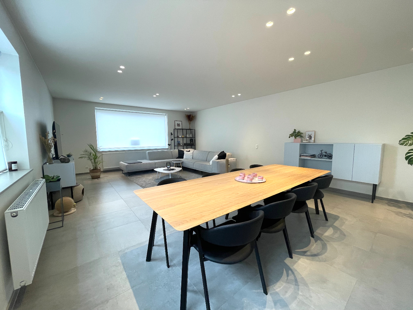We komen binnen in een mooie inkomhal en stappen zo de gigantische leefruimte in. Deze living is uiterst aangenaam, ontzettend ruim en heel lichtrijk. De aangename, totaal ingerichte keuken bevindt zich langs de achterzijde. Van hieruit hebben we mooi zicht op de west-gerichte tuin. Het grote raam geeft u werkelijk het gevoel buiten te vertoeven.