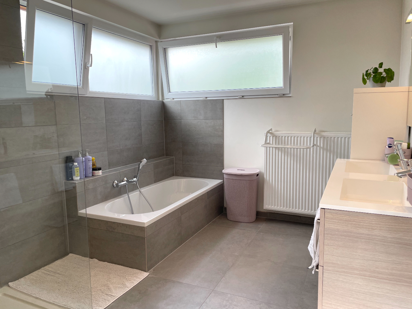 Op de eerste verdieping vinden we 2 heel grote kamers terug. De badkamer, uitgerust met een dubbele wastafel, bad en douche, laat toe te relaxen na een drukke dag. Ook op deze verdieping is er een apart toilet.