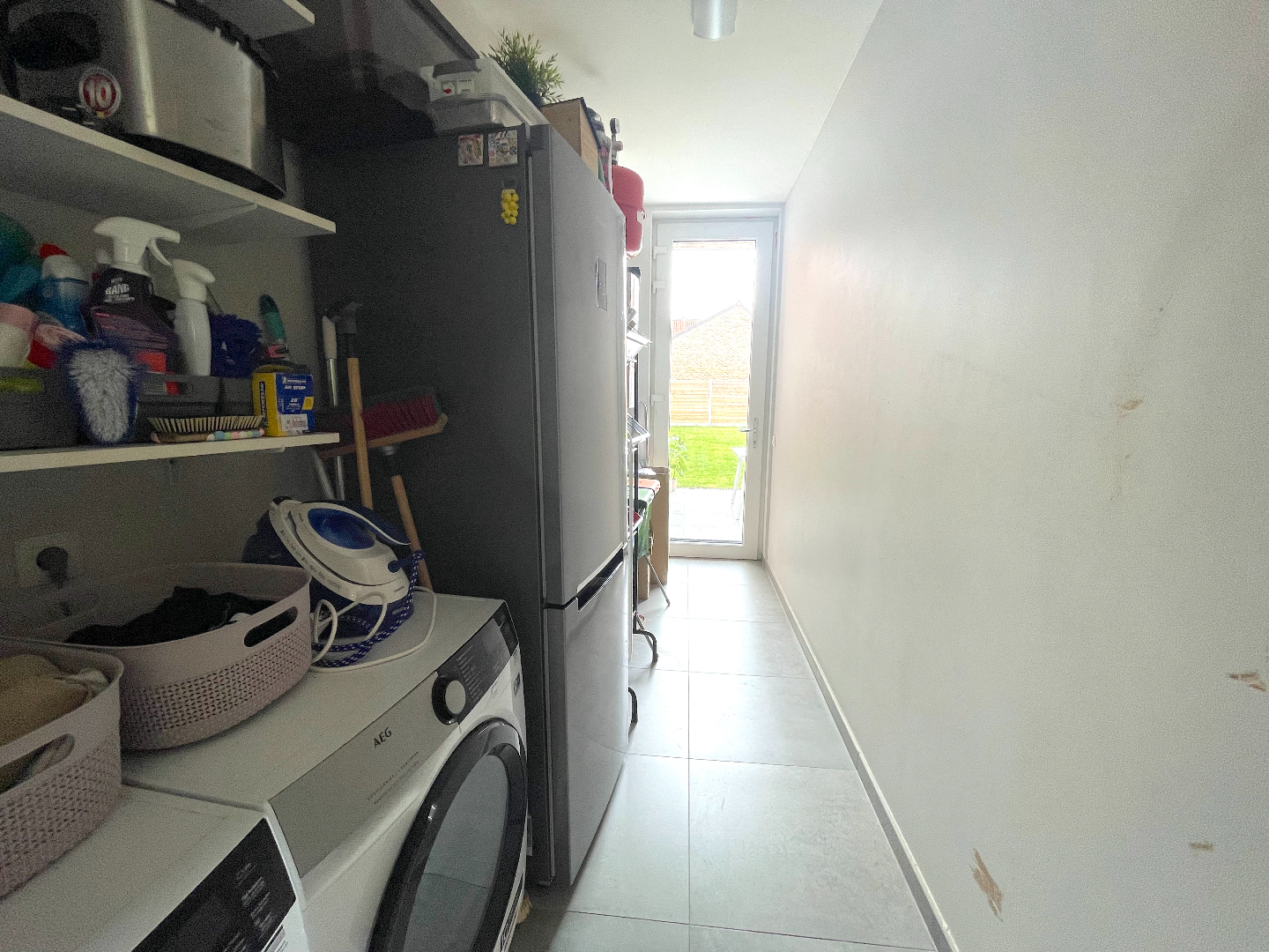 Naast de keuken bevindt zich een technische ruimte die plaats biedt aan wasmachine, droogkast, diepvriezer, …. Van hieruit heeft u ook rechtstreeks toegang tot de tuin.