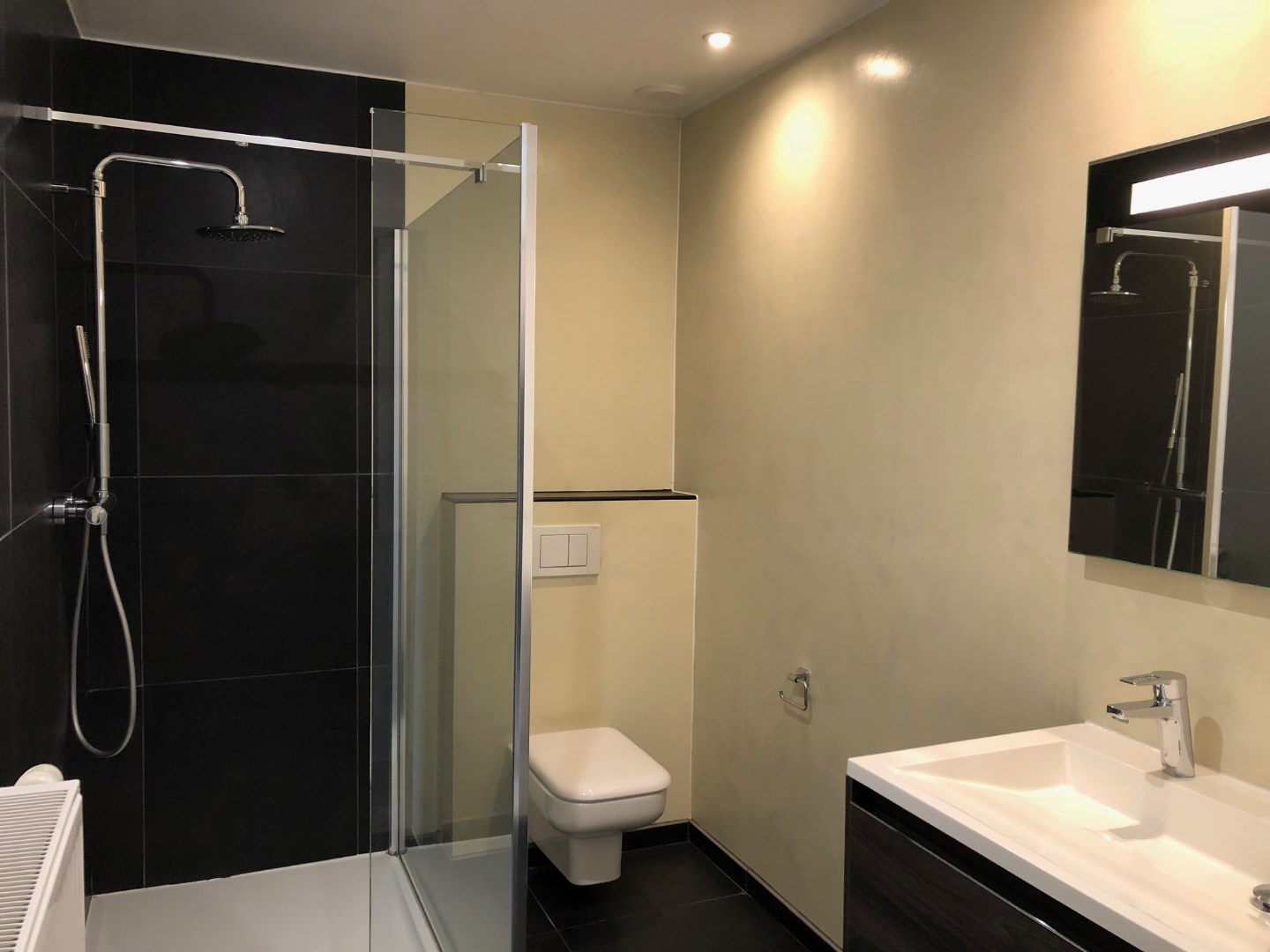 De 1e verdieping beschikt over een badkamer (met lavabomeubel, toilet en inloopdouche), 1 grote slaapkamer en een kleinere kamer (geschikt als bureau of babykamer). Via een vaste trap kunnen we naar de geïsoleerde bergzolder.