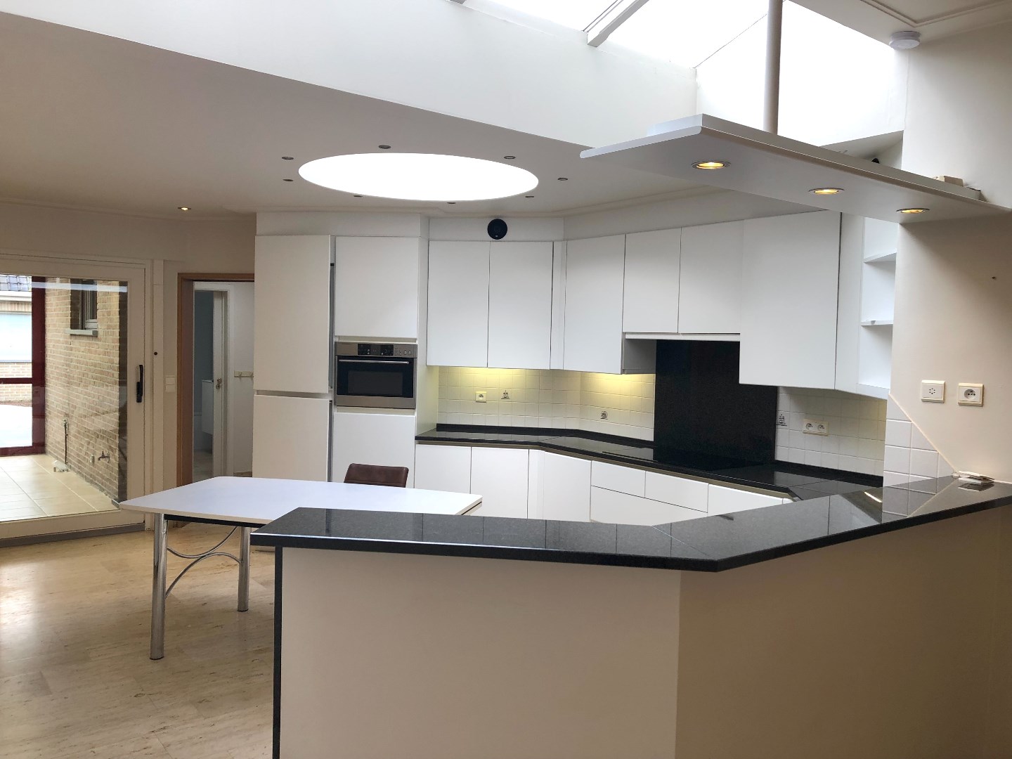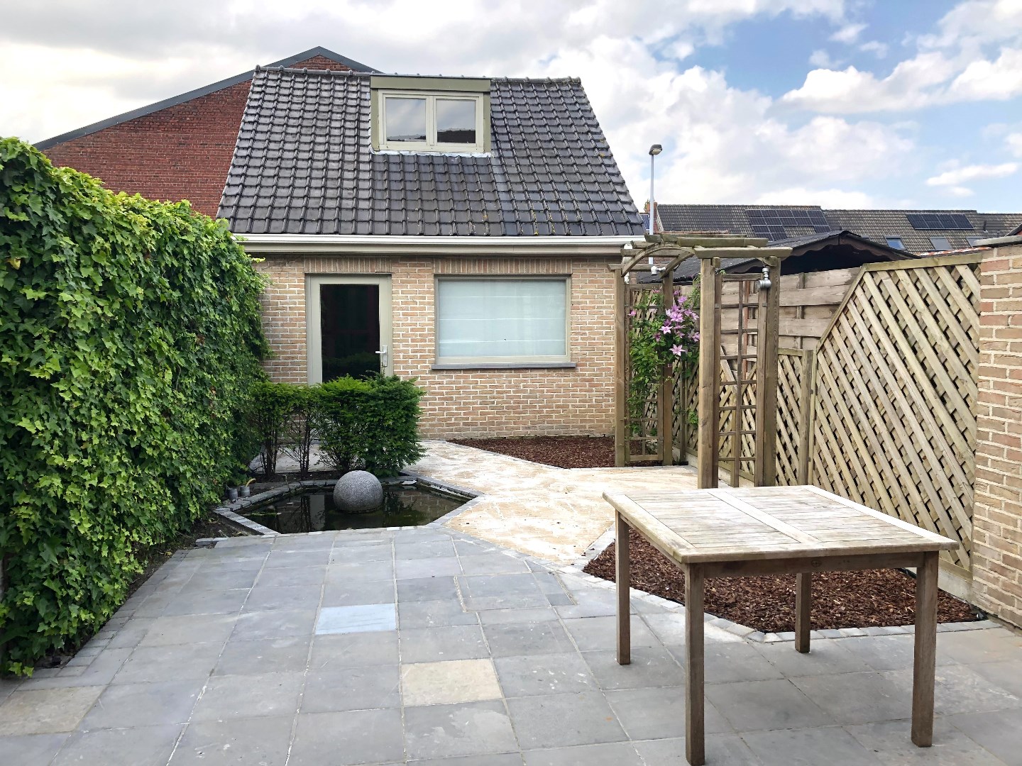 Via het voortuintje komen we de woonst binnen in de hal. De living is vooraan gelegen en gaat over in de open keuken. Deze is volledig uitgerust en voorzien van veel kasten. Aangrenzend is er een leuke veranda die ons brengt tot het tuintje. Deze is aangelegd met een vijver en bijna volledig verhard. Dit vergt dus weinig onderhoud.