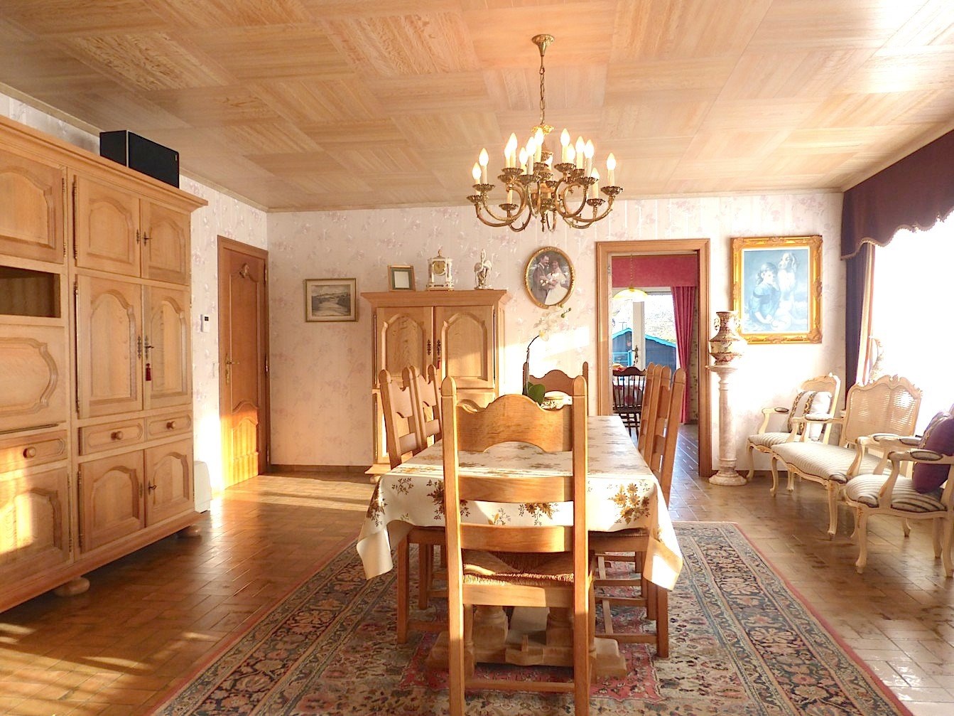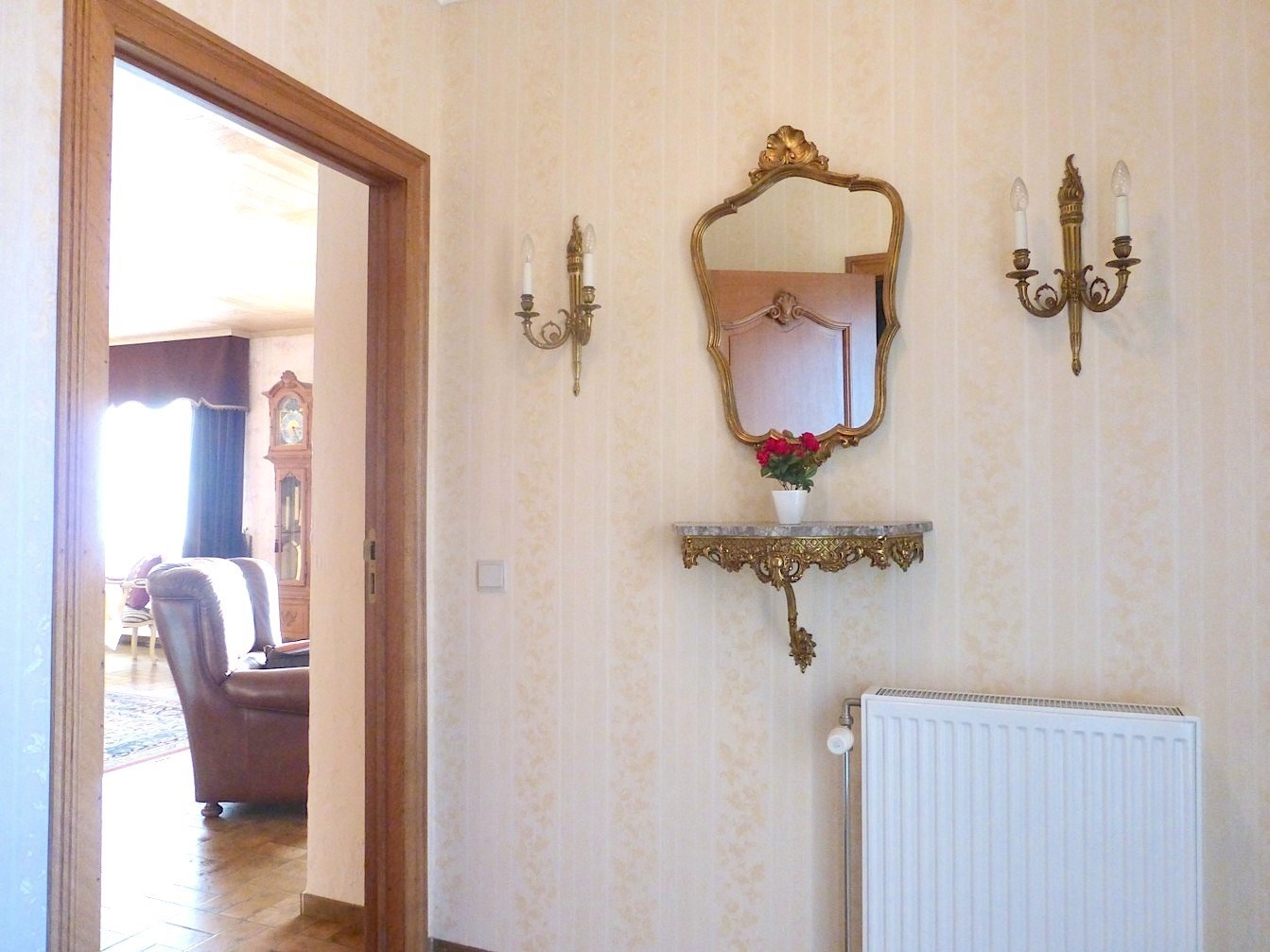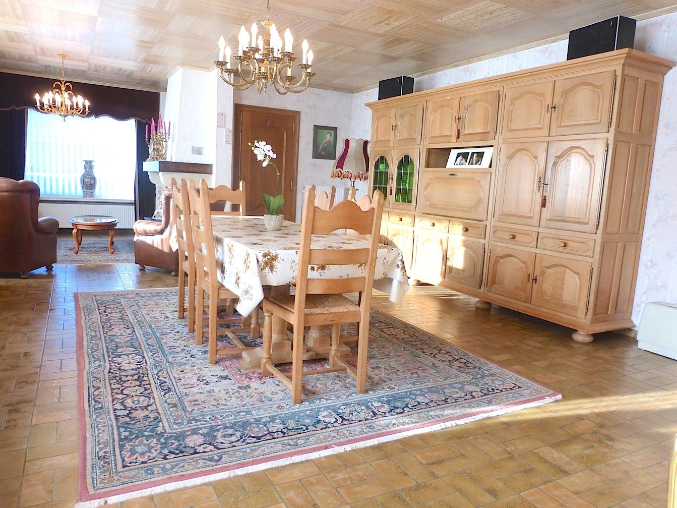 We komen de woning binnen via de hal die toegang verschaft tot de garage en de grote living. Deze is gelegen op de hoek, en geniet door de vele ramen van veel licht. Ook de mooie open haard maakt het geheel tot een gezellige leefruimte.