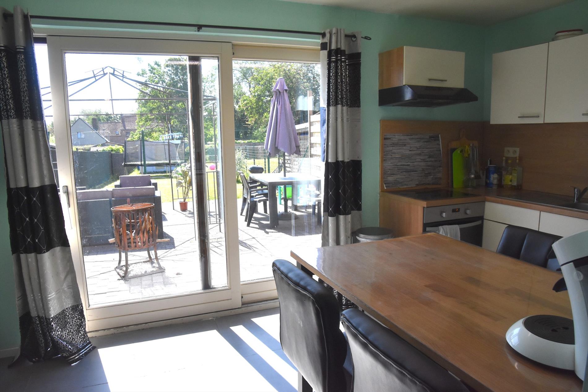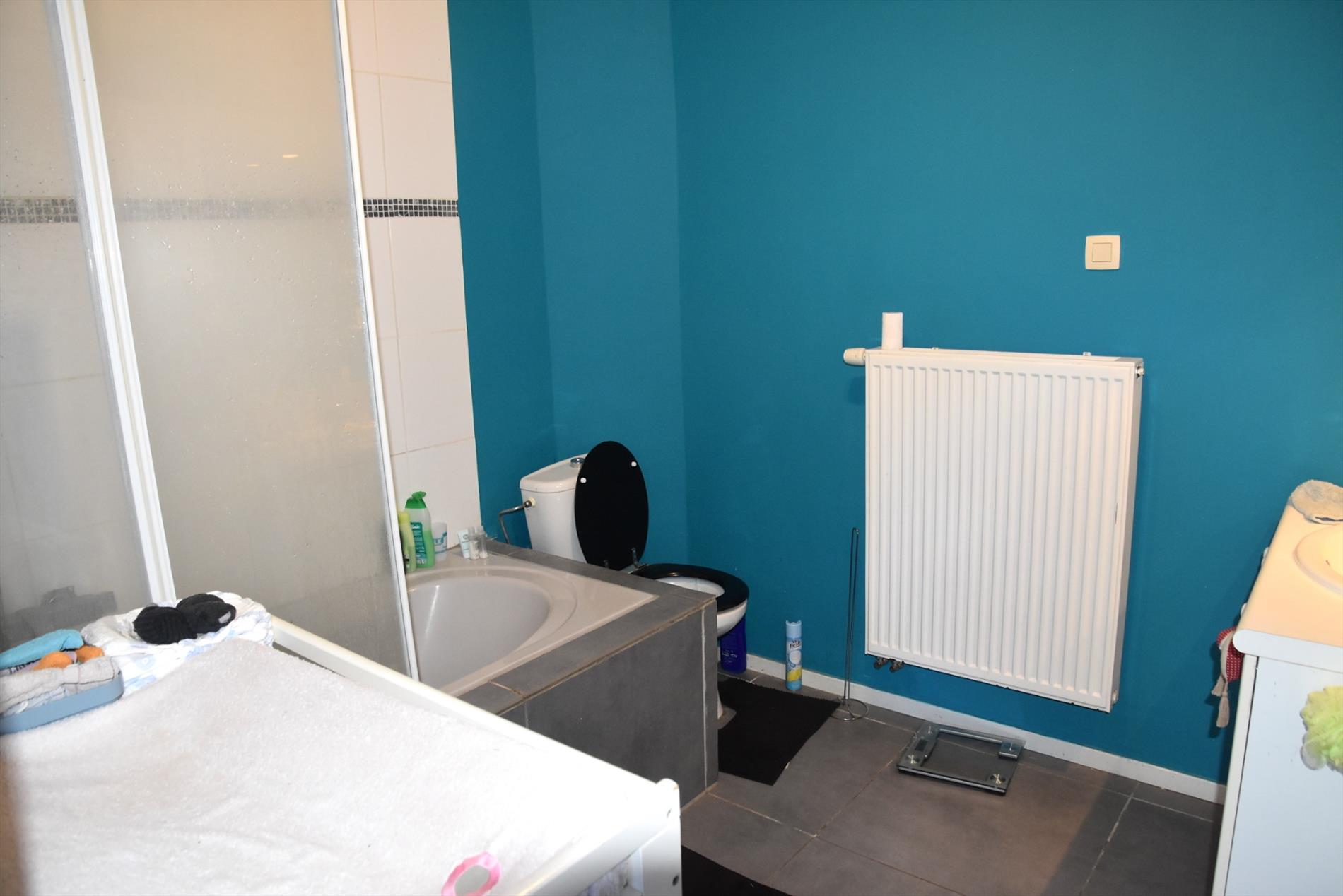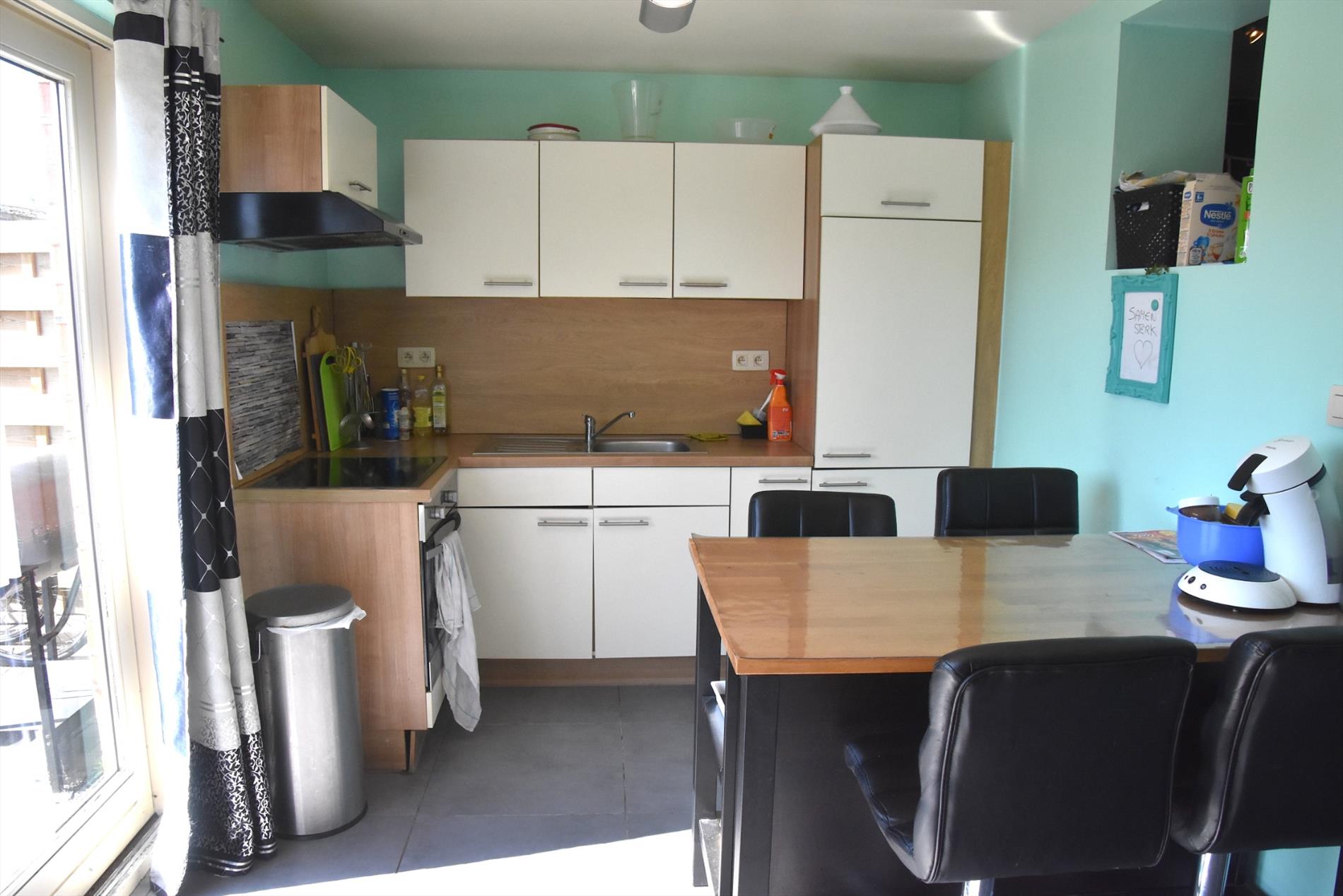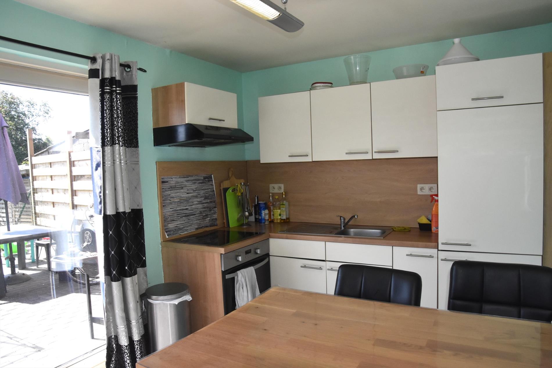 We komen binnen in de leefruimte van deze knusse woning. Palend hieraan vinden we de badkamer terug. Er is hier een toilet, lavabomeubel en bad-/douchecombinatie. De keuken achteraan heeft zicht op de grote en zonrijke tuin. Tijdens het koken, kan u hier genieten van de groene rust. Naast de keuken ligt een handige berging waar plaats is voor een wasmachine en droogkast. Boven zijn er 2 ruime slaapkamers.