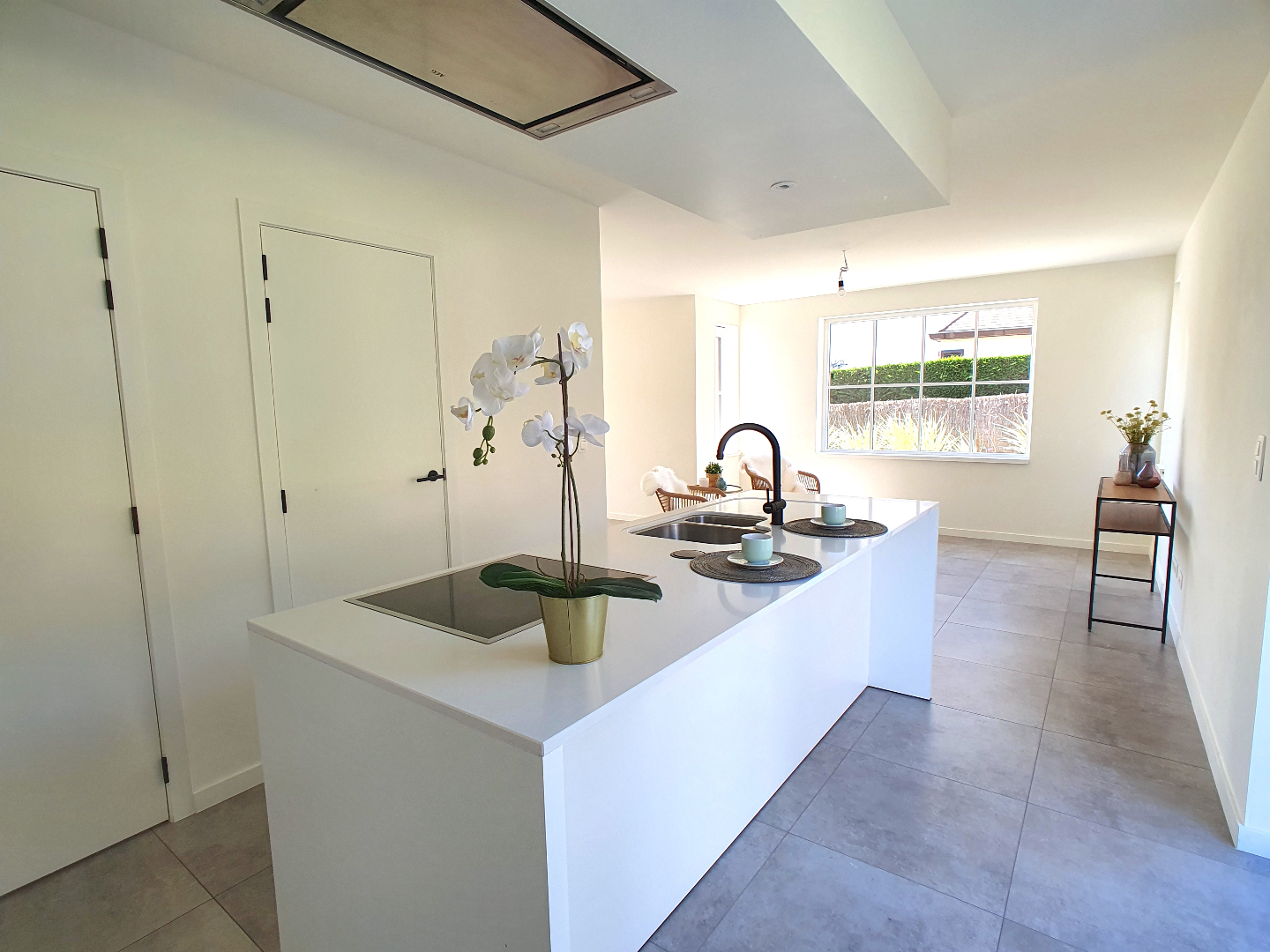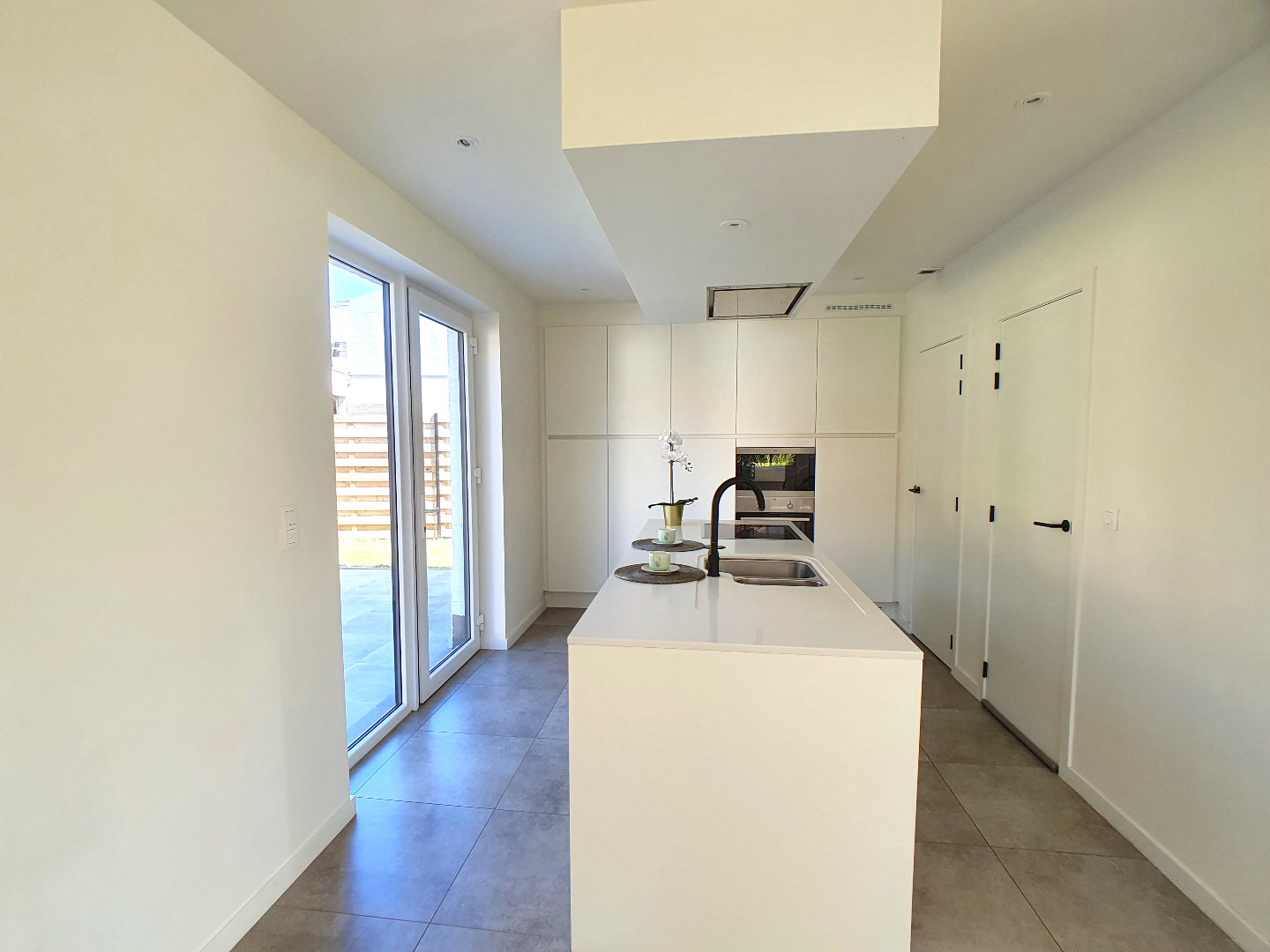 Via de leuke voortuin komen we bij de voordeur. In de hal is er een apart gastentoilet en via de glazen deur betreden we de living met open keuken. Deze is voorzien van veel kasten en alle nodige toestellen die een moderne keuken nodig heeft. Aansluitend is er een handige berging.