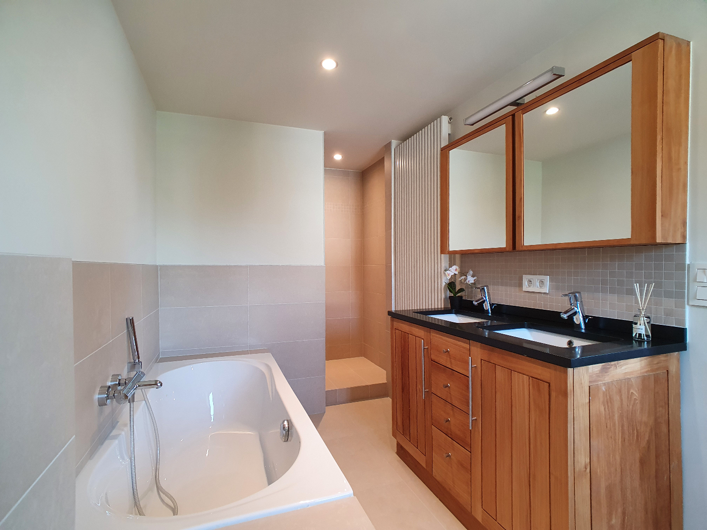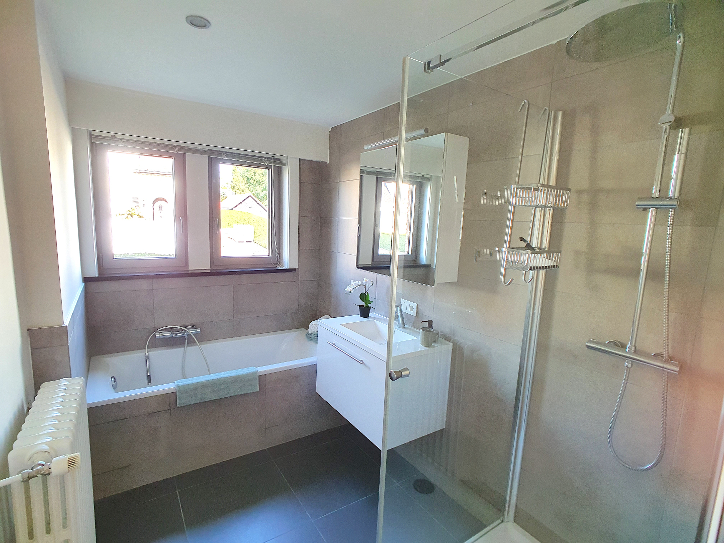Op het gelijkvloers hebben we nog een berging en een badkamer met douche, ligbad en lavabomeubel.