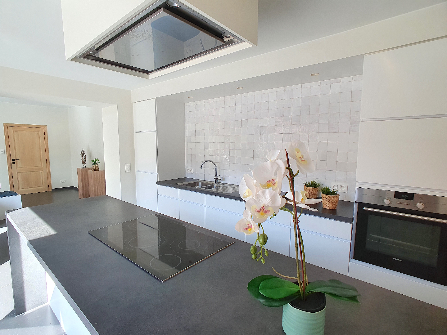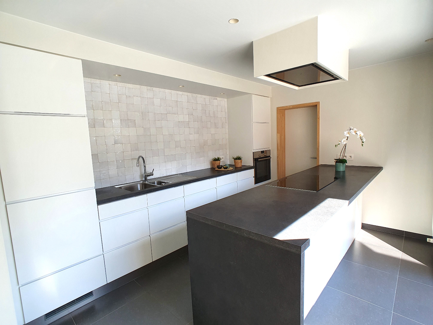 Via de voortuin met grote oprit komen we aan de voordeur. De mooie open traphal is voorzien van een apart gastentoilet. Vanuit de hal kunnen we naar een ruim bureel en naar de leefruimte. Door de vele ramen is het er zeer lichtrijk en hebben we zicht op de groene omgeving. De mooie open moderne keuken is voorzien van alle toestellen.